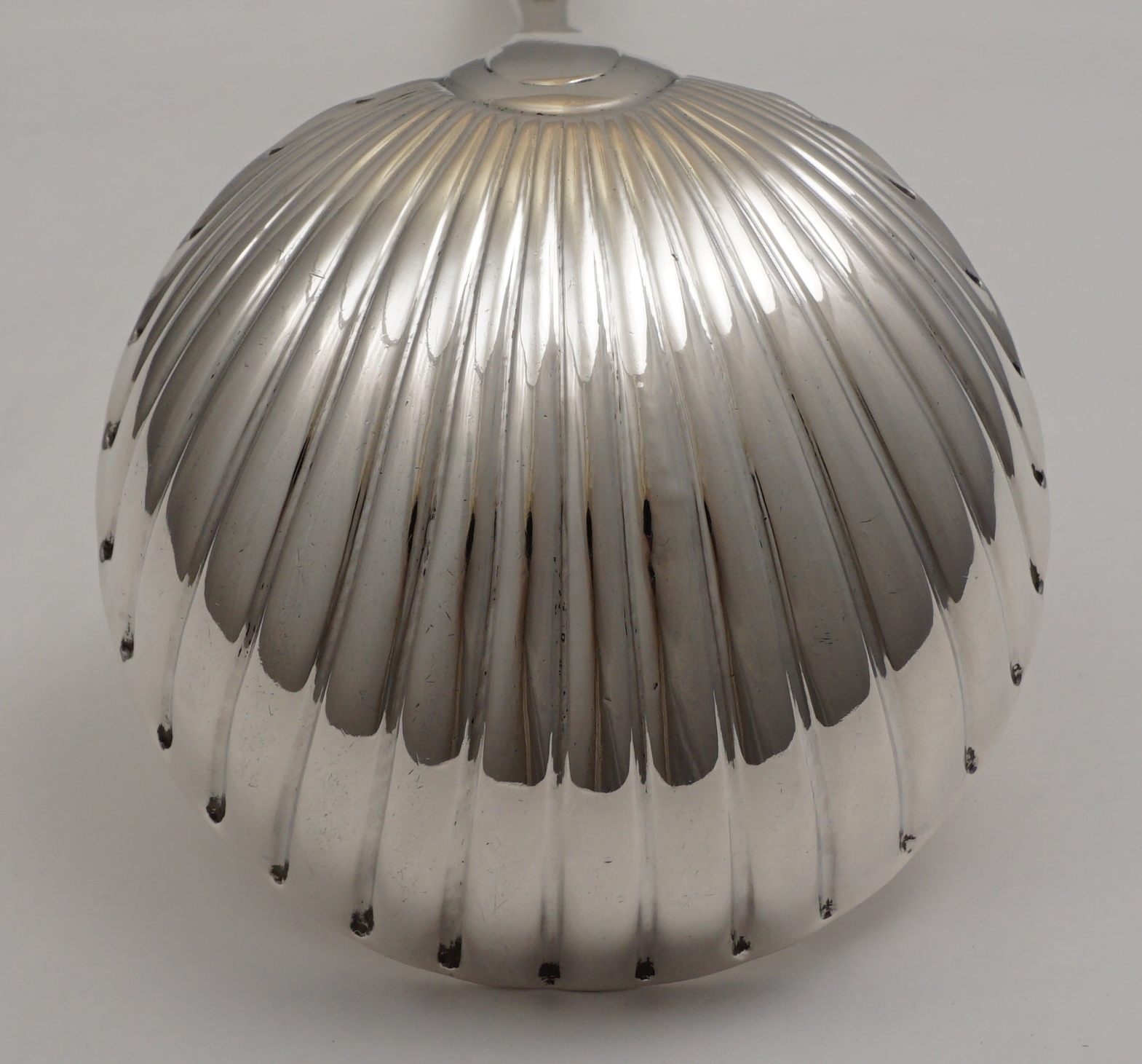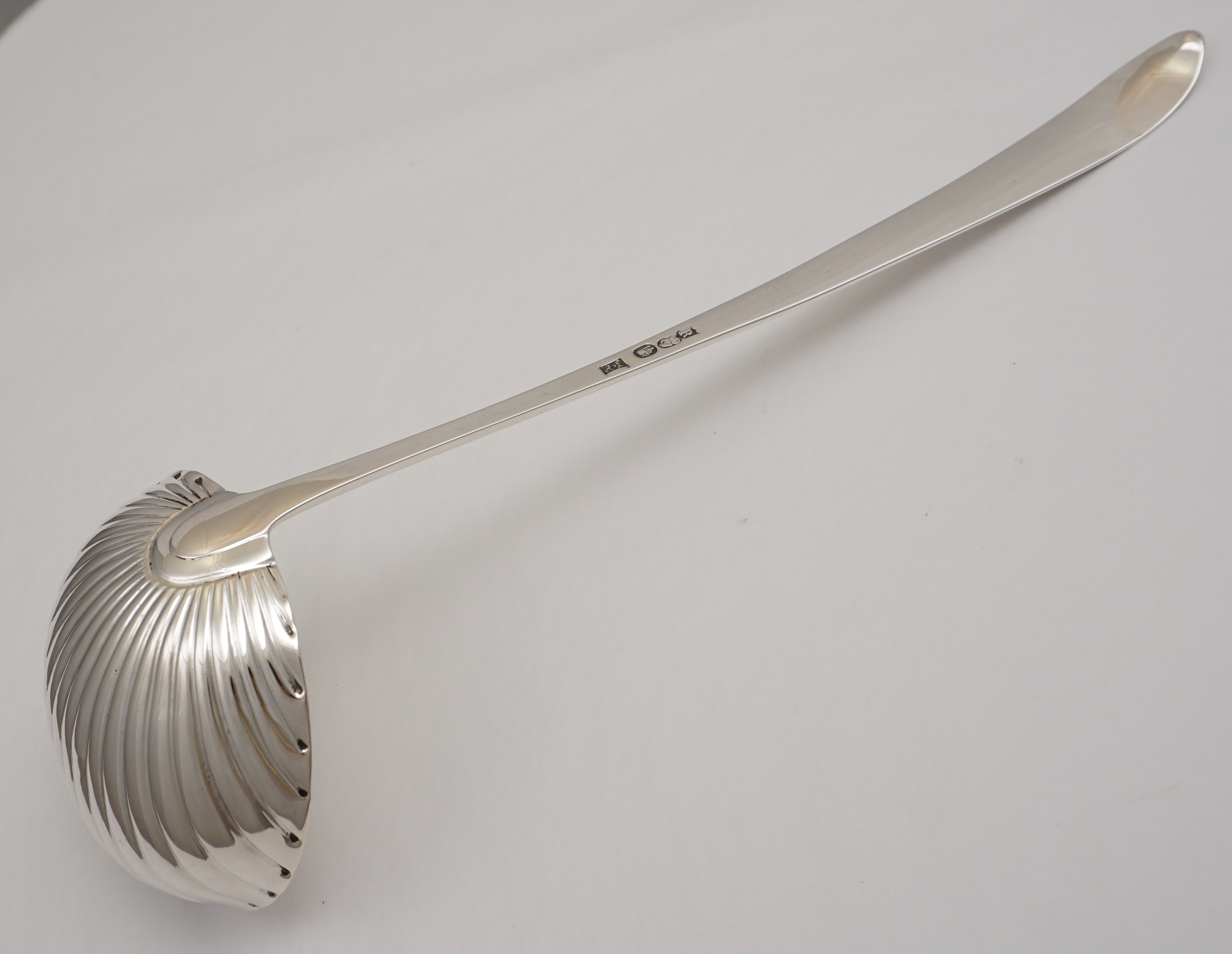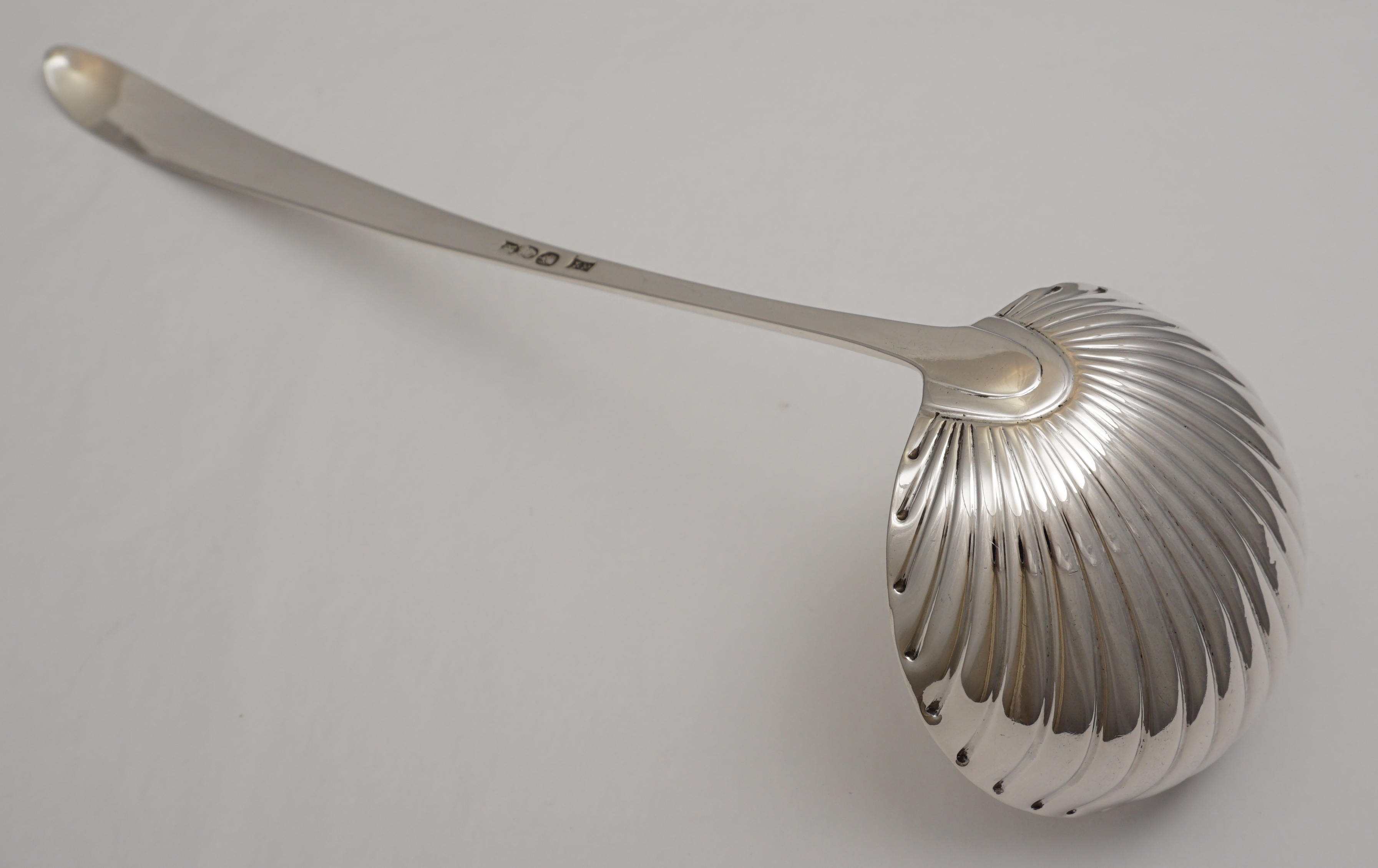 DESCRIPTION | Superb antique Georgian solid sterling silver Bright-cut Edge Irish pointed Old English pattern soup ladle with a frontal crest engraving within a bright-cut cartouche, shell bowl and beautiful hallmarks. |