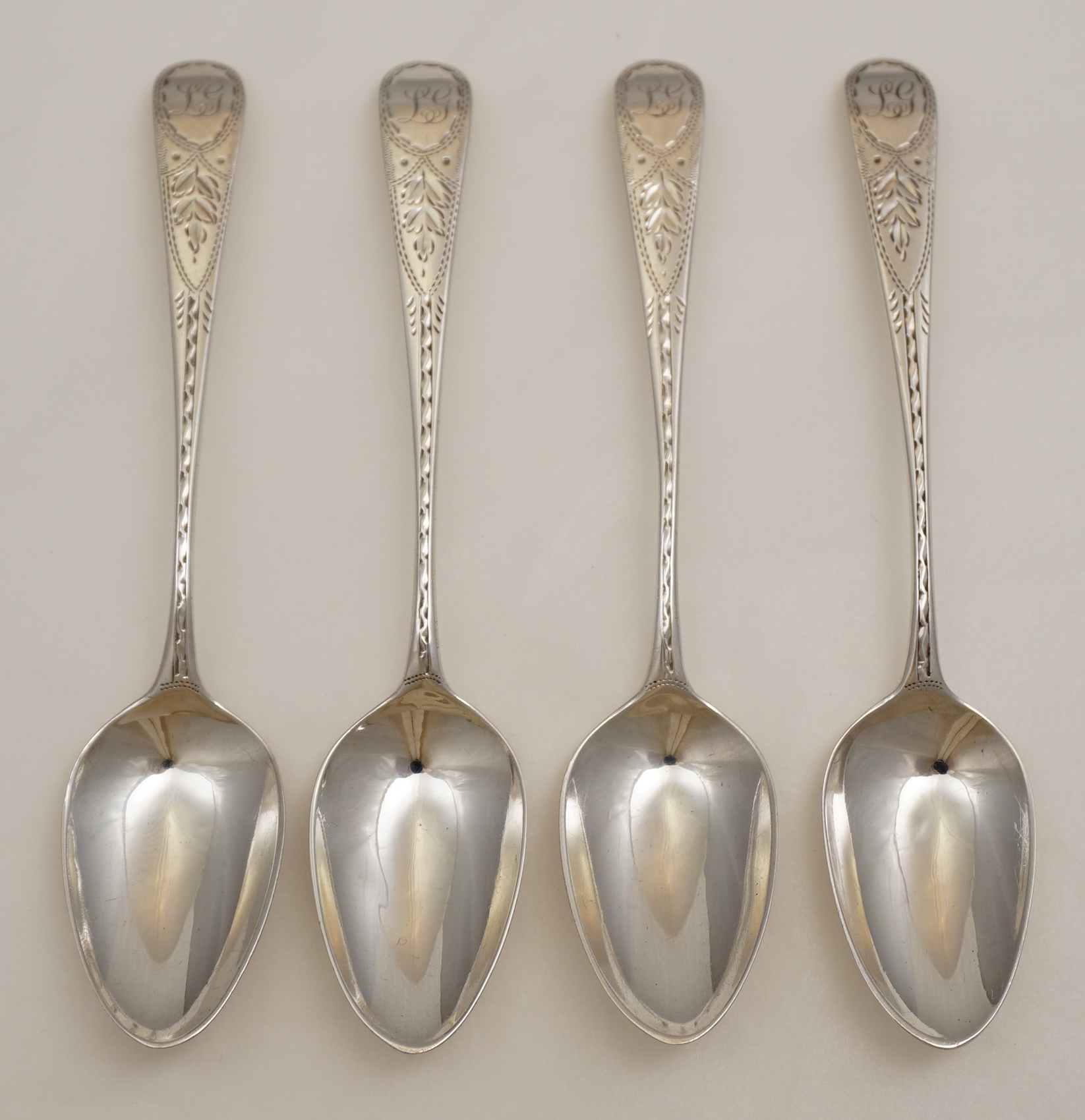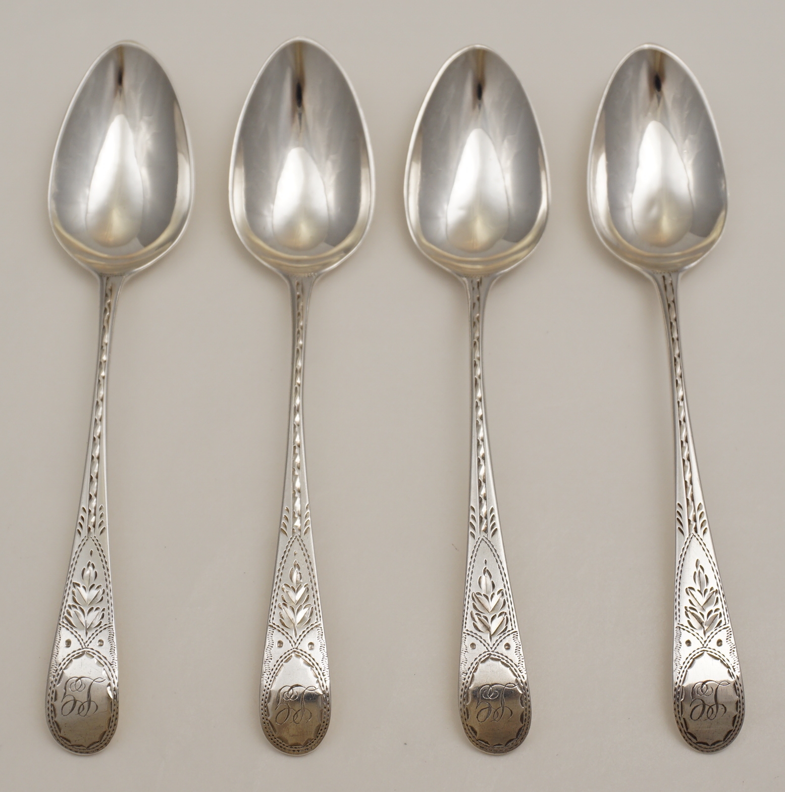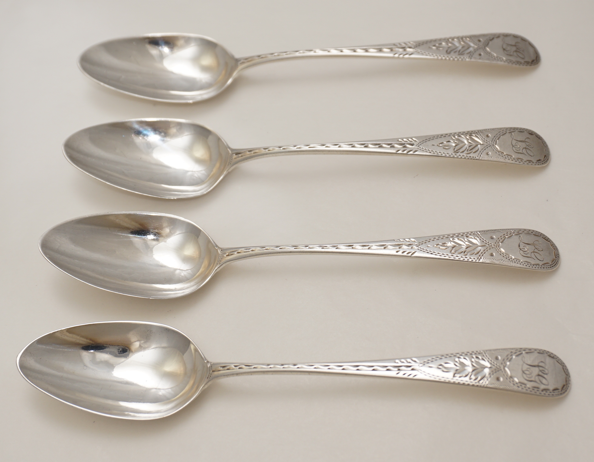 DESCRIPTION | Scarce set of four antique English Georgian solid sterling silver bright-cut Old English pattern teaspoons with a frontal monogram engraving. |