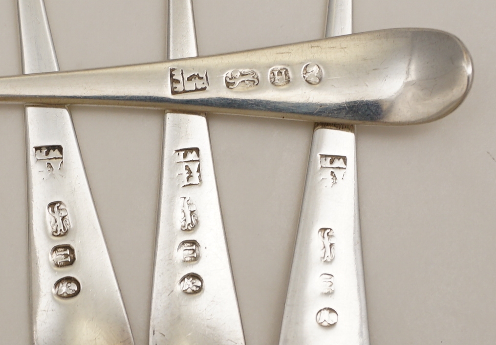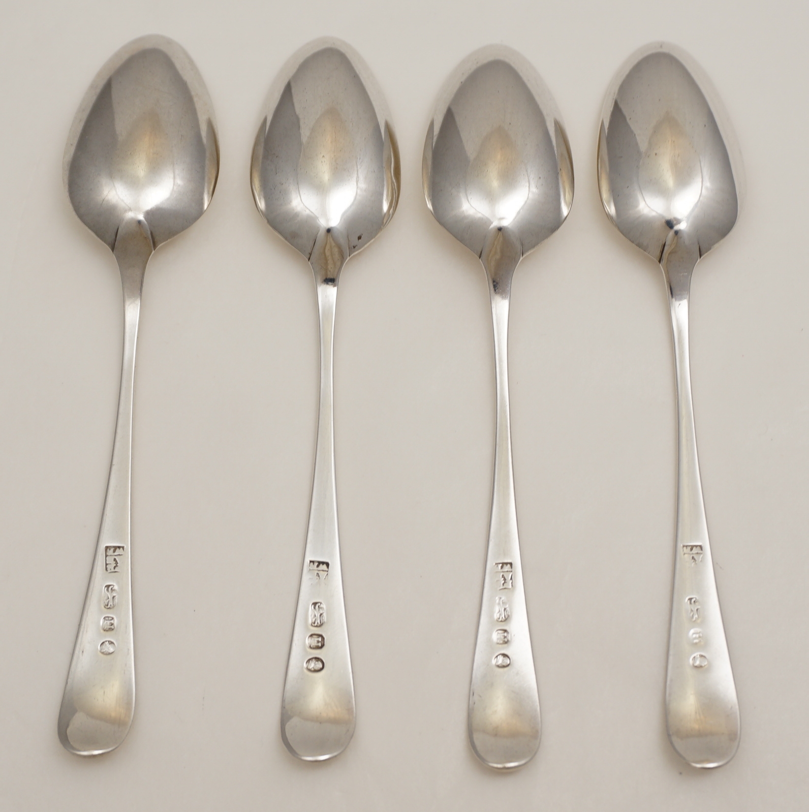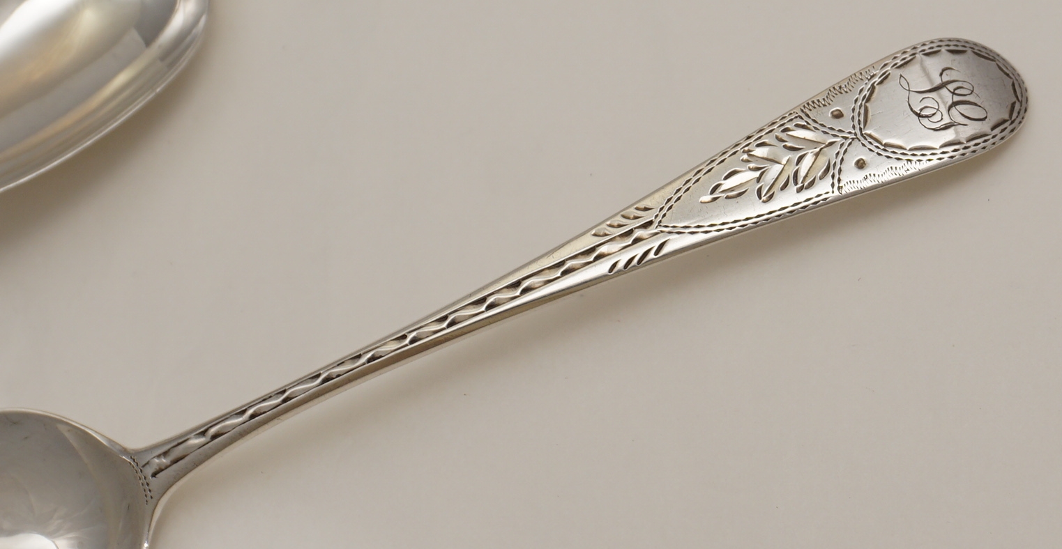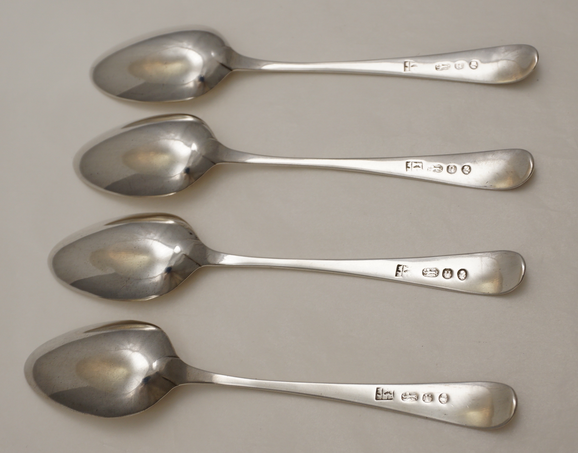 DESCRIPTION | Scarce set of four antique English Georgian solid sterling silver bright-cut Old English pattern teaspoons with a frontal monogram engraving. |