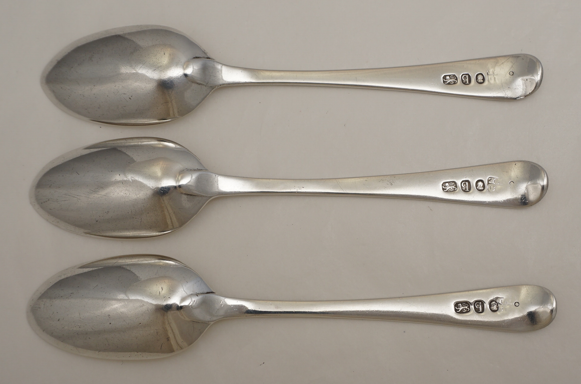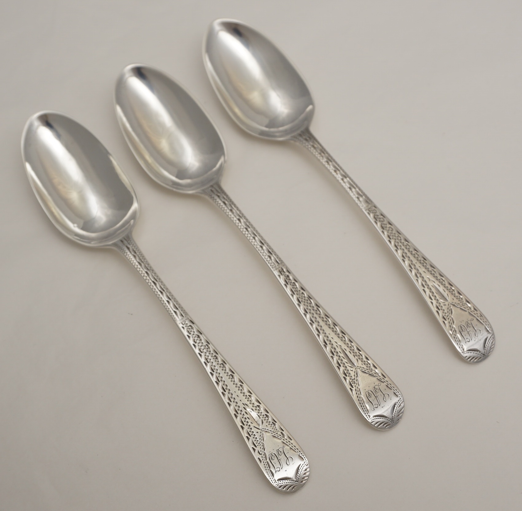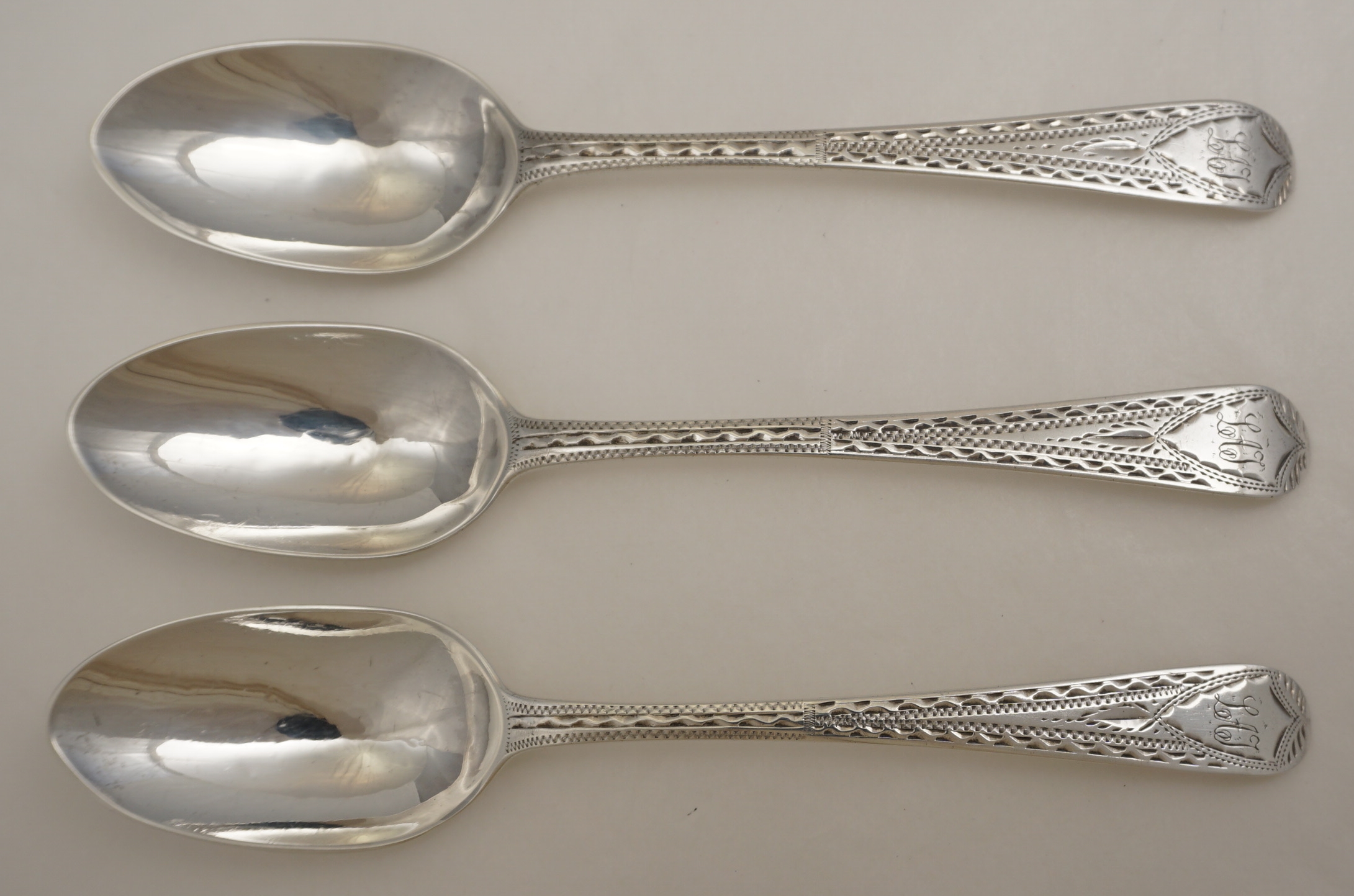 DESCRIPTION | Good set of three antique English Georgian solid sterling silver bright-cut Old English pattern teaspoons with frontal monogram engraving. |