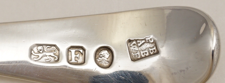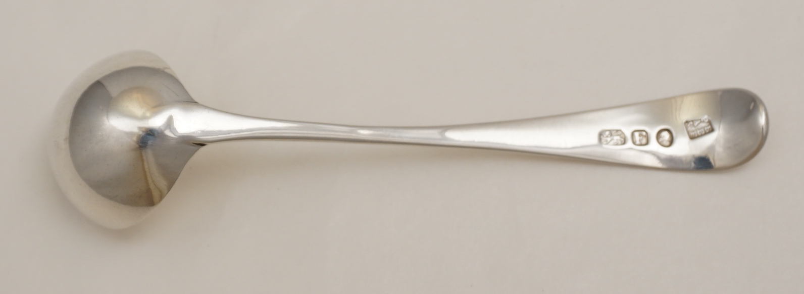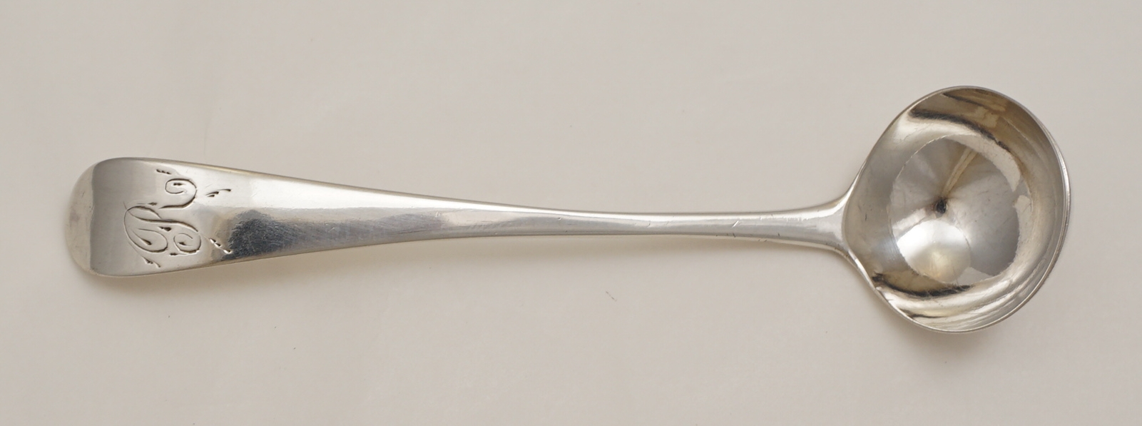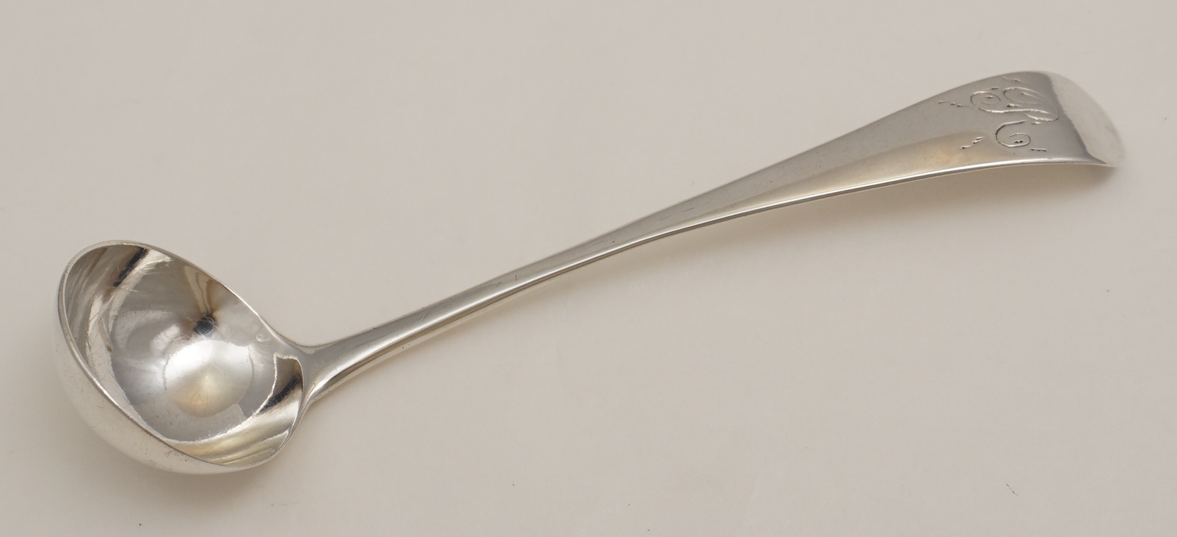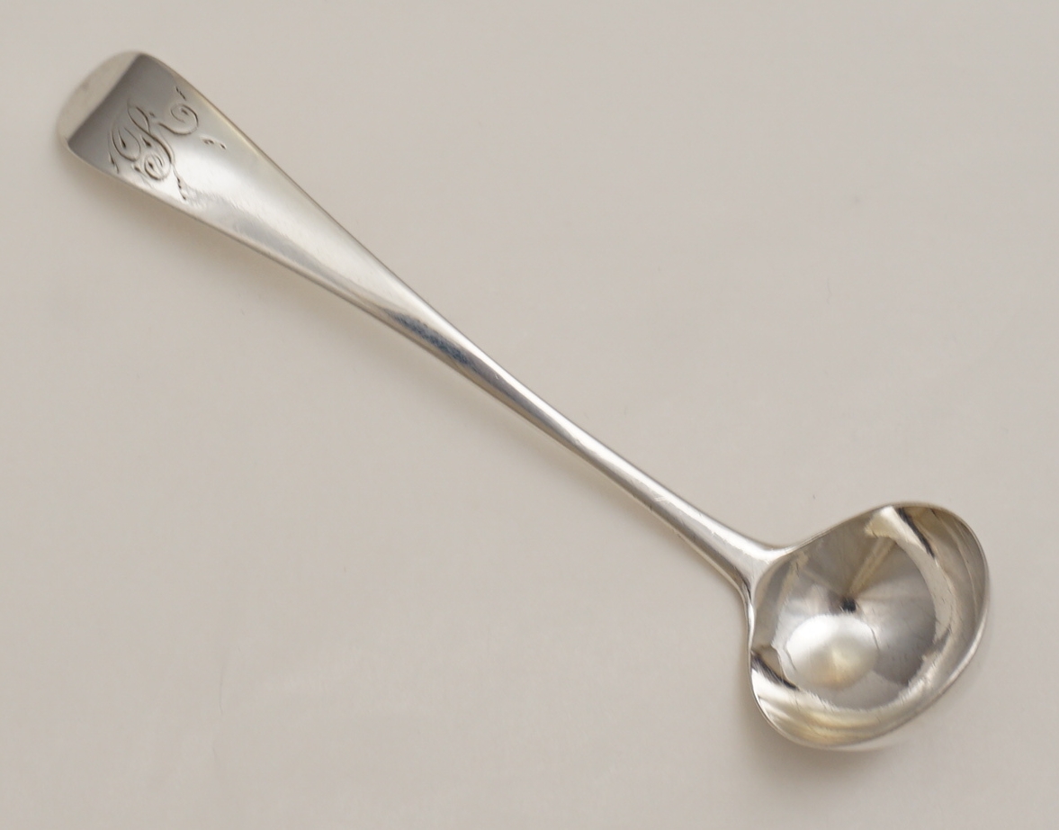 DESCRIPTION | Good antique English Georgian solid sterling silver Old English pattern condiment ladle with frontal initial 'R' engraving. |