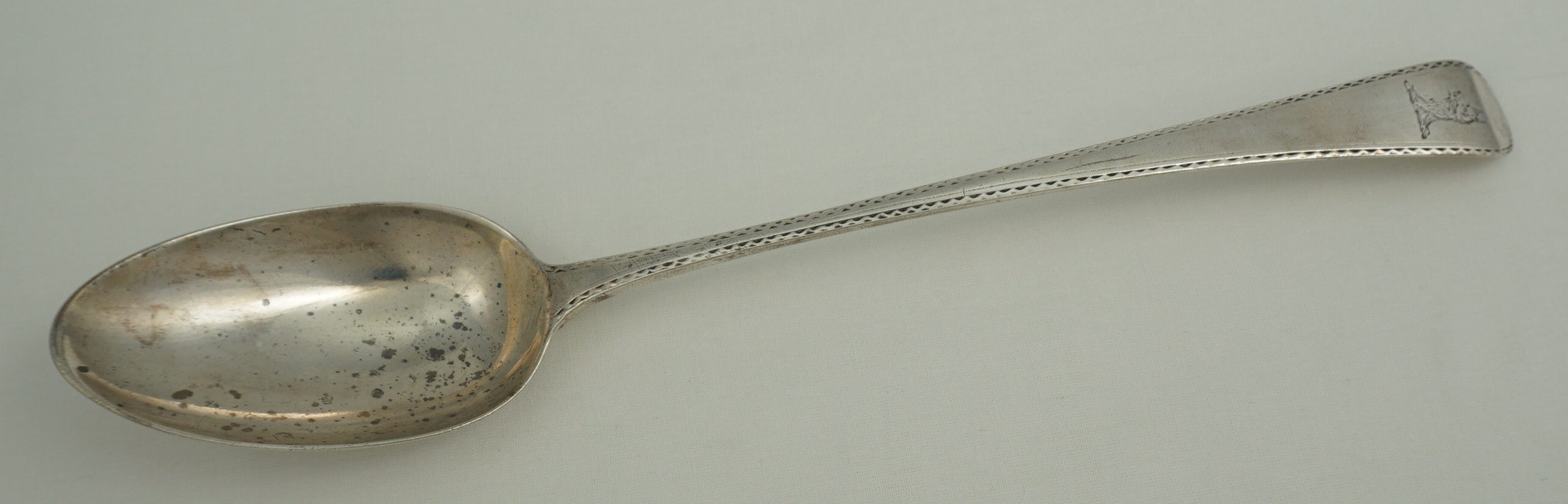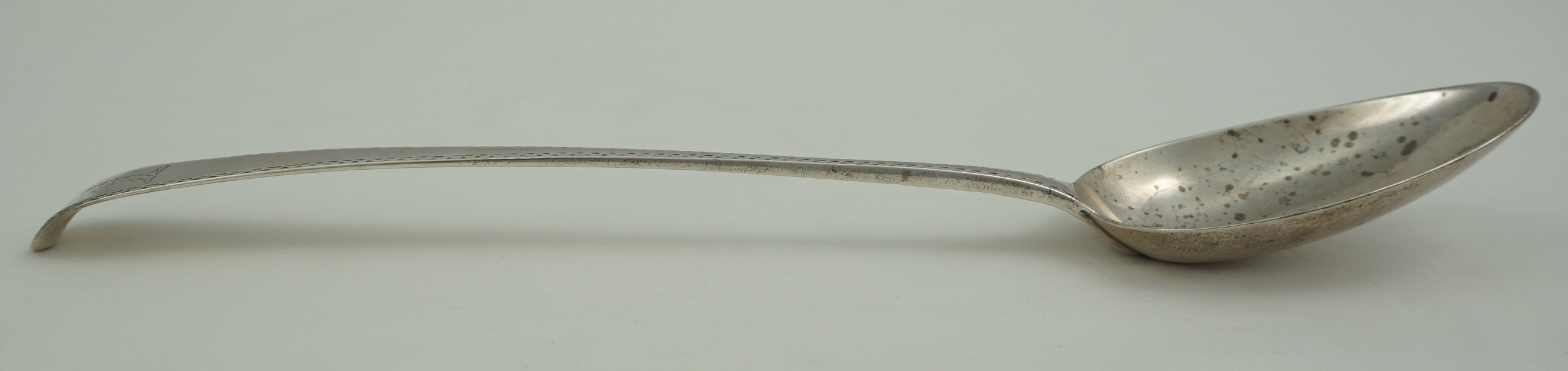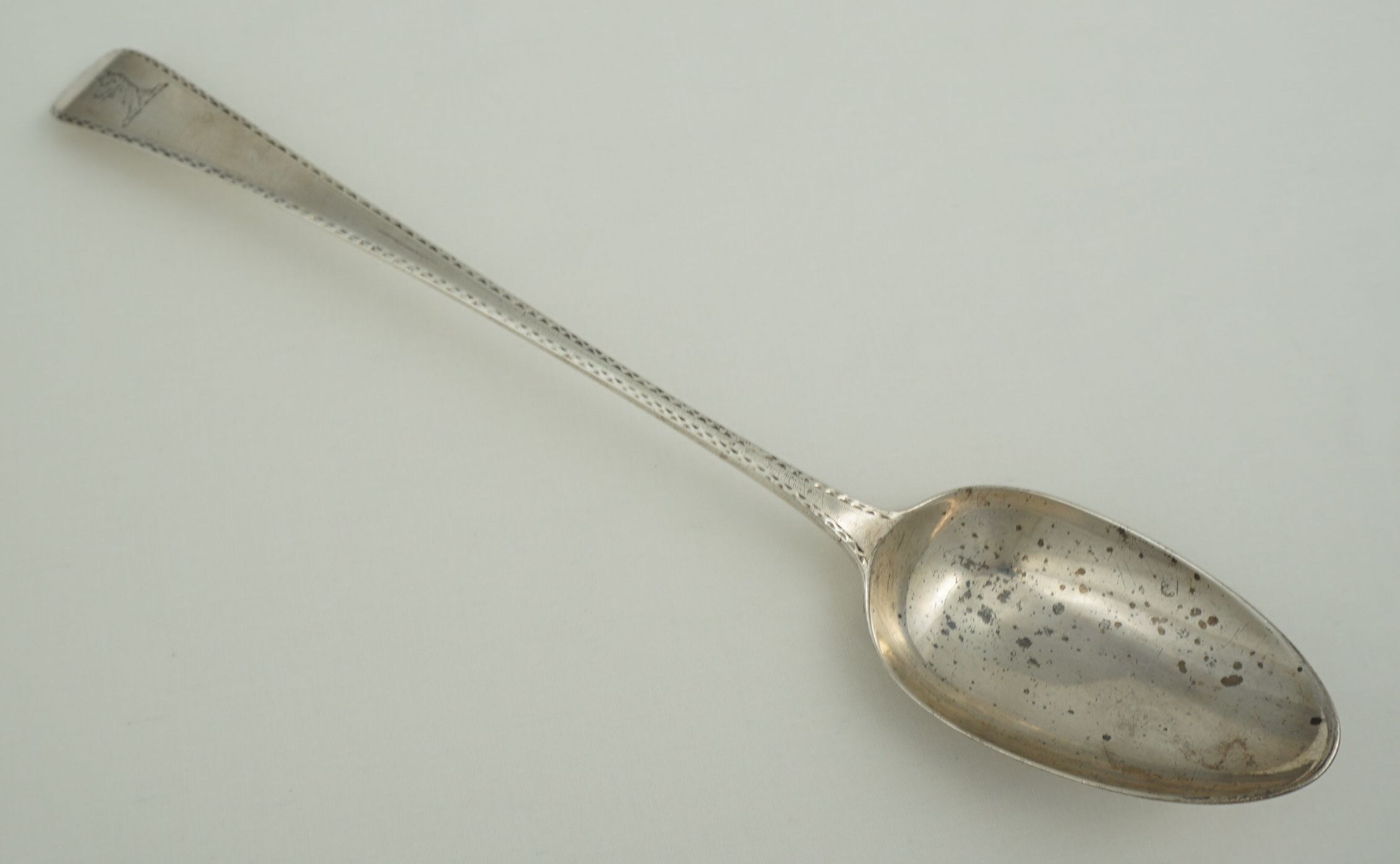 DESCRIPTION | Excellent antique English Georgian solid sterling silver Bright-cut Edge Old English pattern basting/gravy/serving spoon with a good frontal crest engraving. |