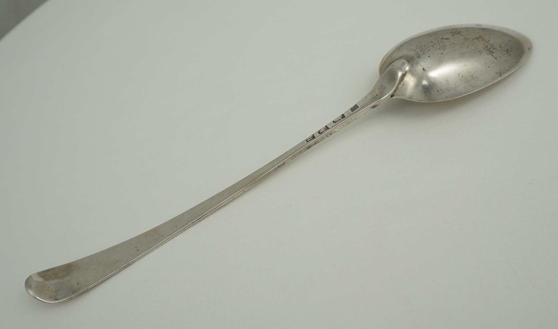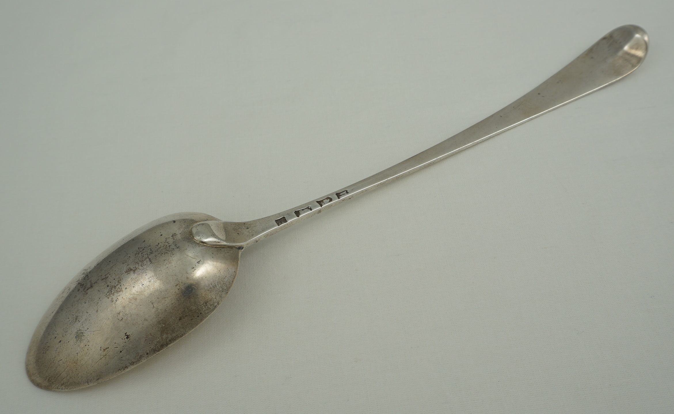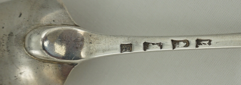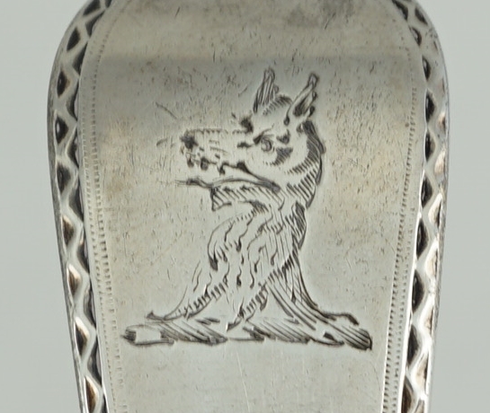 DESCRIPTION | Excellent antique English Georgian solid sterling silver Bright-cut Edge Old English pattern basting/gravy/serving spoon with a good frontal crest engraving. |