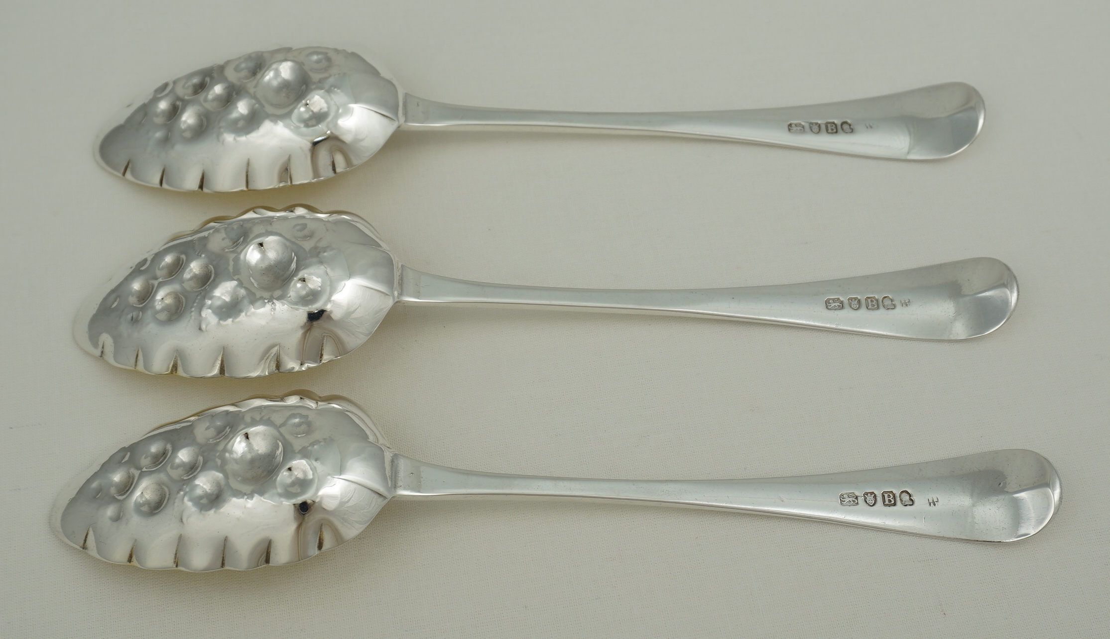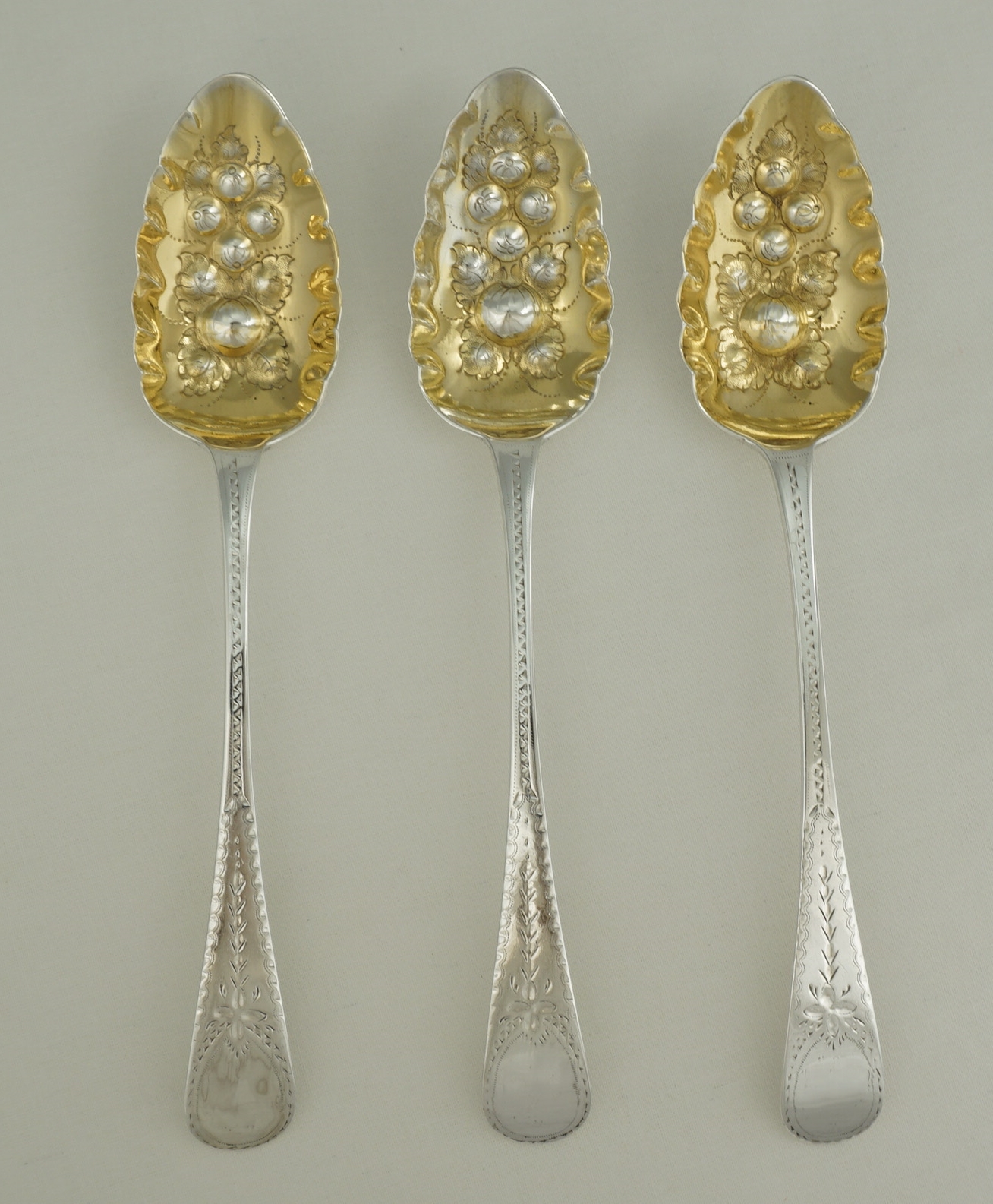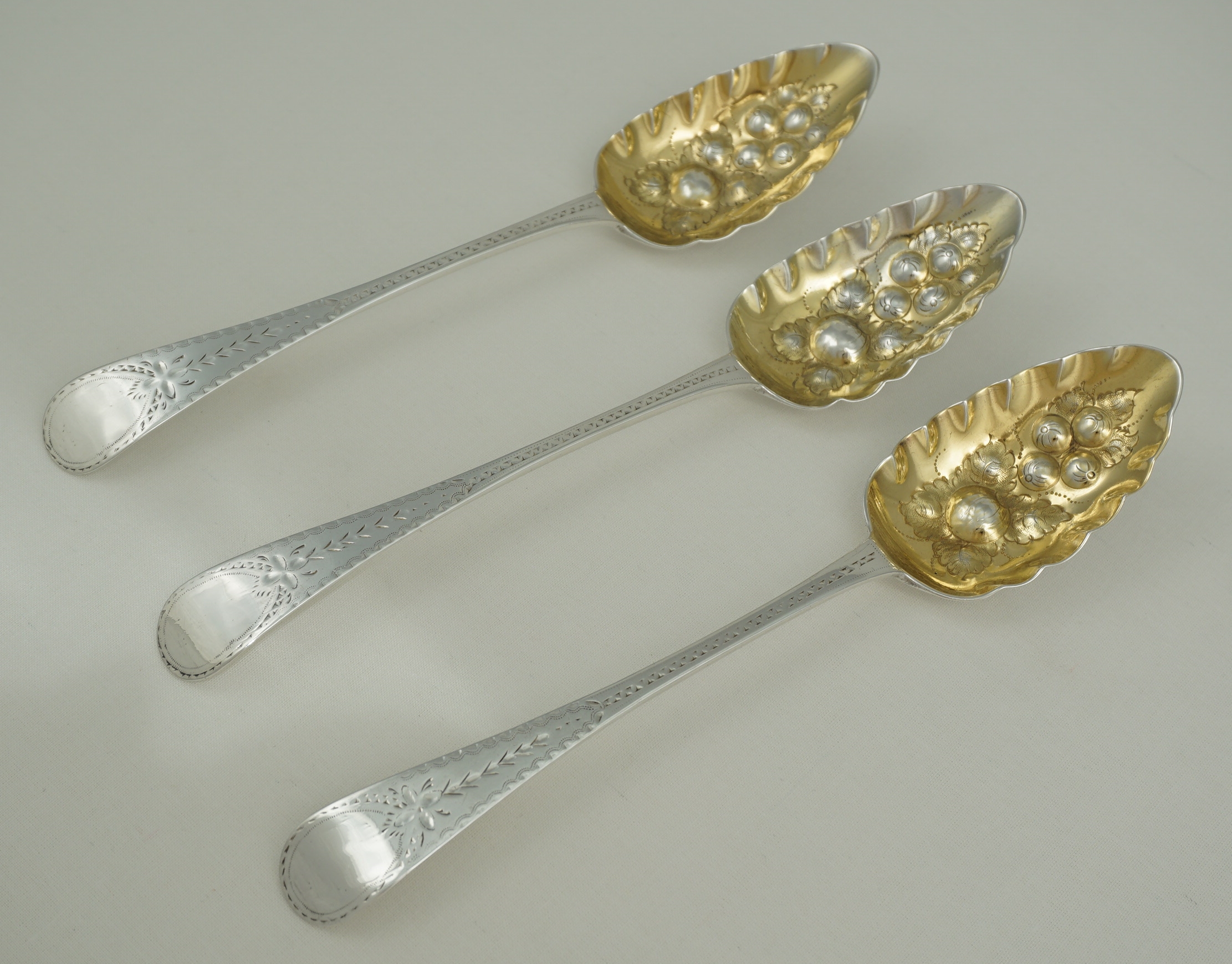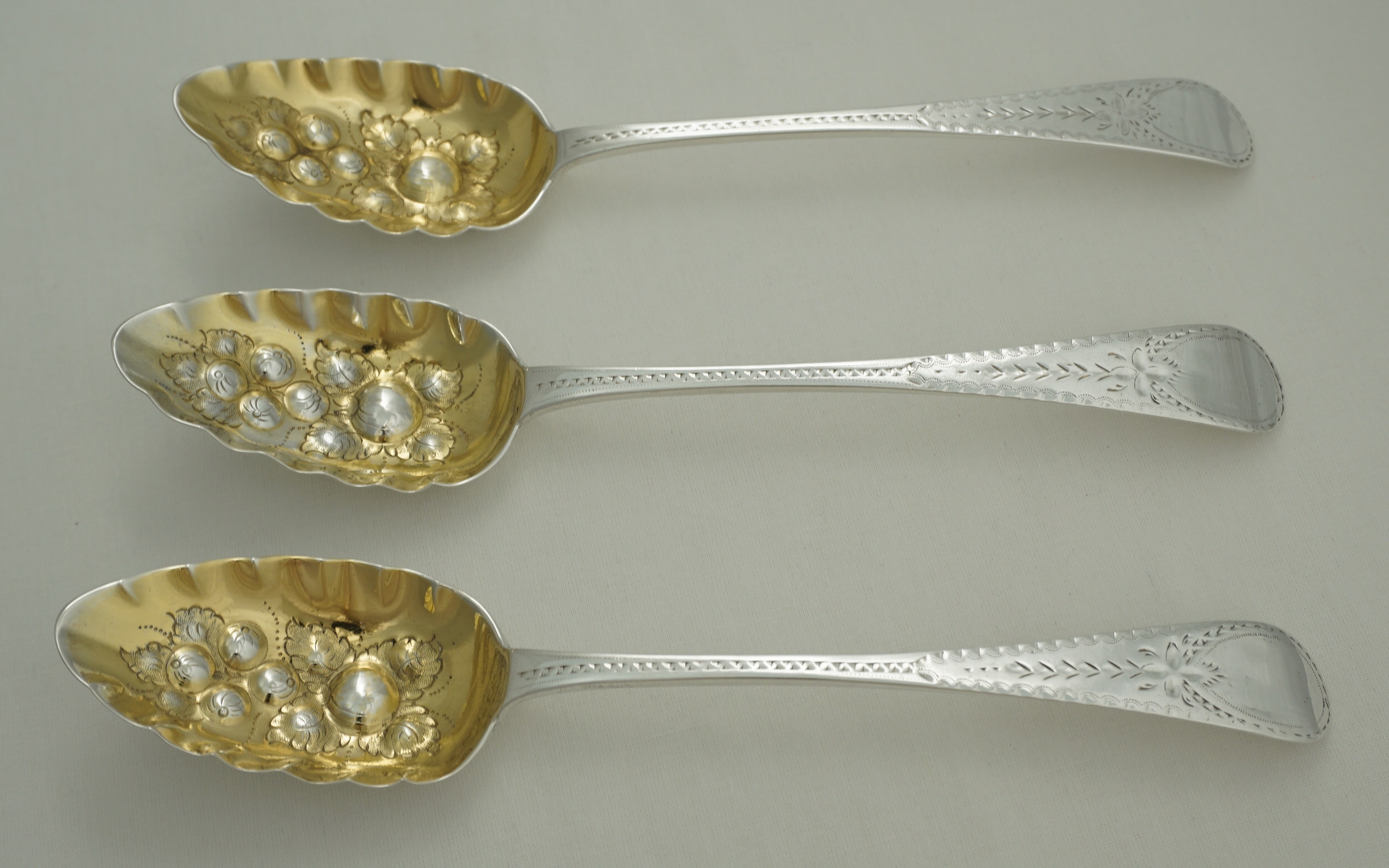 DESCRIPTION | Good set of three Antique English Georgian solid sterling silver gilt Bright-cut Old English pattern 'Berry' spoons. The bowl decoration and gilding will be later, probably late 19th century, but I suspect that the Bright-cutting is original. The original monogram engraving has been sympathetically erased from the cartouches. |