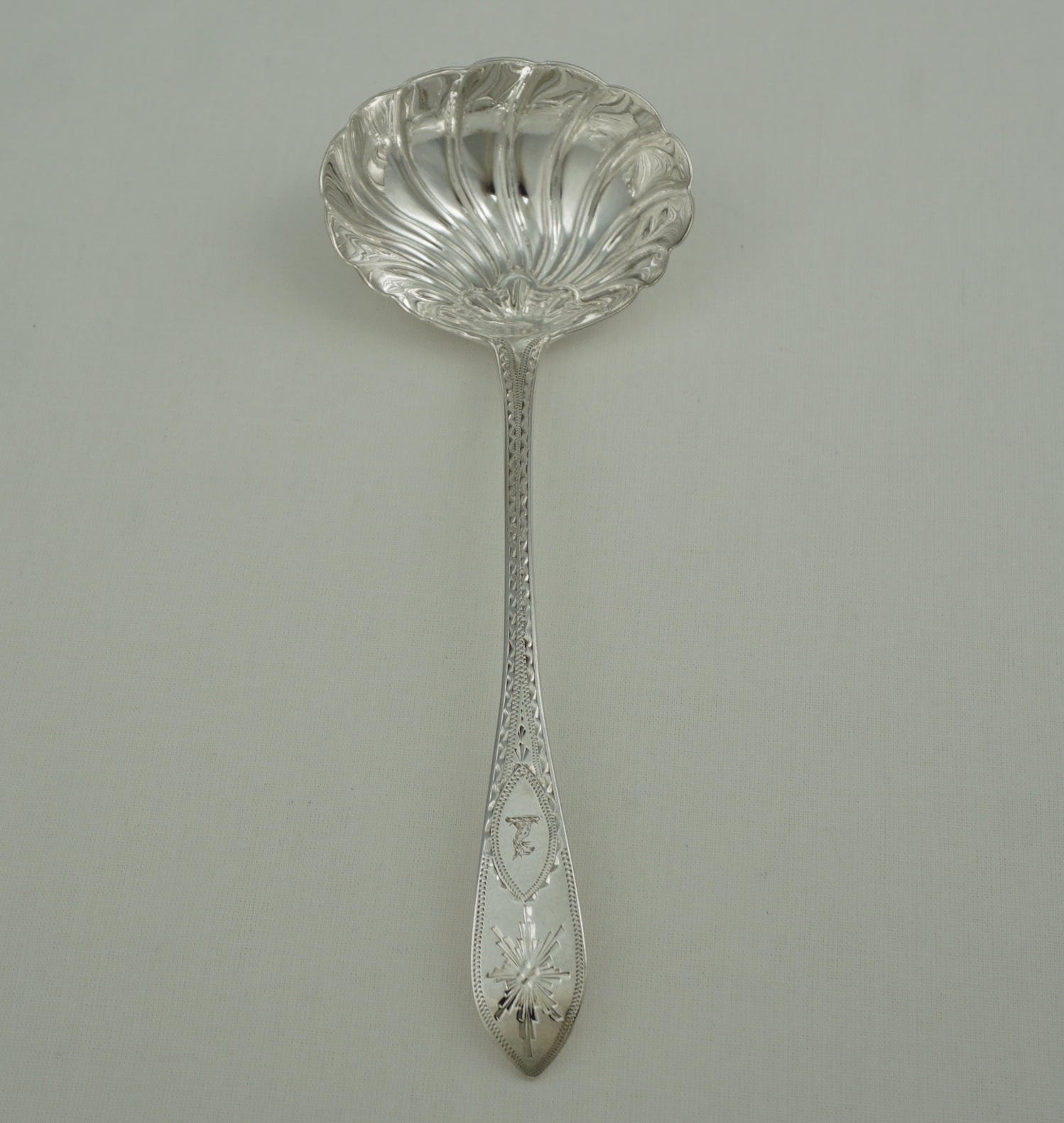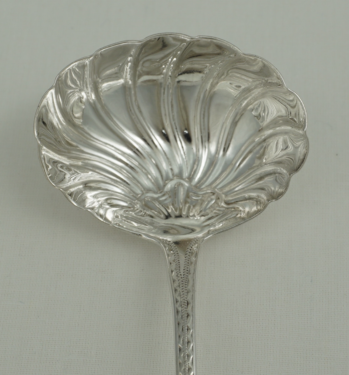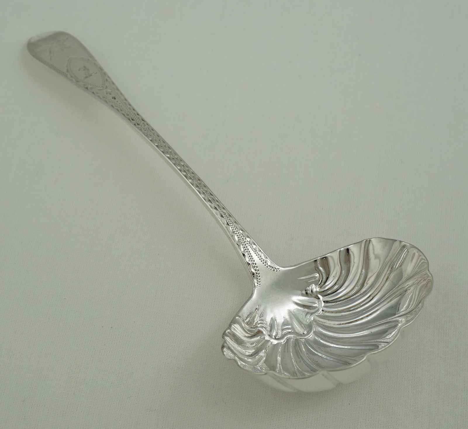 DESCRIPTION | Very good antique Irish Georgian solid sterling silver Bright-cut Irish (Celtic) Pointed Old English Star pattern sauce ladle with a fluted and shell bowl and good frontal crest engraving. The silver is still thick and stiff and yet the bowl has a leftwards bias as if to create a gentle pouring lip for the right handed. I first thought the bowl might be a bit bent/squashed but no, the flutes are longer and wider on the left side so this is an intentional feature of the manufacture. |