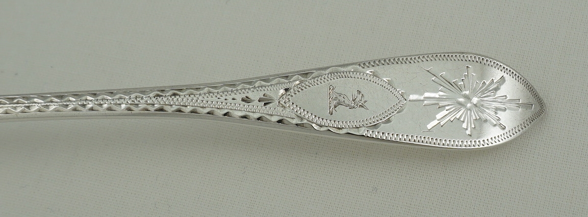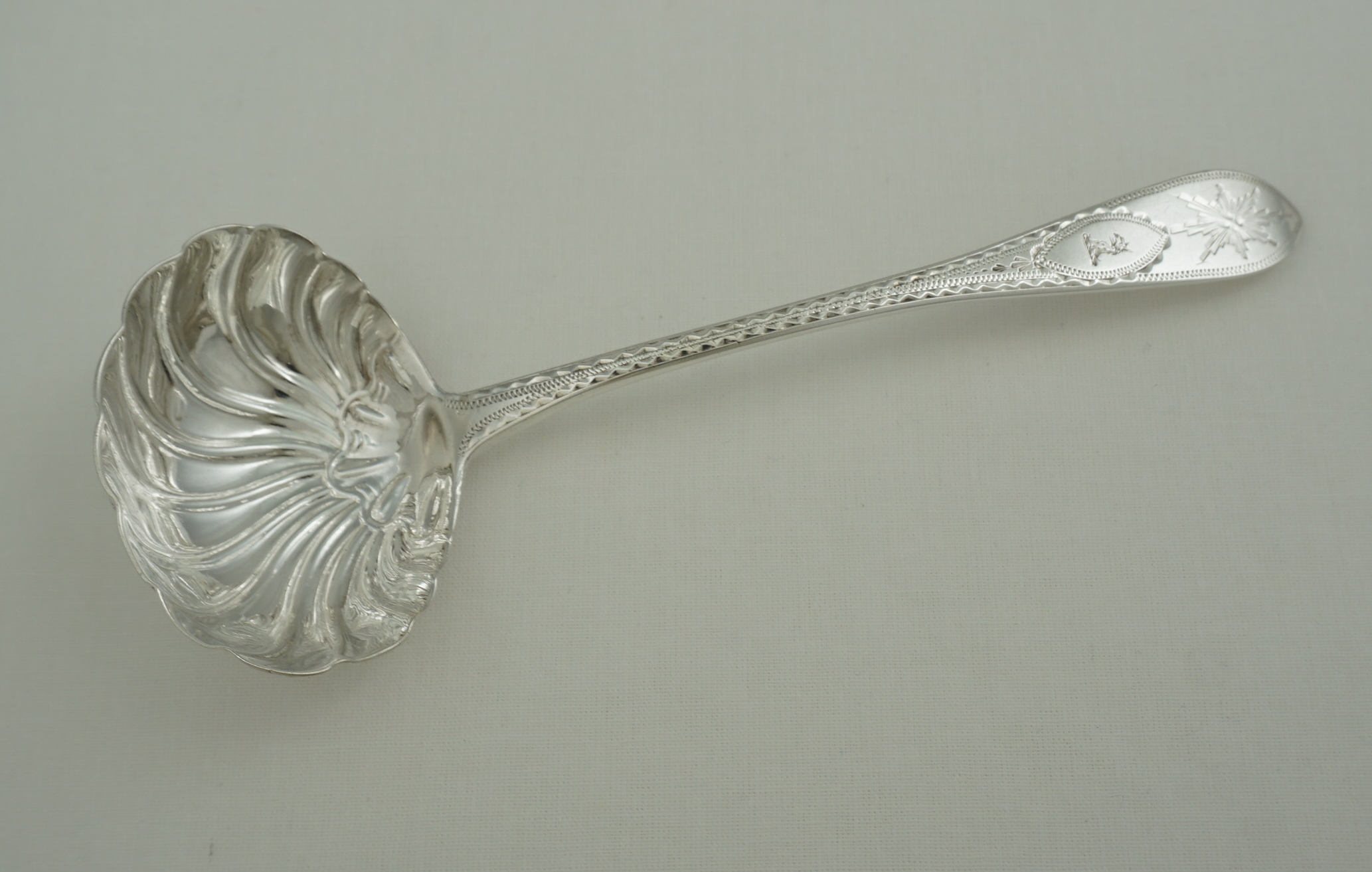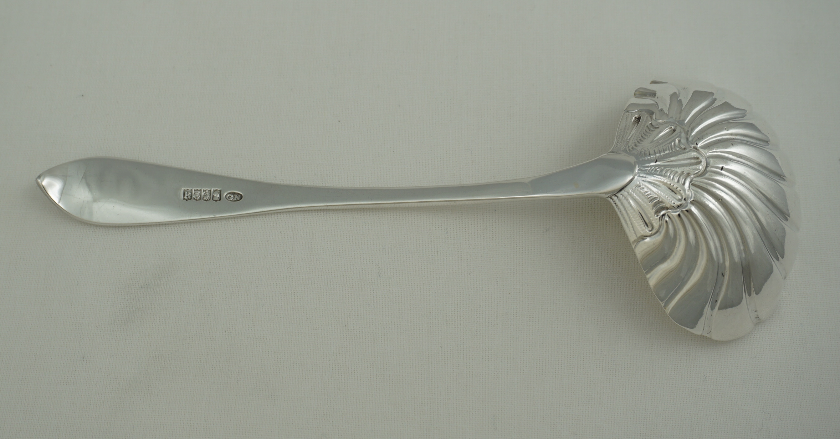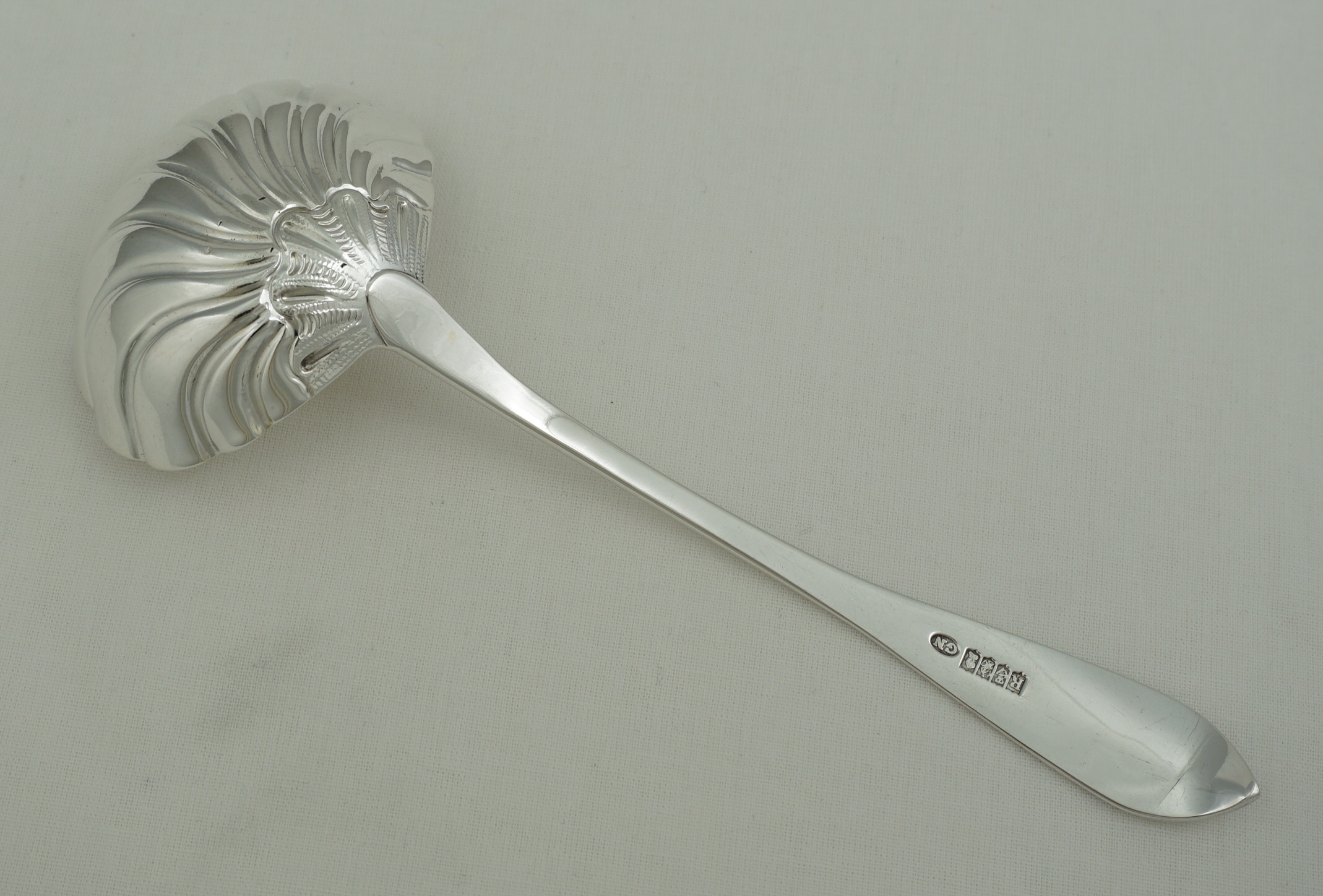 DESCRIPTION | Very good antique Irish Georgian solid sterling silver Bright-cut Irish (Celtic) Pointed Old English Star pattern sauce ladle with a fluted and shell bowl and good frontal crest engraving. The silver is still thick and stiff and yet the bowl has a leftwards bias as if to create a gentle pouring lip for the right handed. I first thought the bowl might be a bit bent/squashed but no, the flutes are longer and wider on the left side so this is an intentional feature of the manufacture. |