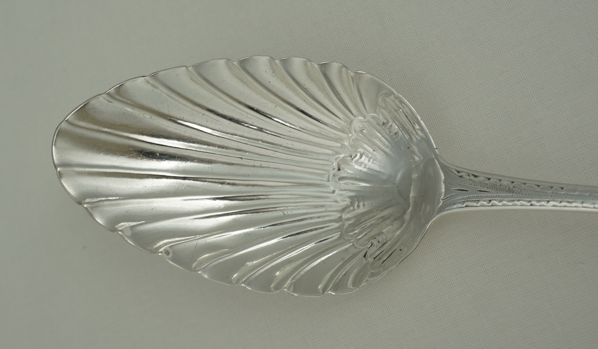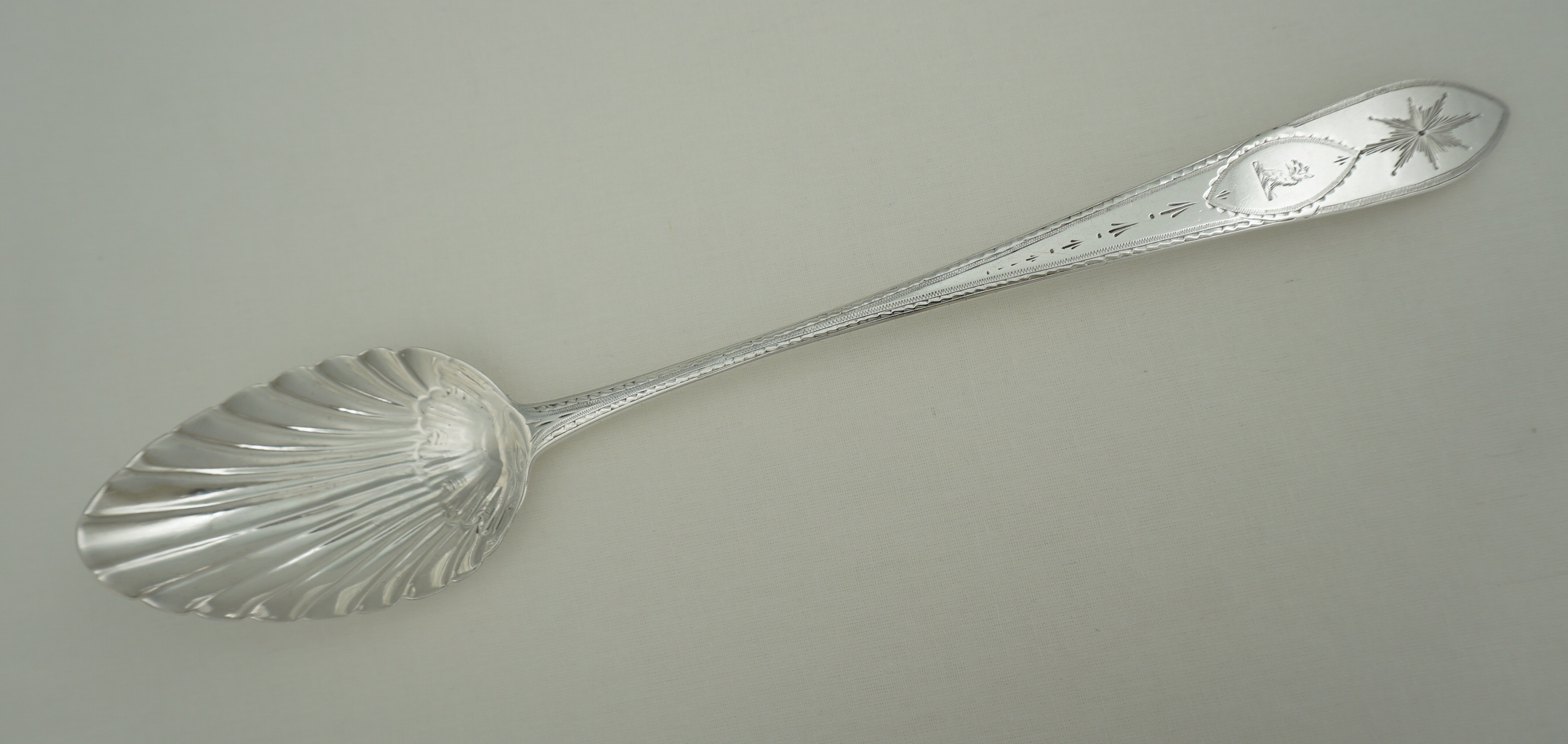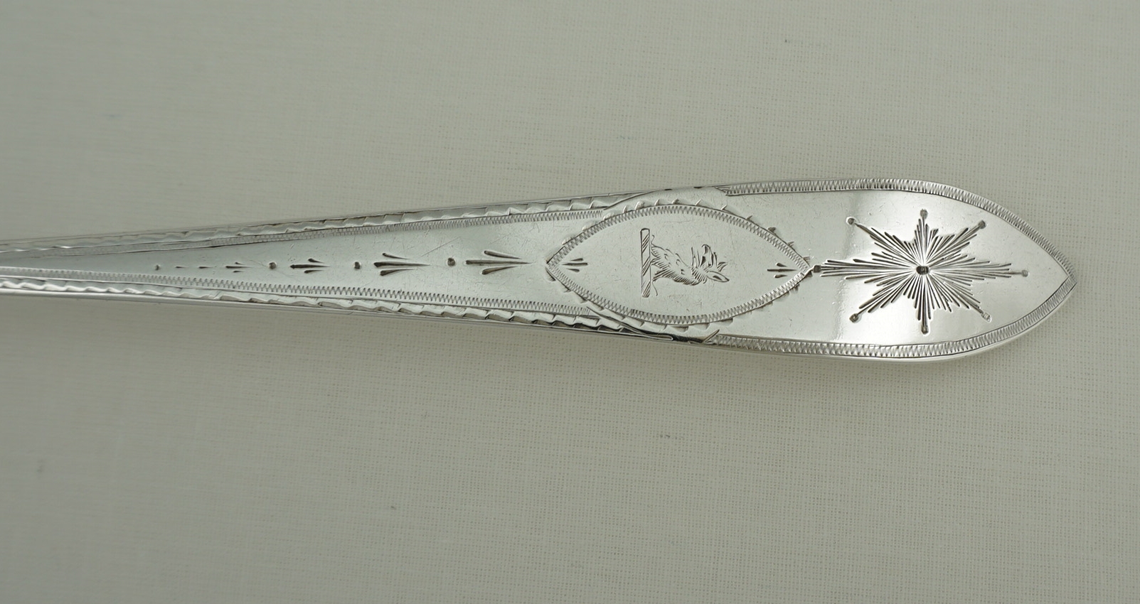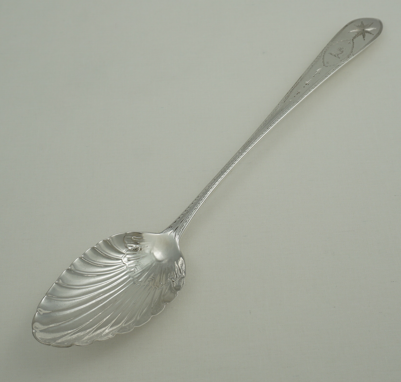 DESCRIPTION | Antique Irish Georgian solid sterling silver Bright-cut Irish (Celtic) Pointed Old English Star pattern basting, serving, gravy spoon with a fluted and shell bowl and good frontal crest engraving. |