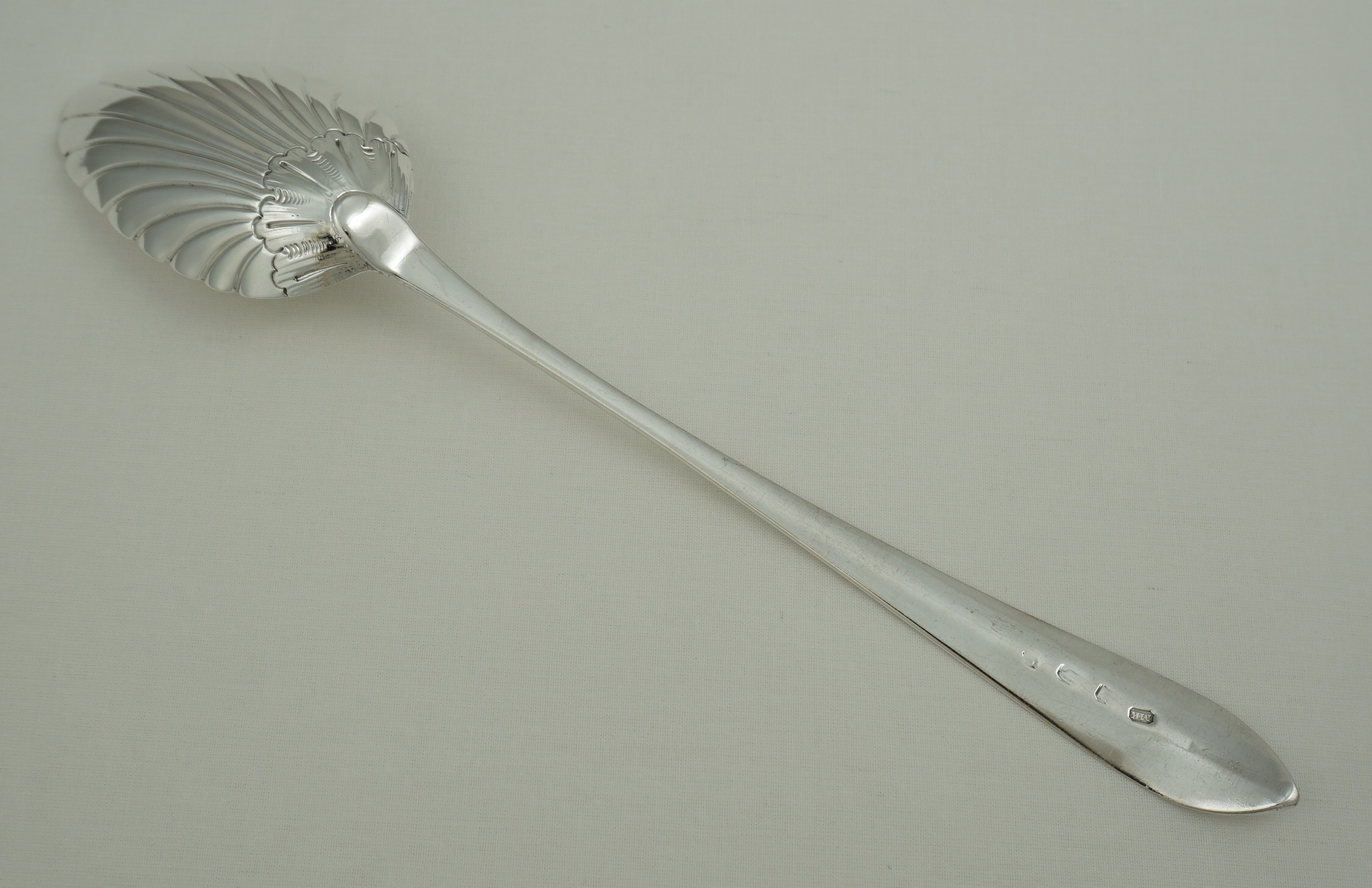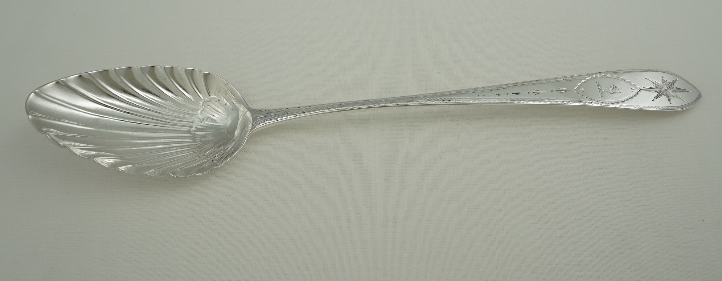 CONDITION | good, hallmarks and shell within bowl part rubbed, no splits, no repairs, the Bright-cut decoration is still crisp and the silver thick. I have only tickle polished so the item is nice and clean for use but the crispness of bright-cut decoration has not been compromised by a heavy wheel polish. Tickle polishing does not remove the millions of tiny surface marks that are a feature of old silver |