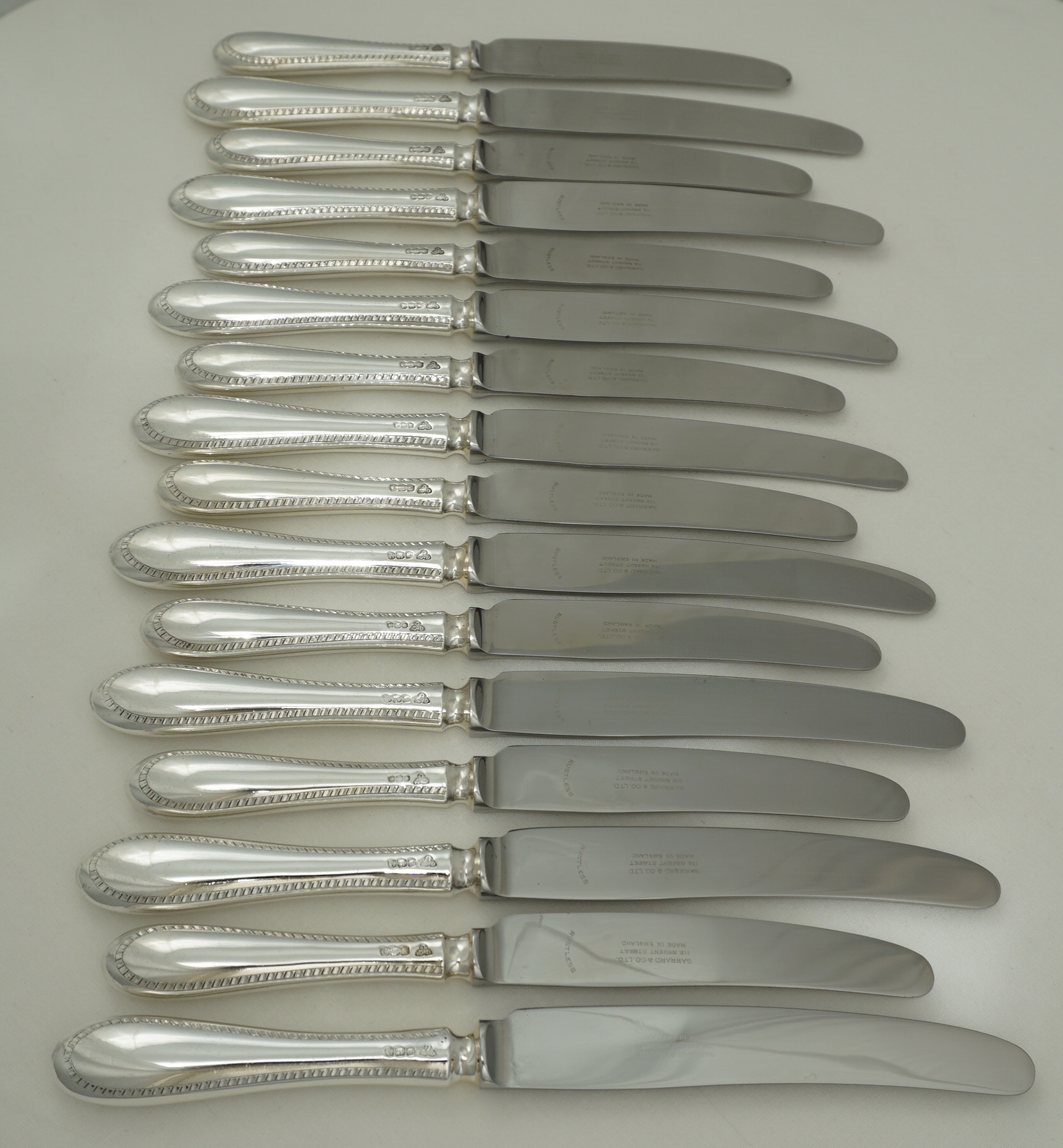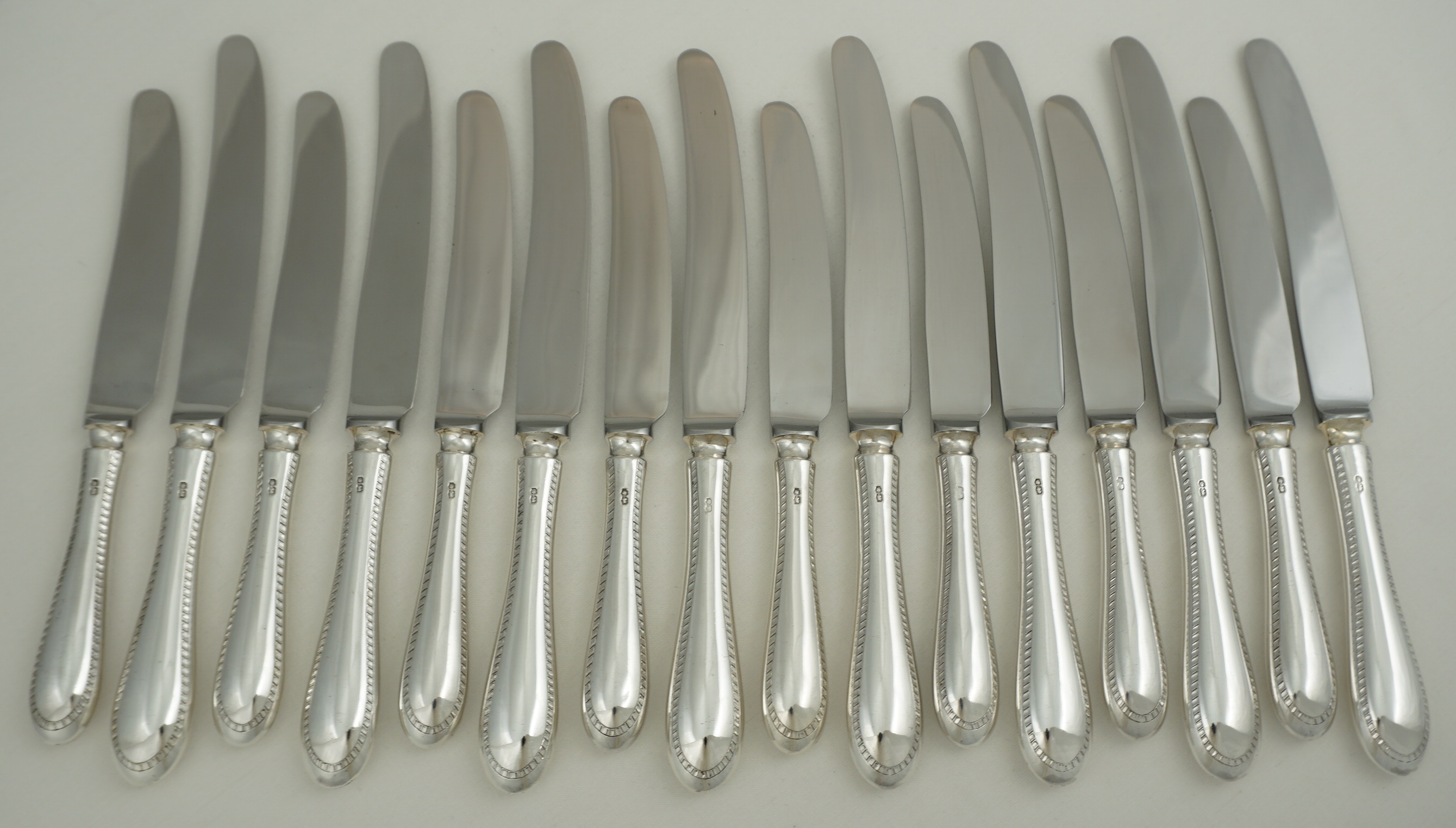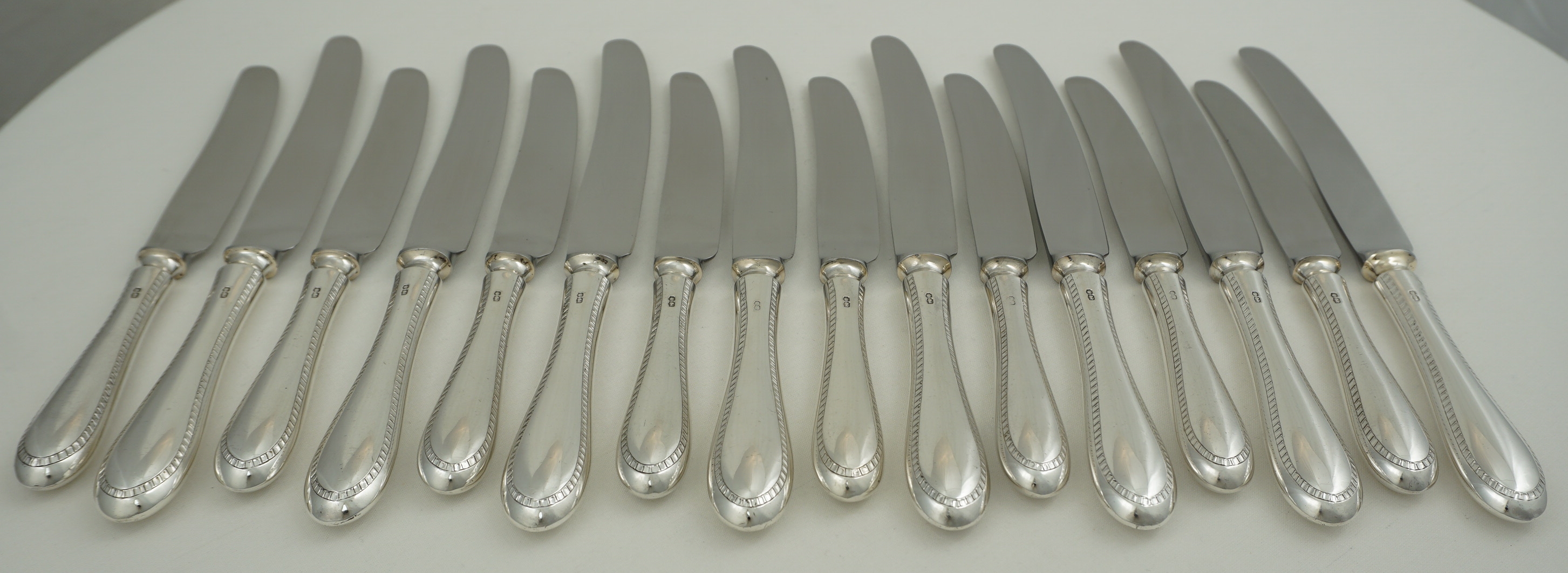 DESCRIPTION | Good set of vintage English sterling silver handled Old English Feather Edge pattern knives comprising of eight table and eight dessert/salad/side with 'rustless' steel blades and soldered joints. The soldered joints technically enable cleaning in the dishwasher but the silver will dull and wear and the lifespan of the knives shortened. Much better; wipe with warm water wetted soft cloth and dish soap, rinse in cool water, dry with soft towel. Whatever was on them cannot be too bad as just a few hours earlier you were putting it in your mouth. The hot dishwasher is fine for ceramics but not your silver. |