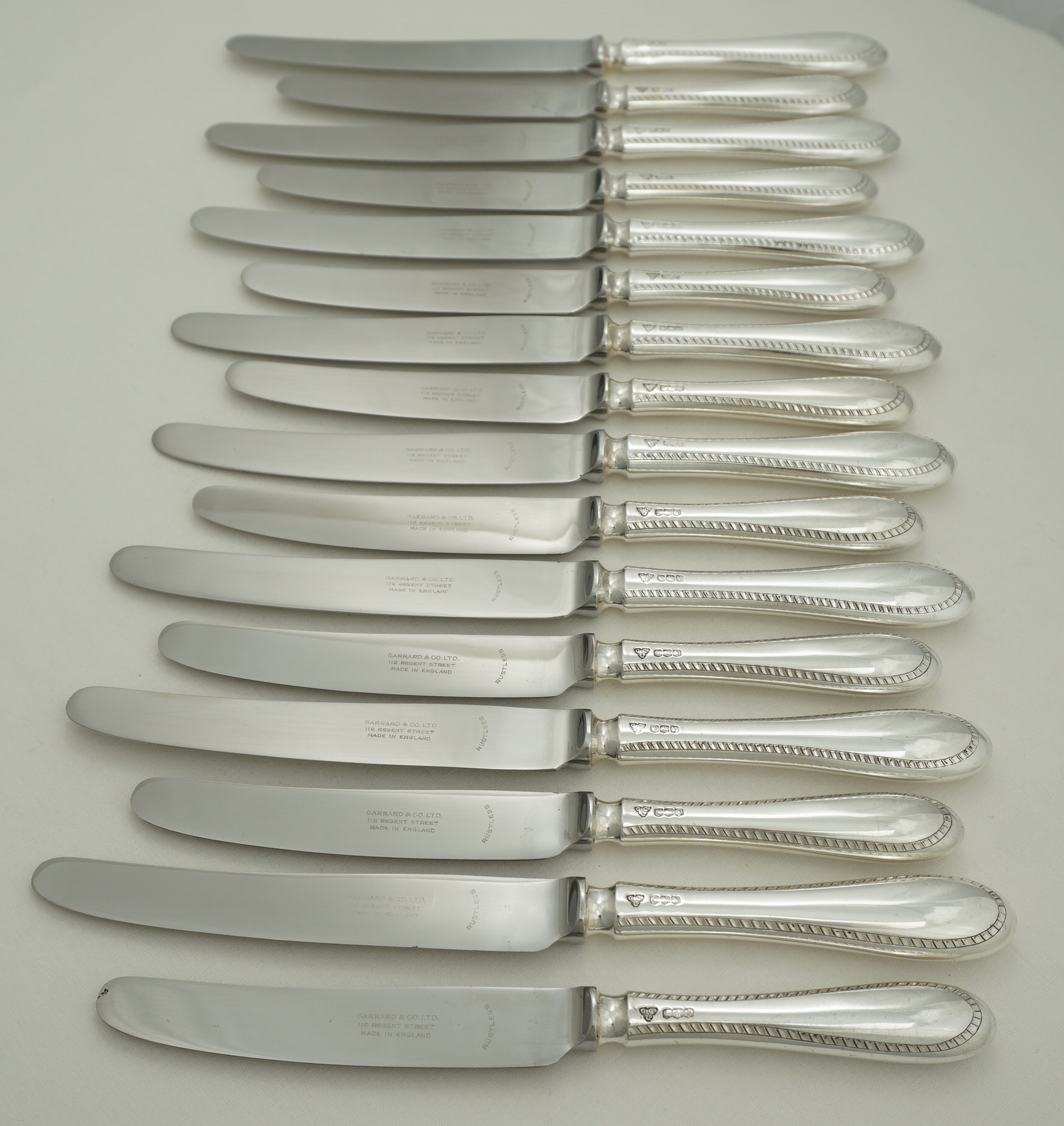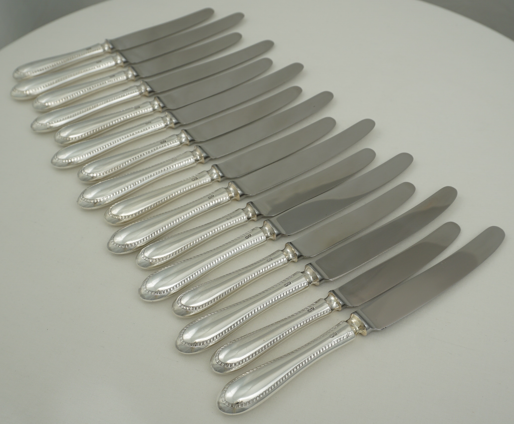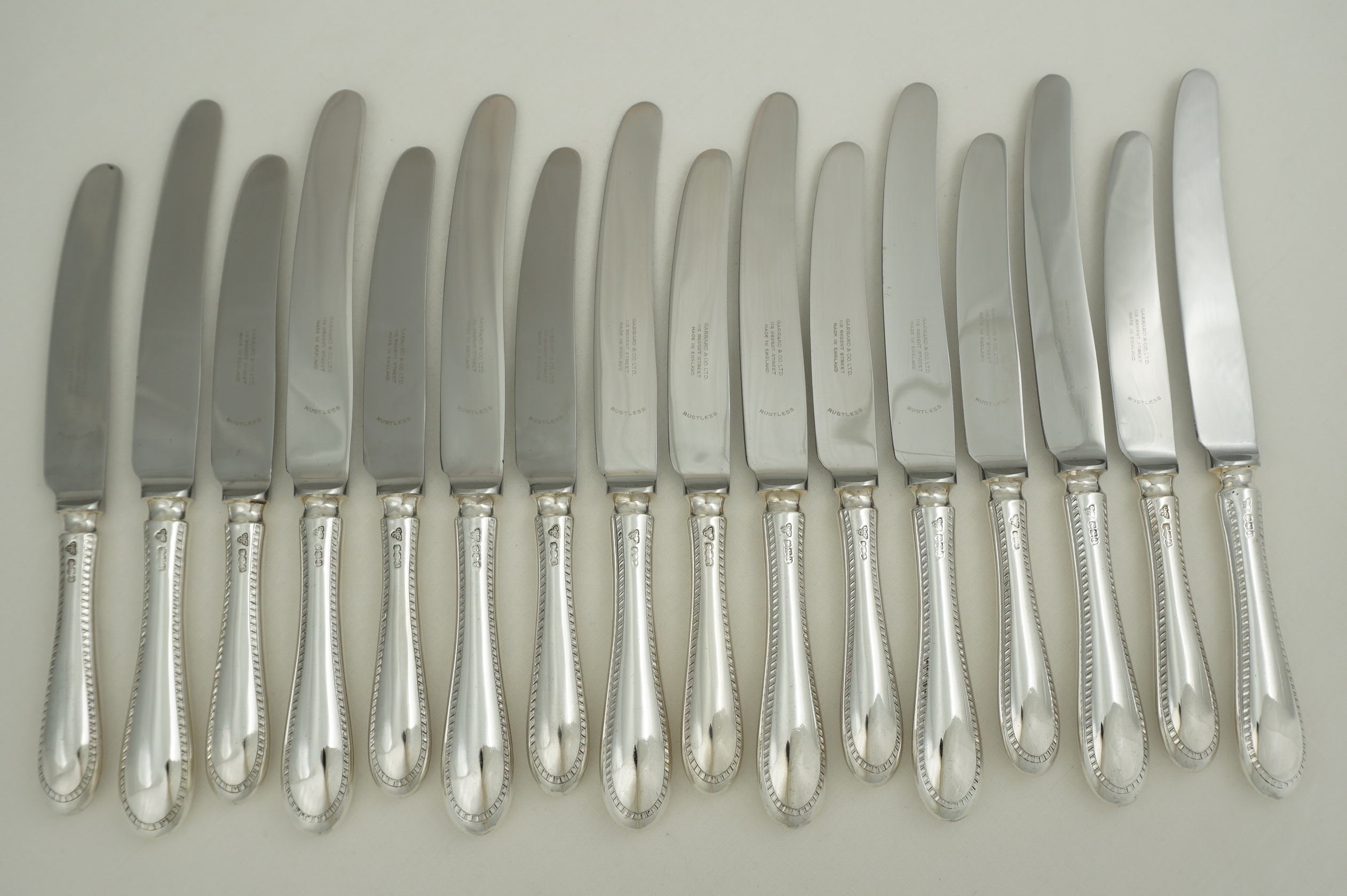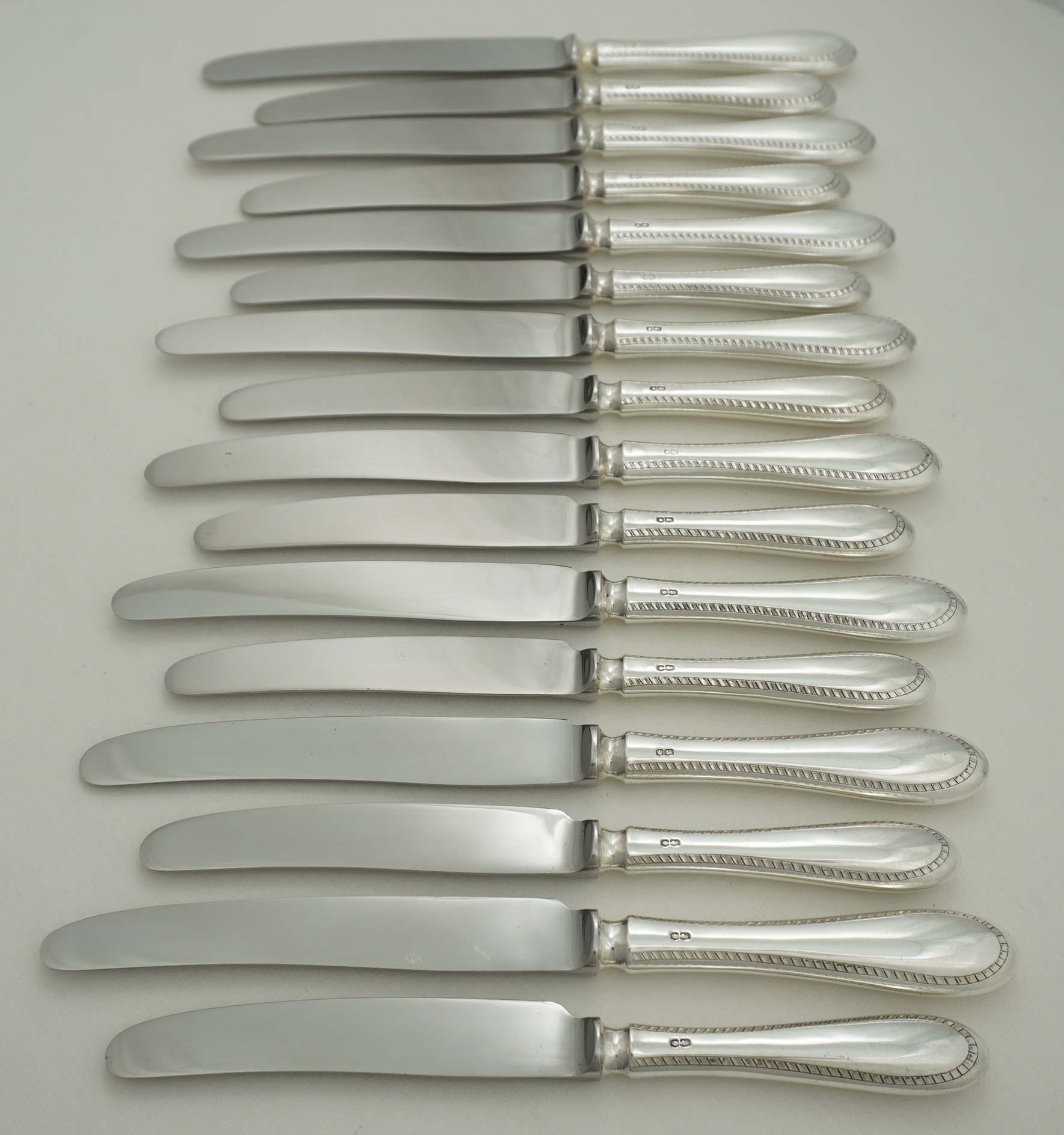 DESCRIPTION | Good set of vintage English sterling silver handled Old English Feather Edge pattern knives comprising of eight table and eight dessert/salad/side with 'rustless' steel blades and soldered joints. The soldered joints technically enable cleaning in the dishwasher but the silver will dull and wear and the lifespan of the knives shortened. Much better; wipe with warm water wetted soft cloth and dish soap, rinse in cool water, dry with soft towel. Whatever was on them cannot be too bad as just a few hours earlier you were putting it in your mouth. The hot dishwasher is fine for ceramics but not your silver. |