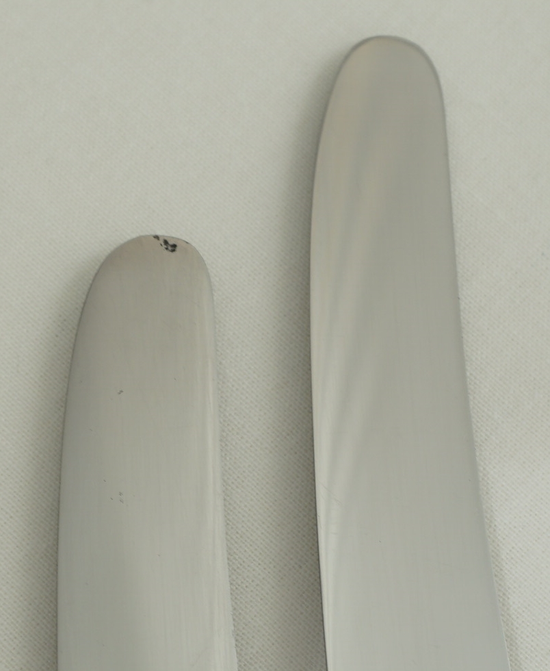 CONDITION | excellent, one handle to blade solder joint re-done table knife far right, little pitting to one tip dessert knife far left, fresh professional clean and polish so safe for use at table |