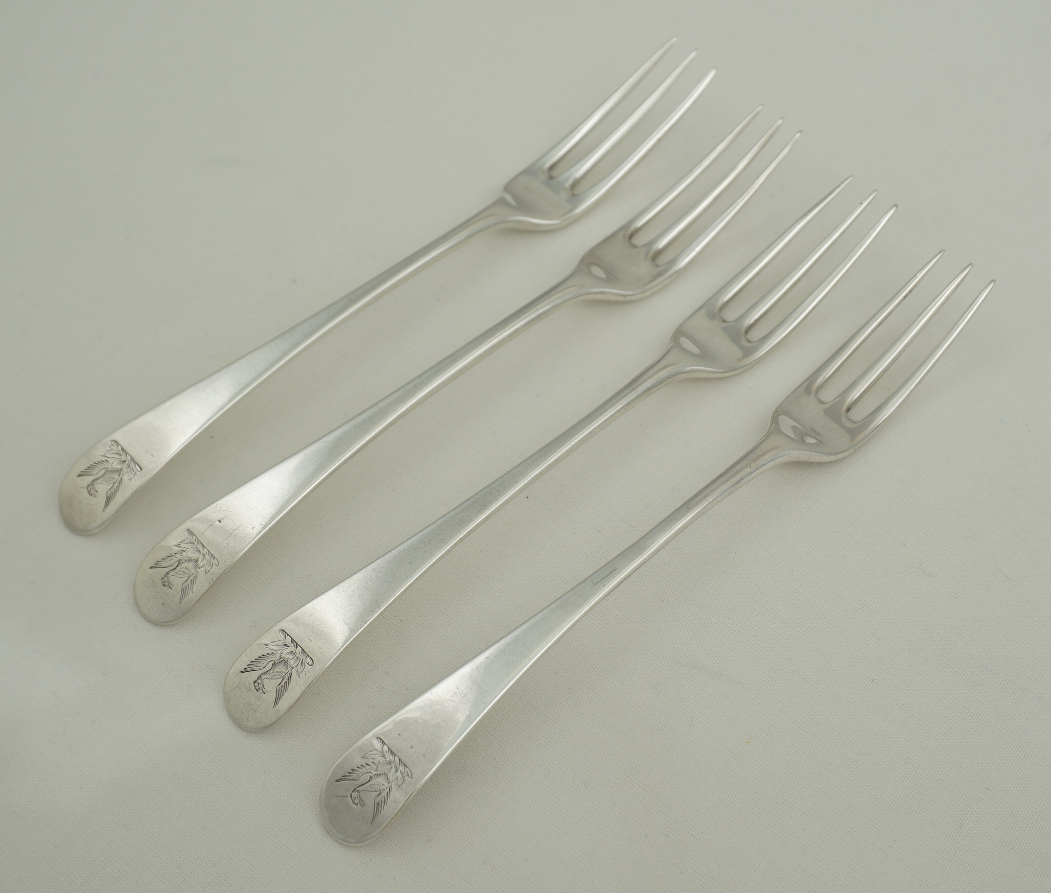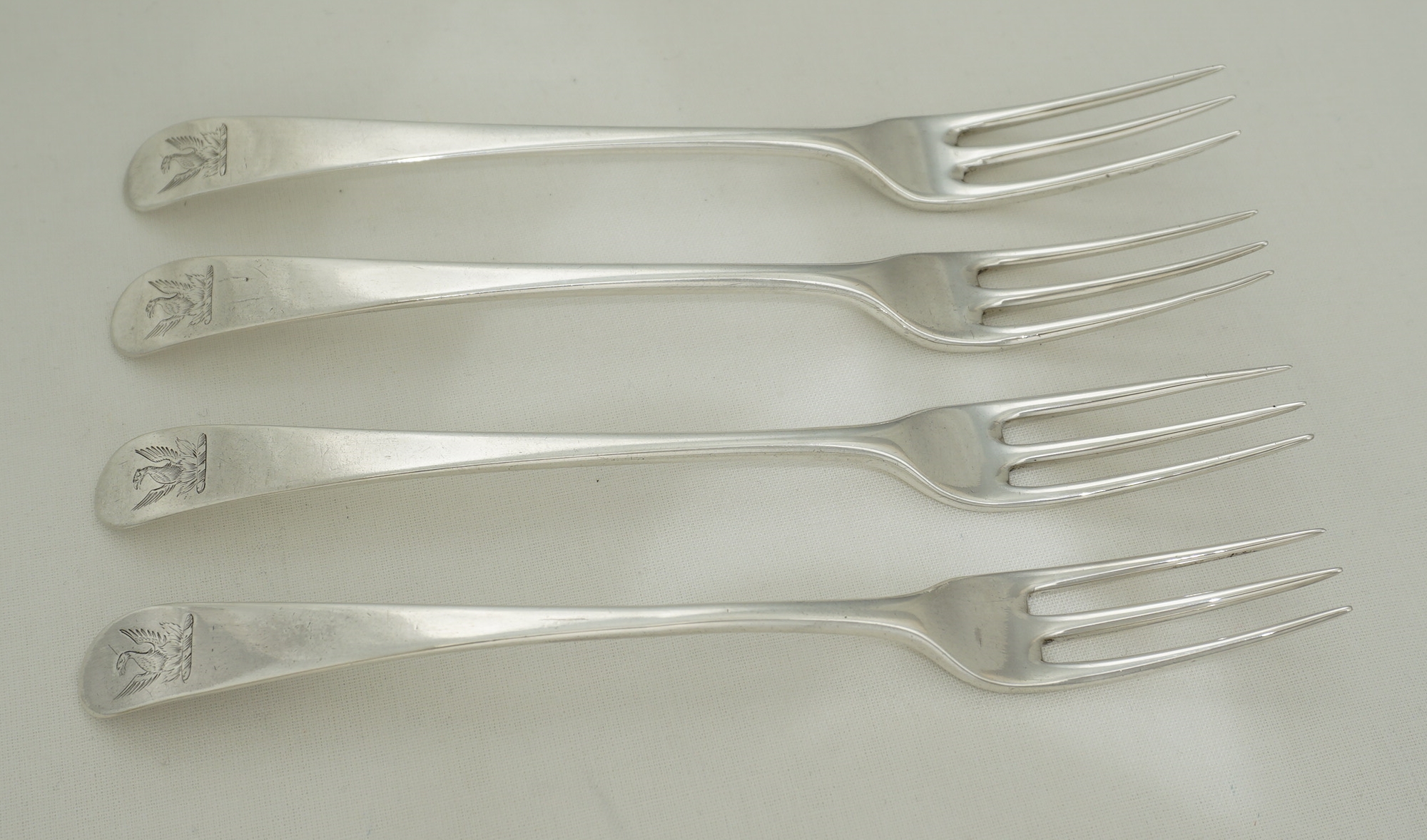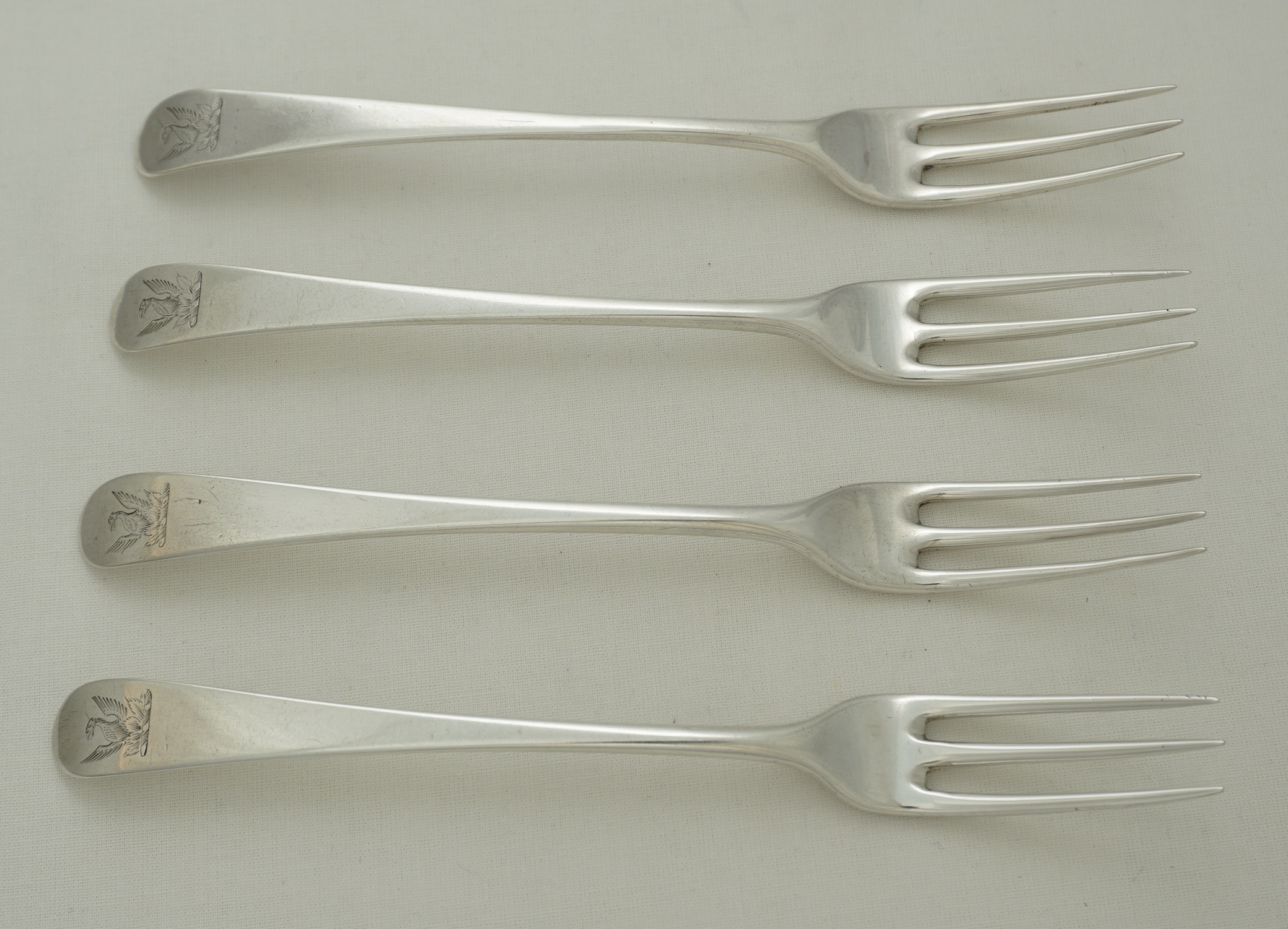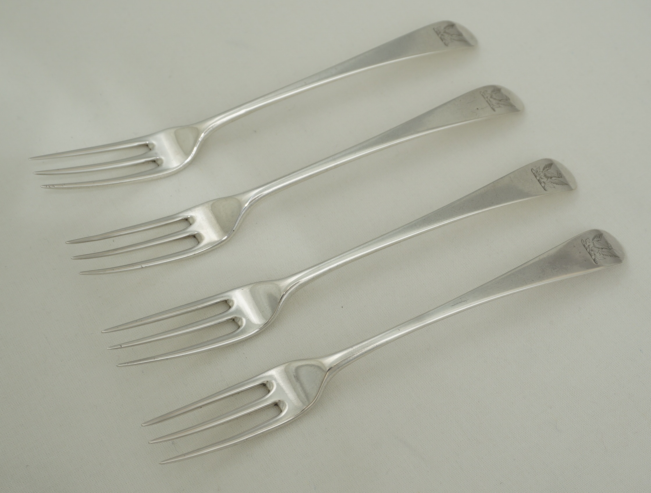 DESCRIPTION | Scarce set of four pre-1800 antique English Georgian solid sterling silver Old English pattern dessert forks with frontal crest engraving and lovely well struck and preserved bottom placed hallmarks. |