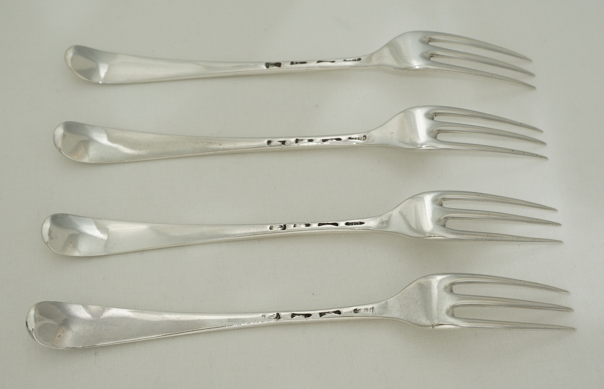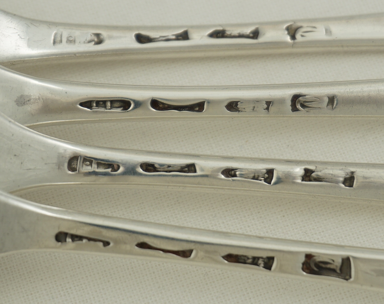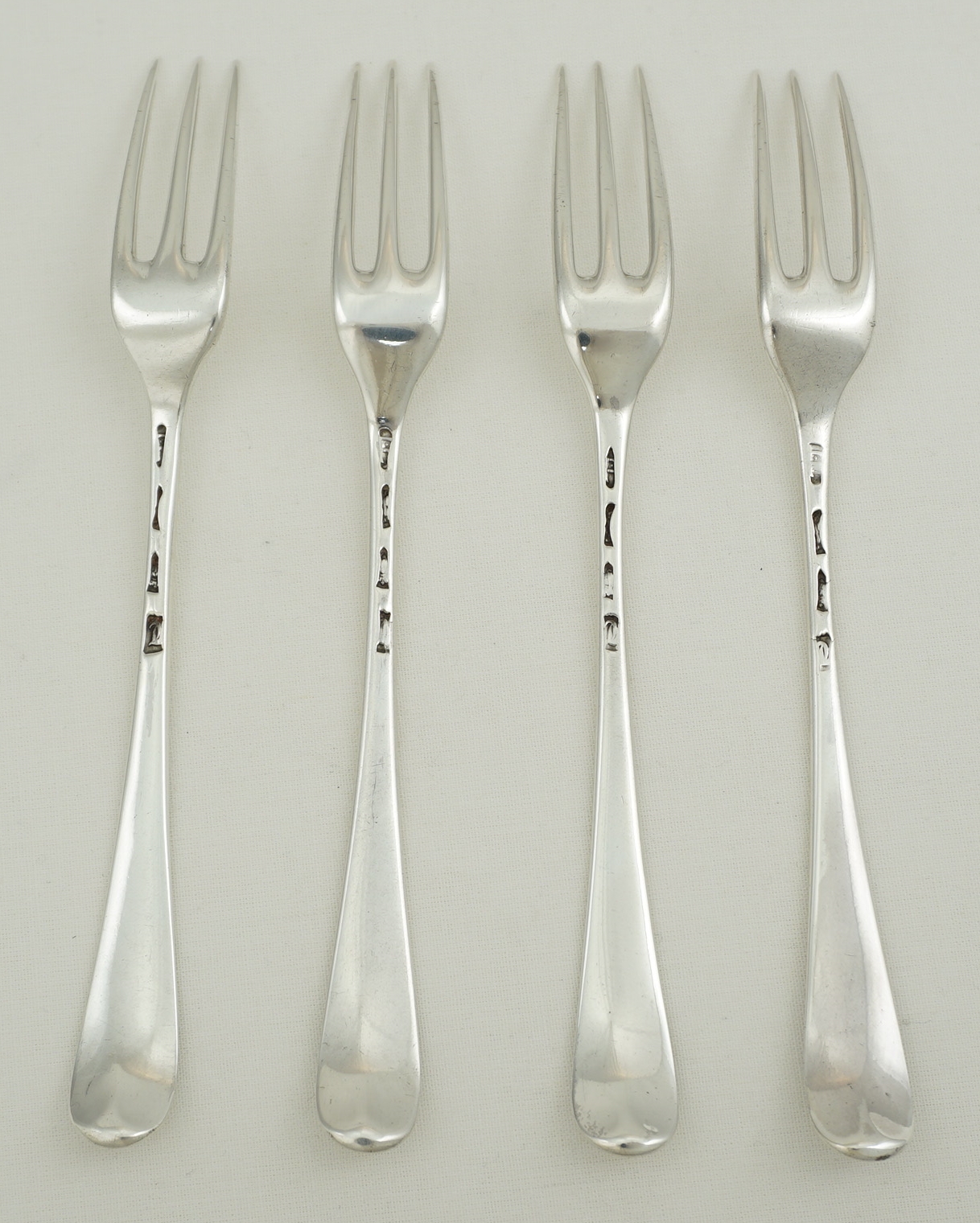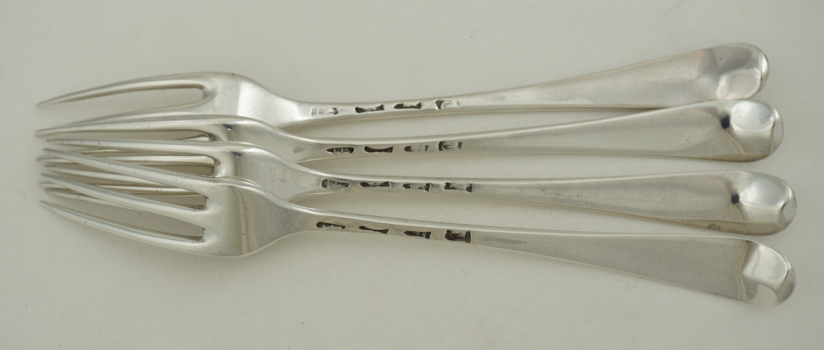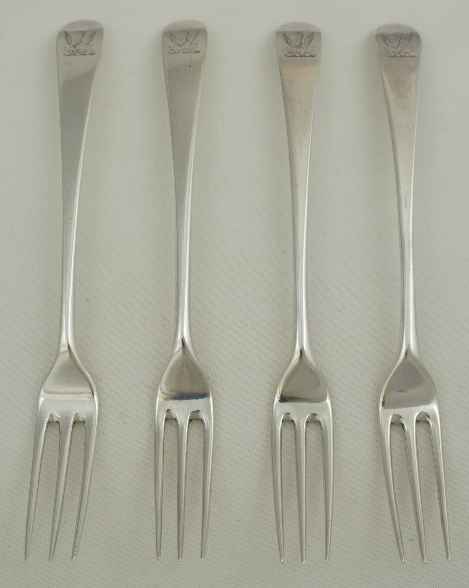 DESCRIPTION | Scarce set of four pre-1800 antique English Georgian solid sterling silver Old English pattern dessert forks with frontal crest engraving and lovely well struck and preserved bottom placed hallmarks. |