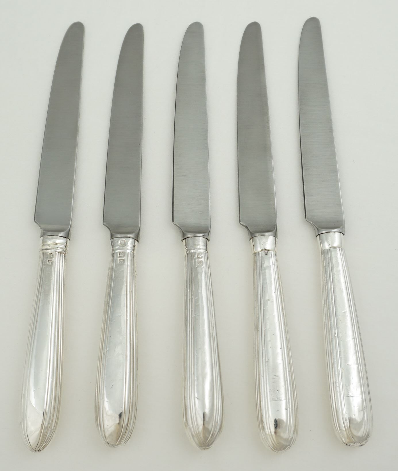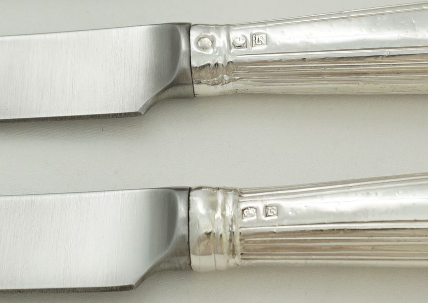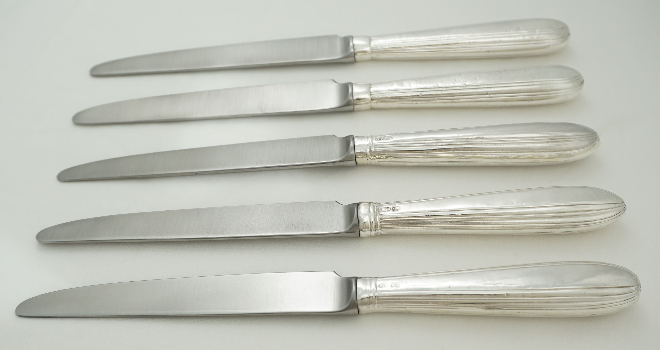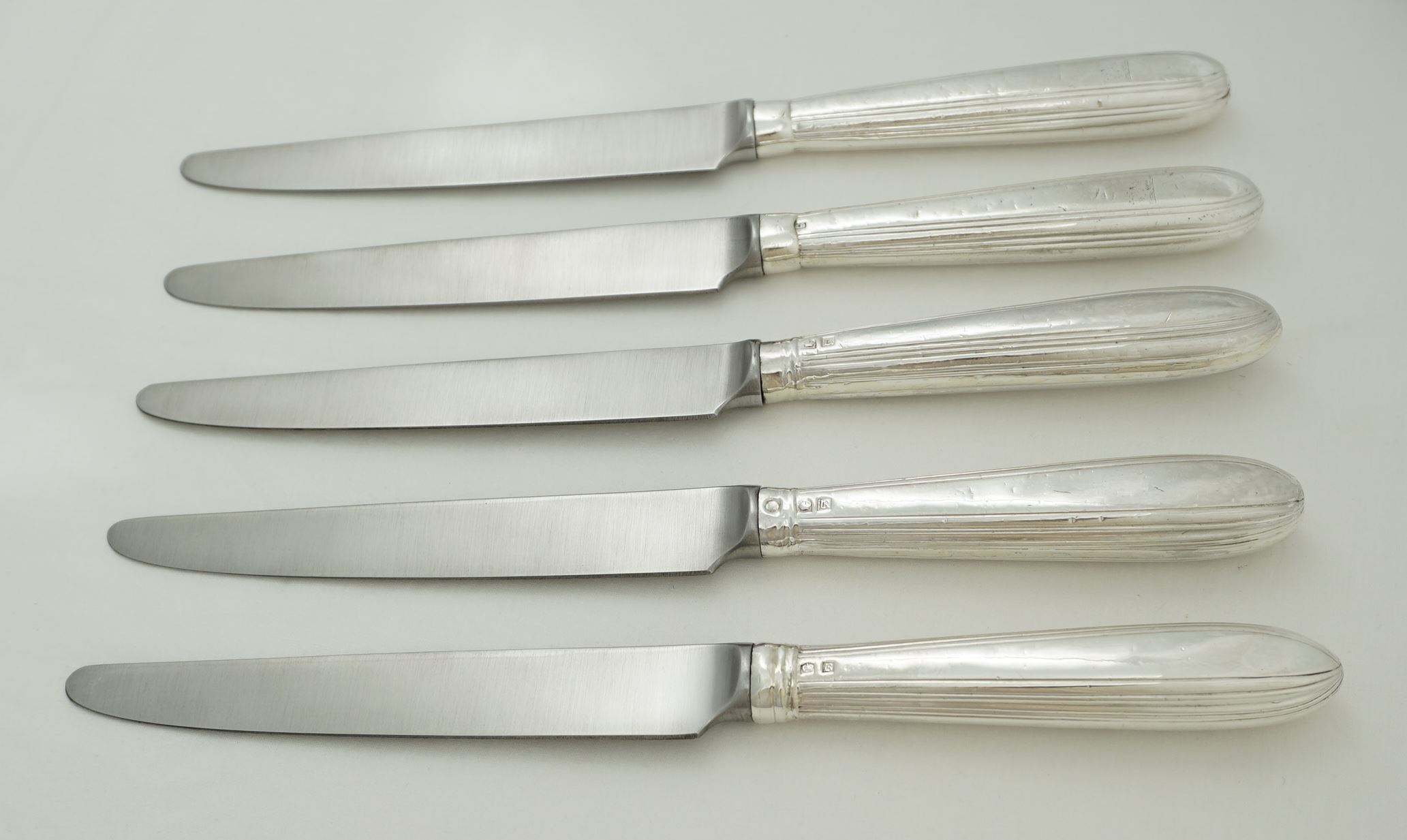 DESCRIPTION | Five, actually three and two very similar, Pointed Old English & Double Thread Georgian Silver Table Knives. All complete with new, never been used, satin finished Martensitic stainless steel blades fitted in the traditional way using pine pitch. All are a good weight and feel lovely in the hand. |