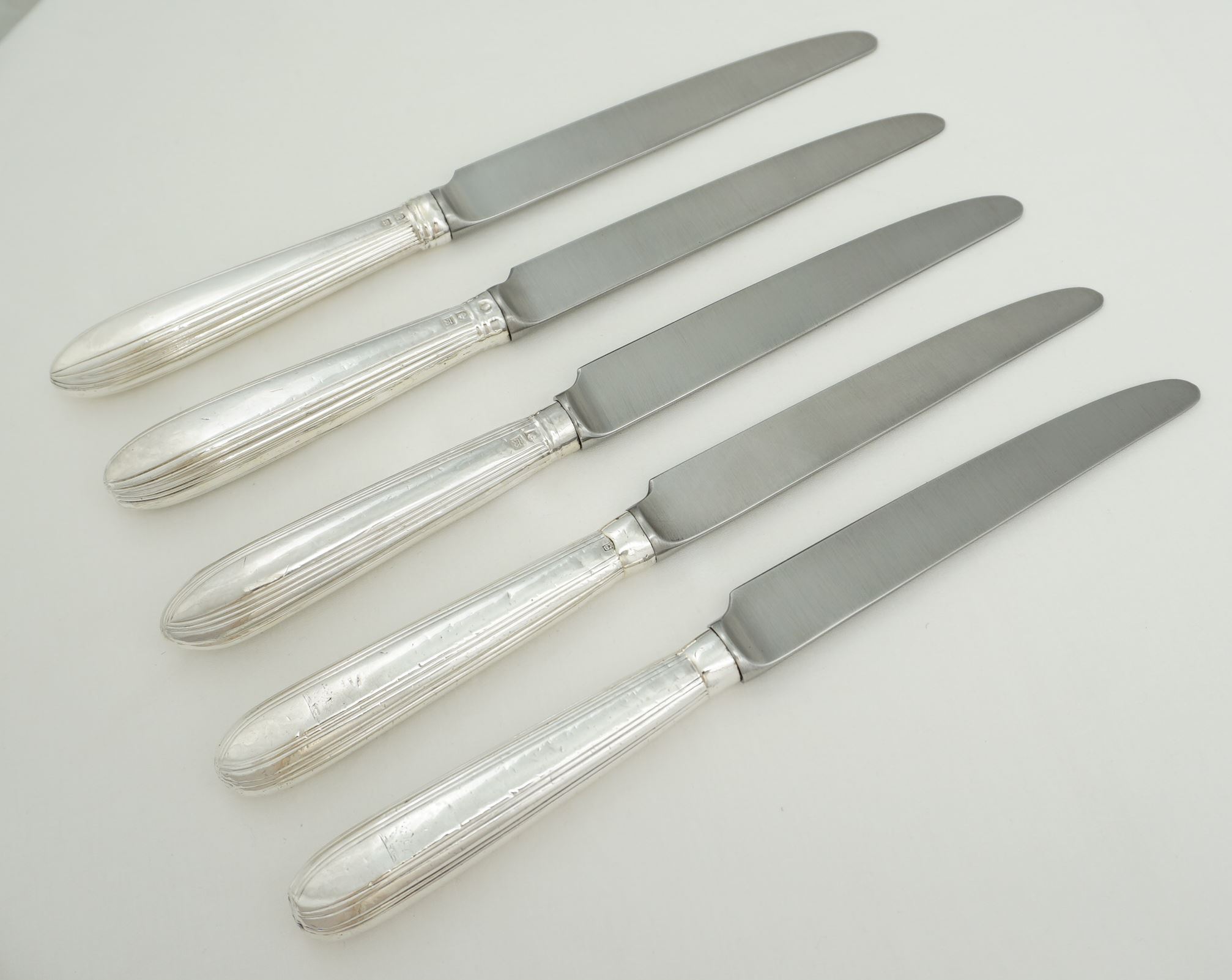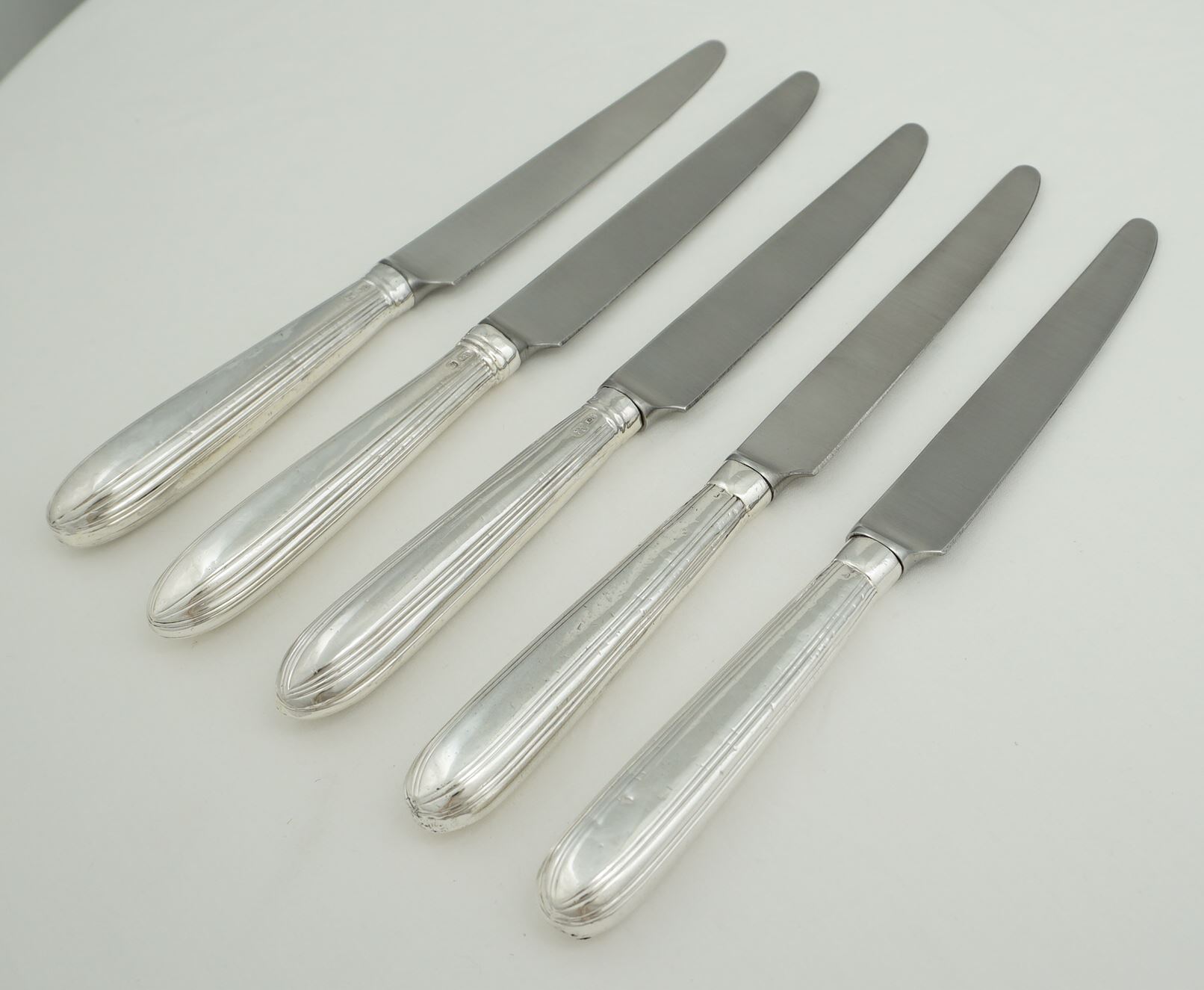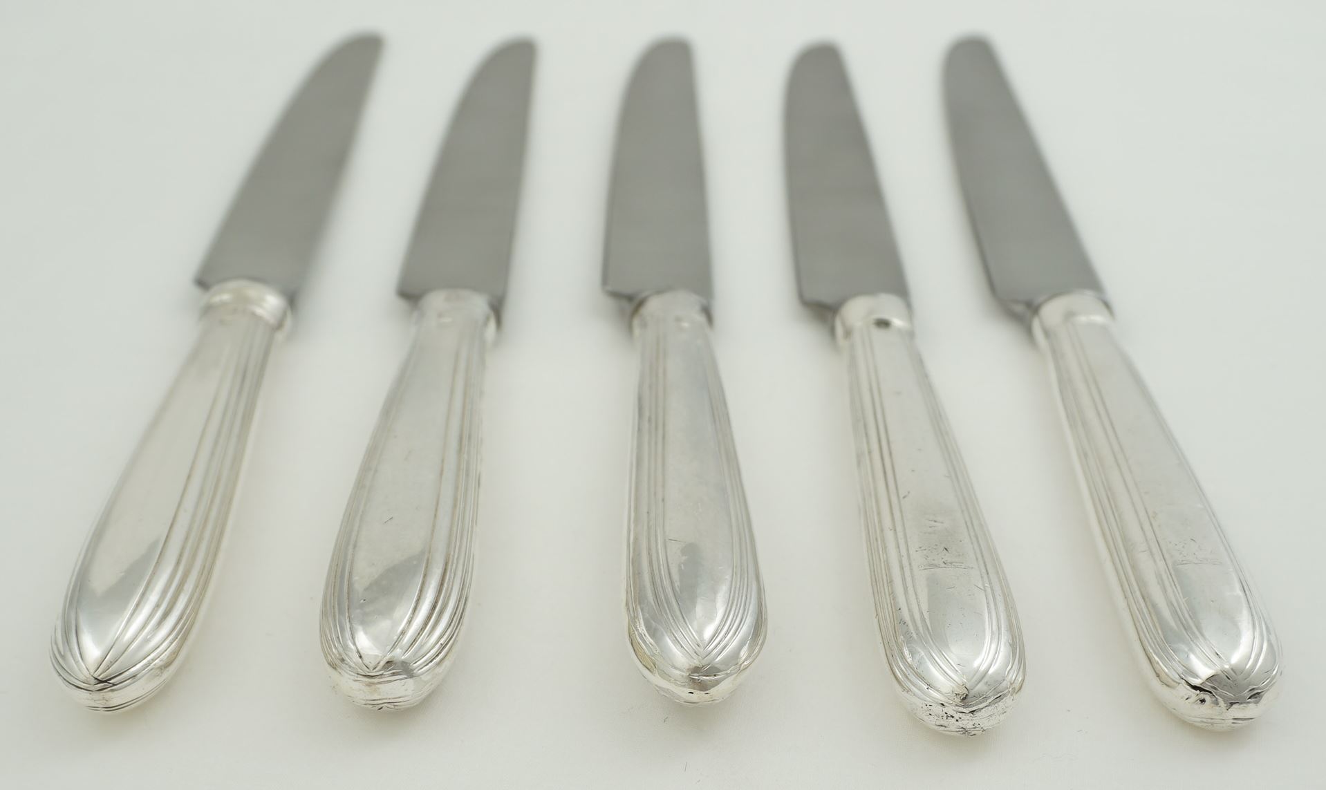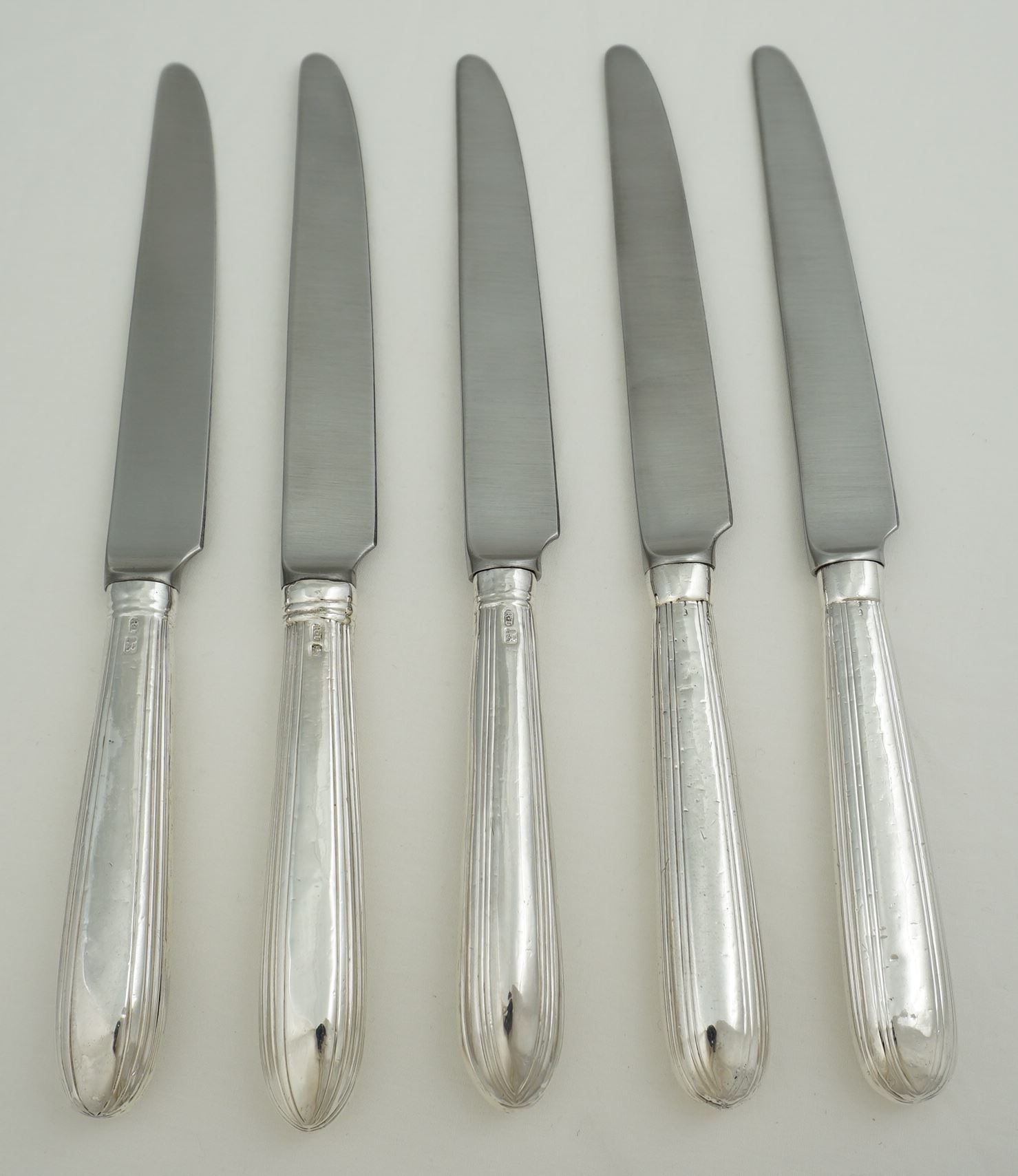 DESCRIPTION | Five, actually three and two very similar, Pointed Old English & Double Thread Georgian Silver Table Knives. All complete with new, never been used, satin finished Martensitic stainless steel blades fitted in the traditional way using pine pitch. All are a good weight and feel lovely in the hand. |