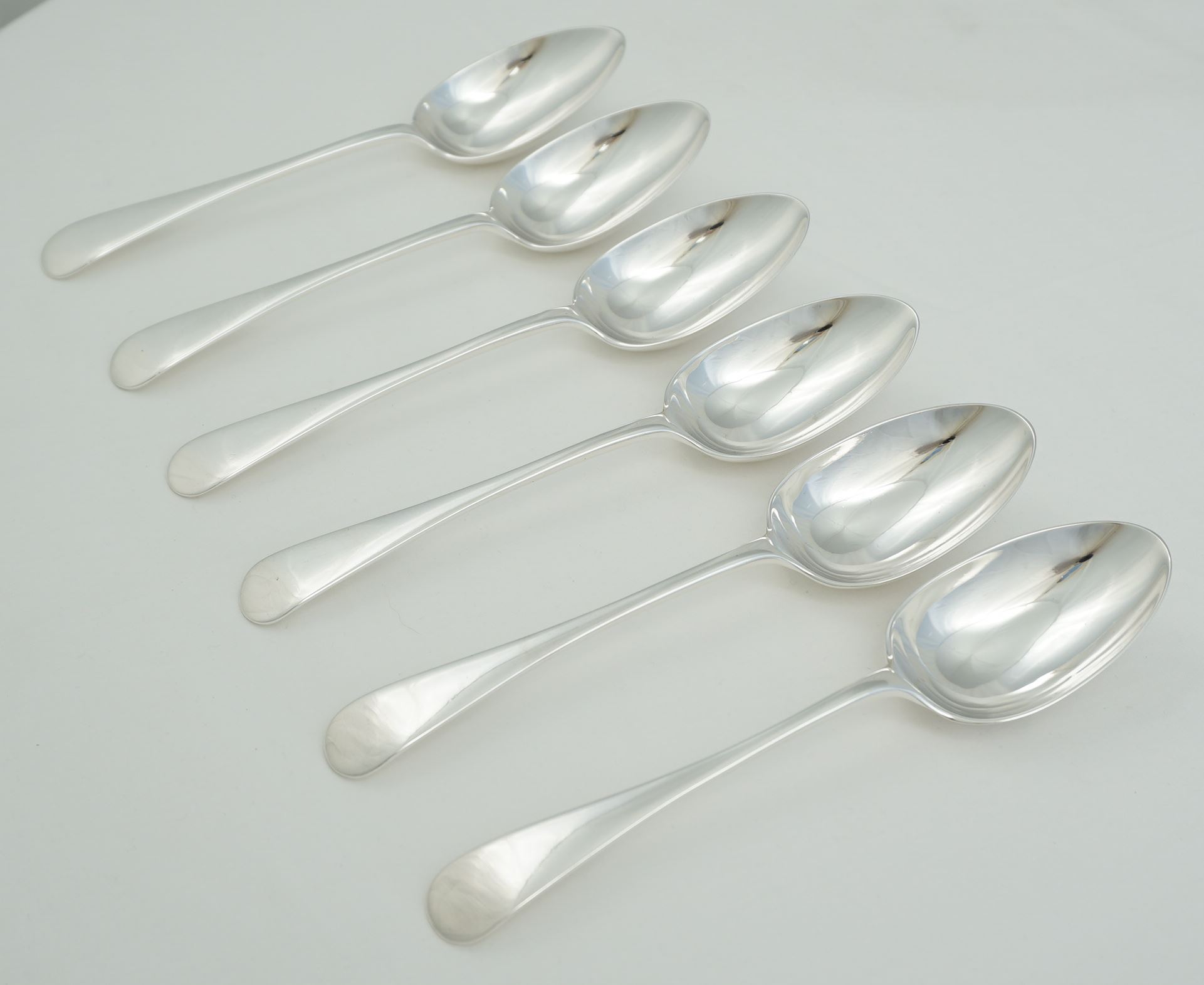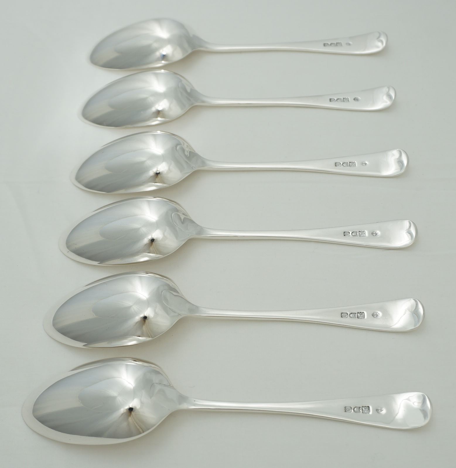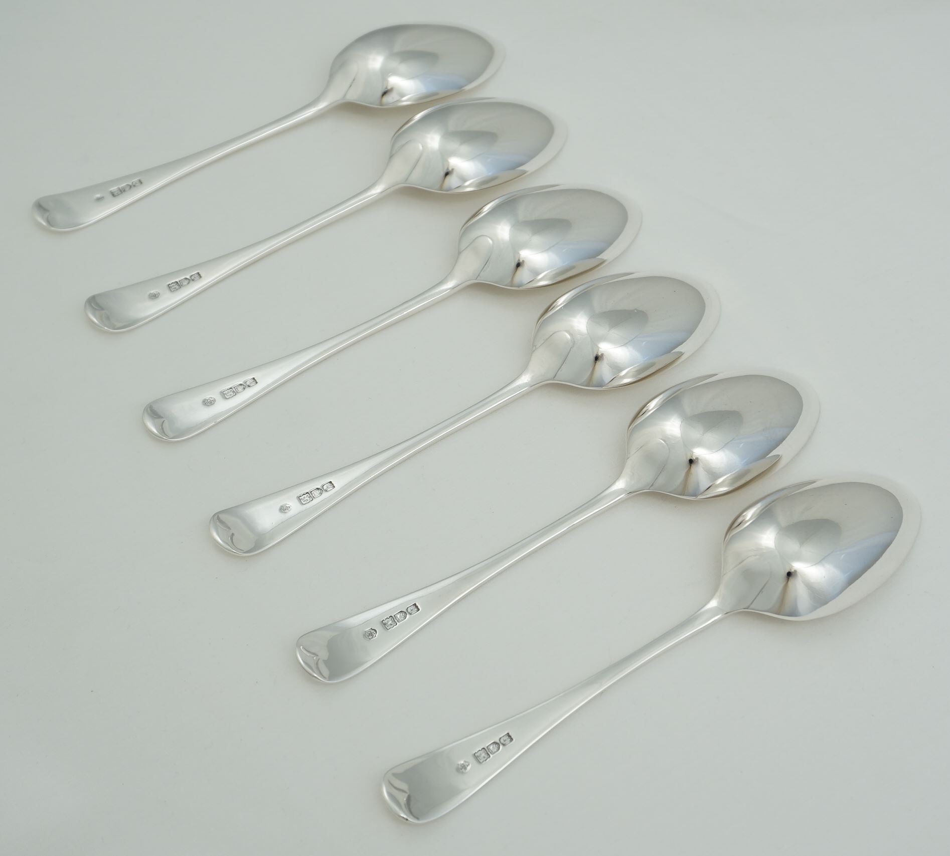 DESCRIPTION | Very good set of six antique English Edwardian solid sterling silver Old English pattern dessert spoons with no engraving or erasure. |