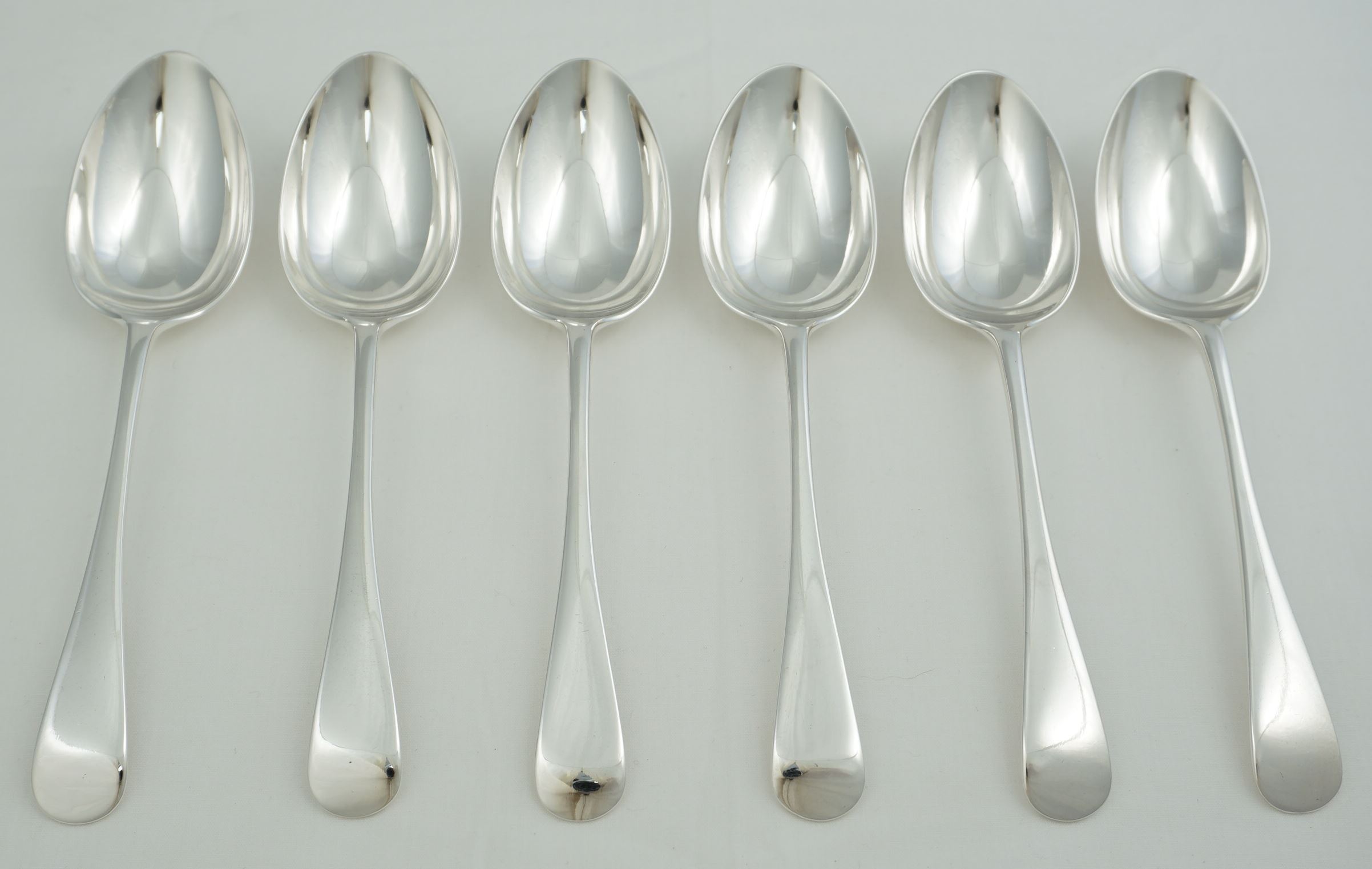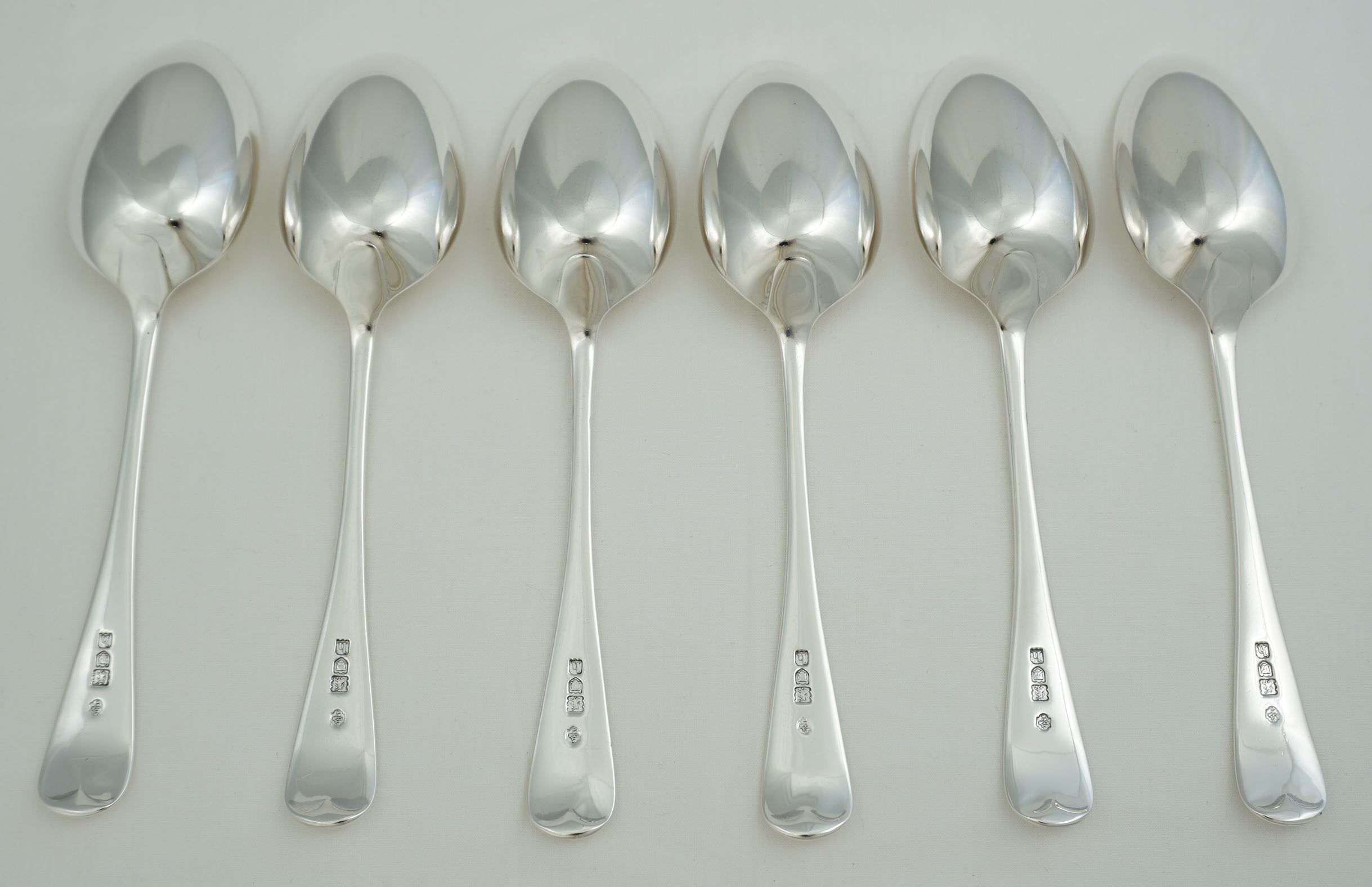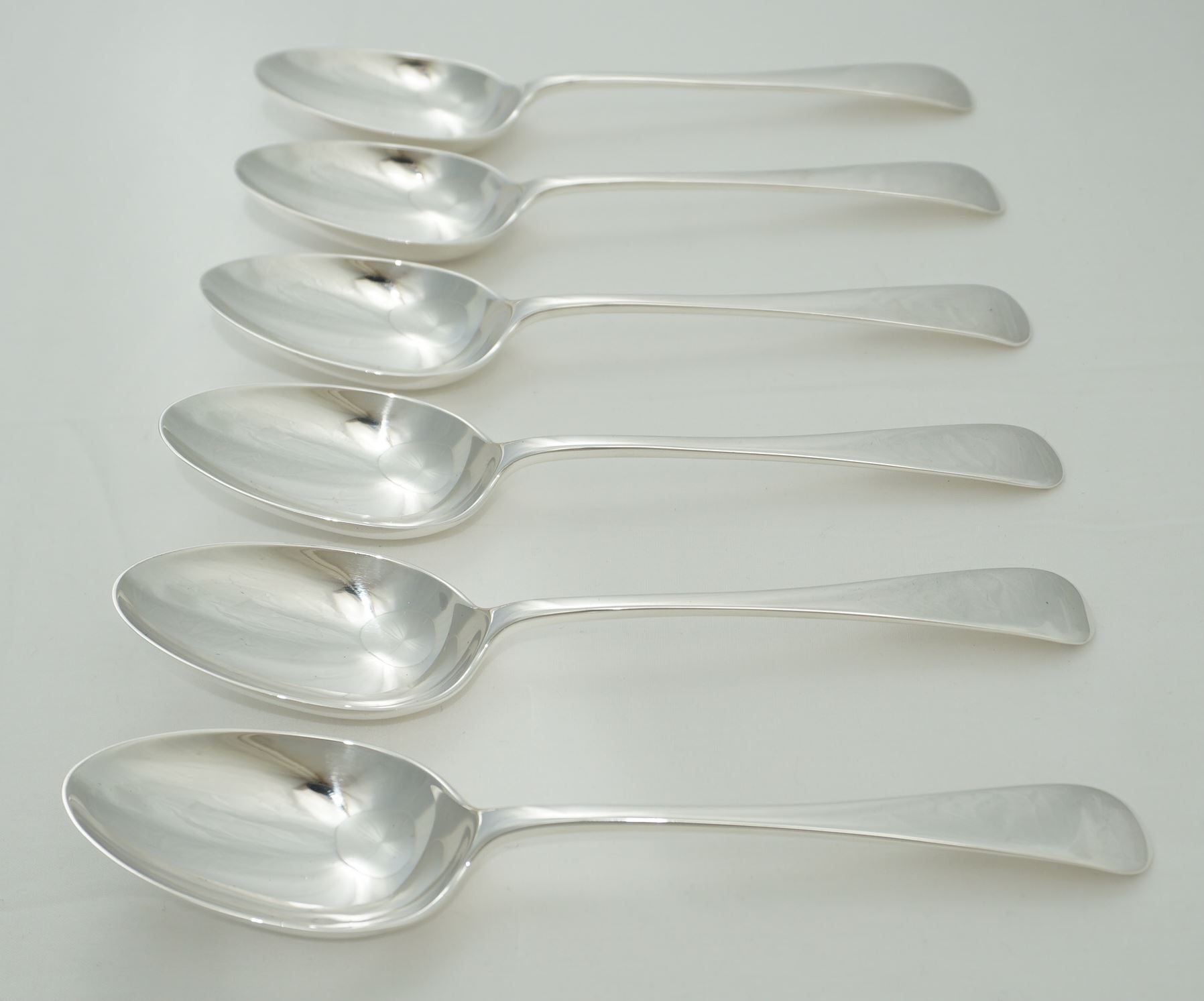 DESCRIPTION | Very good set of six antique English Edwardian solid sterling silver Old English pattern dessert spoons with no engraving or erasure. |