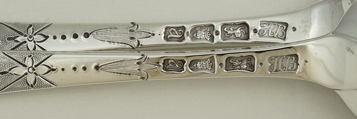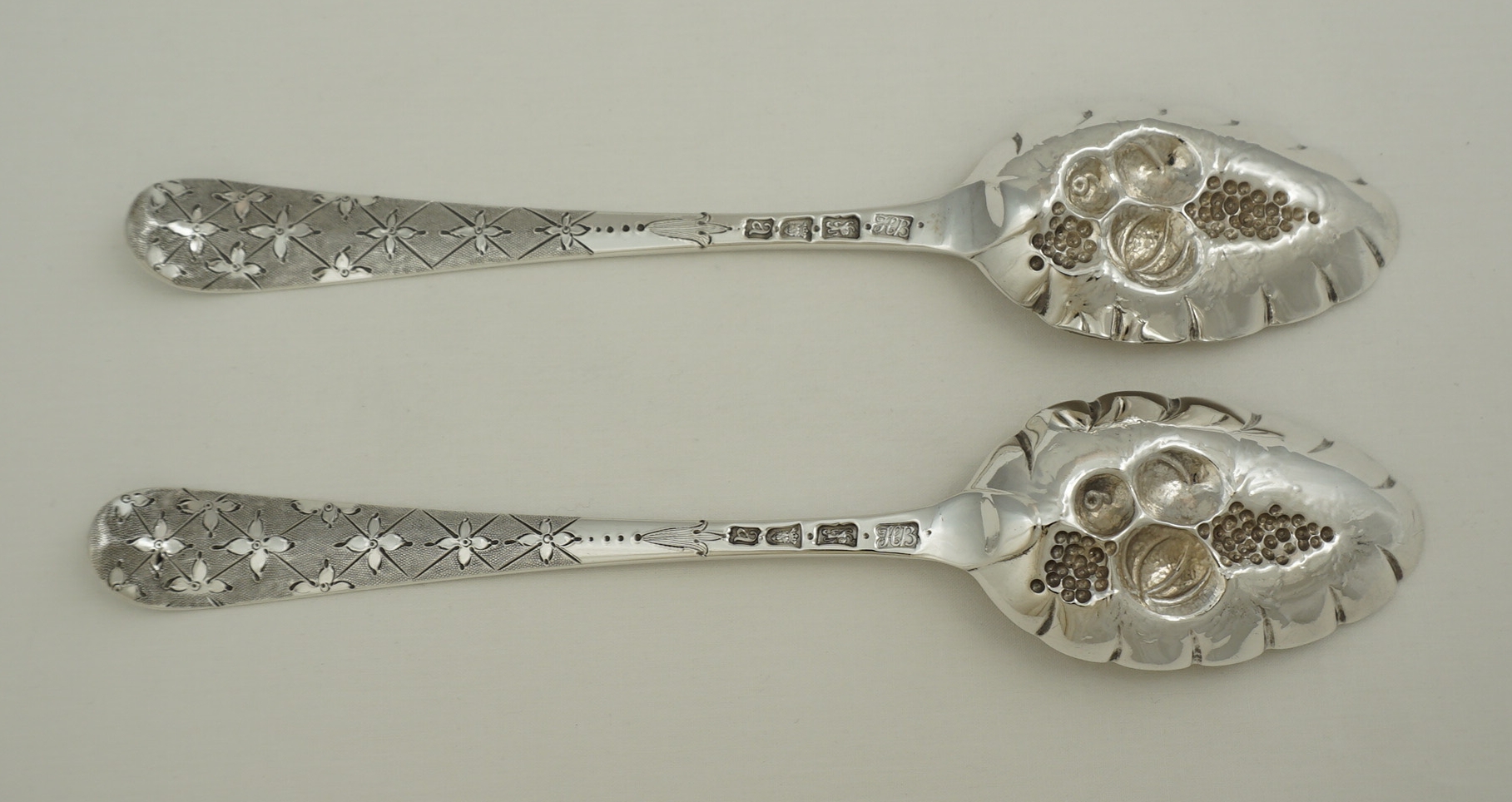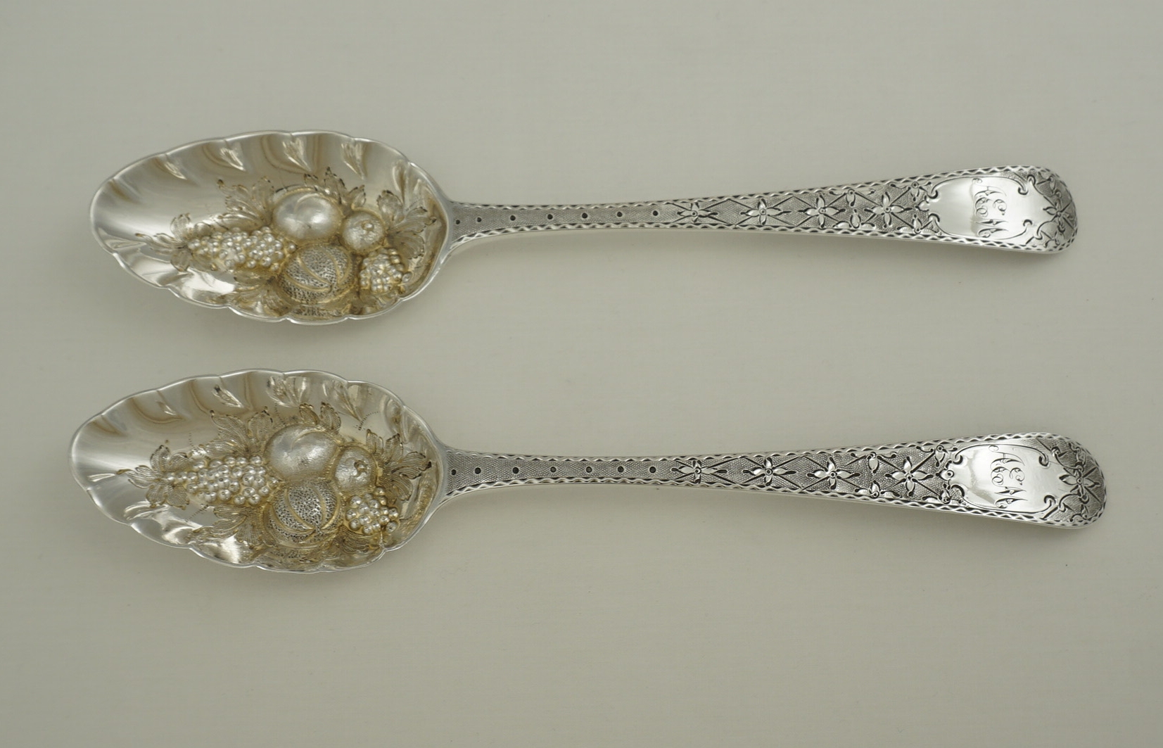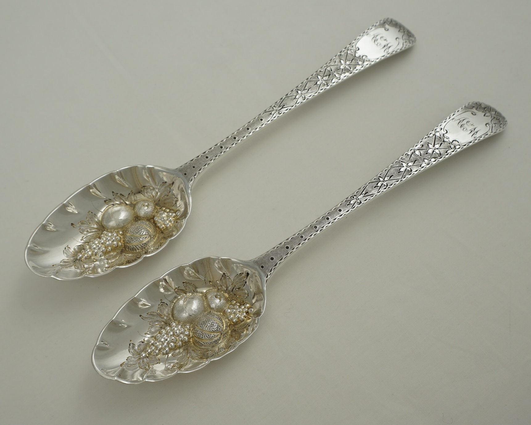 DESCRIPTION | Exceptionally good pair of antique English Georgian solid sterling silver Old English pattern 'Berry' spoons with frontal monogram engraving, lightly gilded bowls and beautiful hallmarks. Around 1890 the very best Hester Bateman spoons were decorated with the embossing, engraving and gilding. |