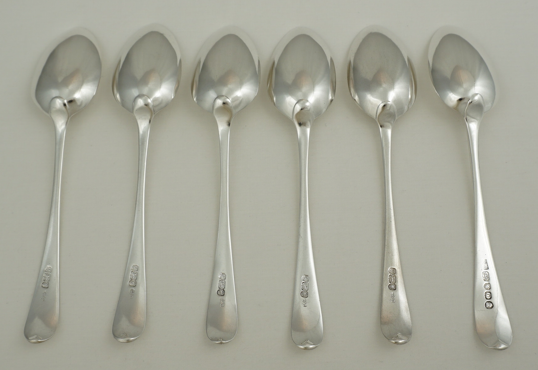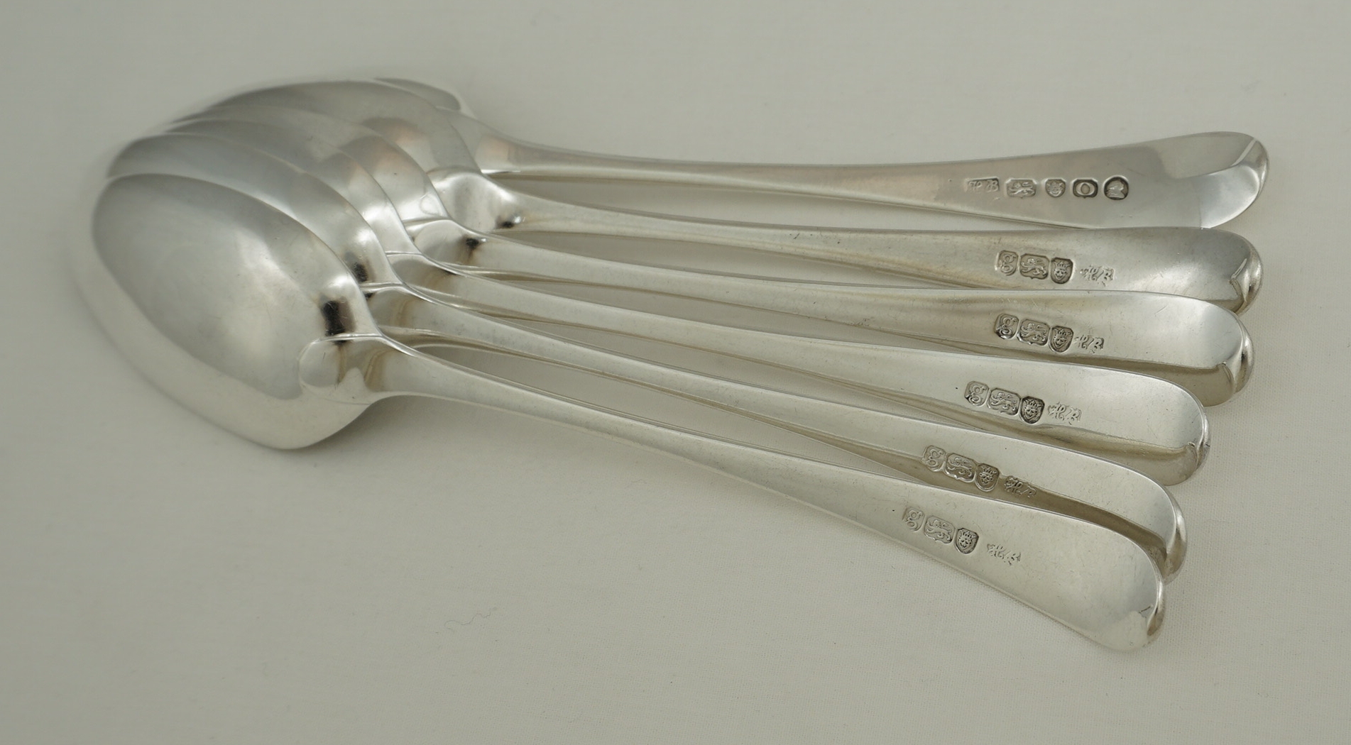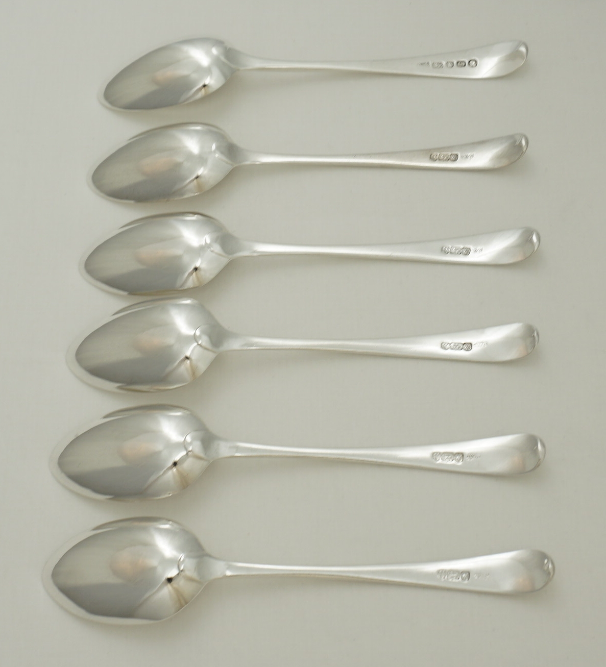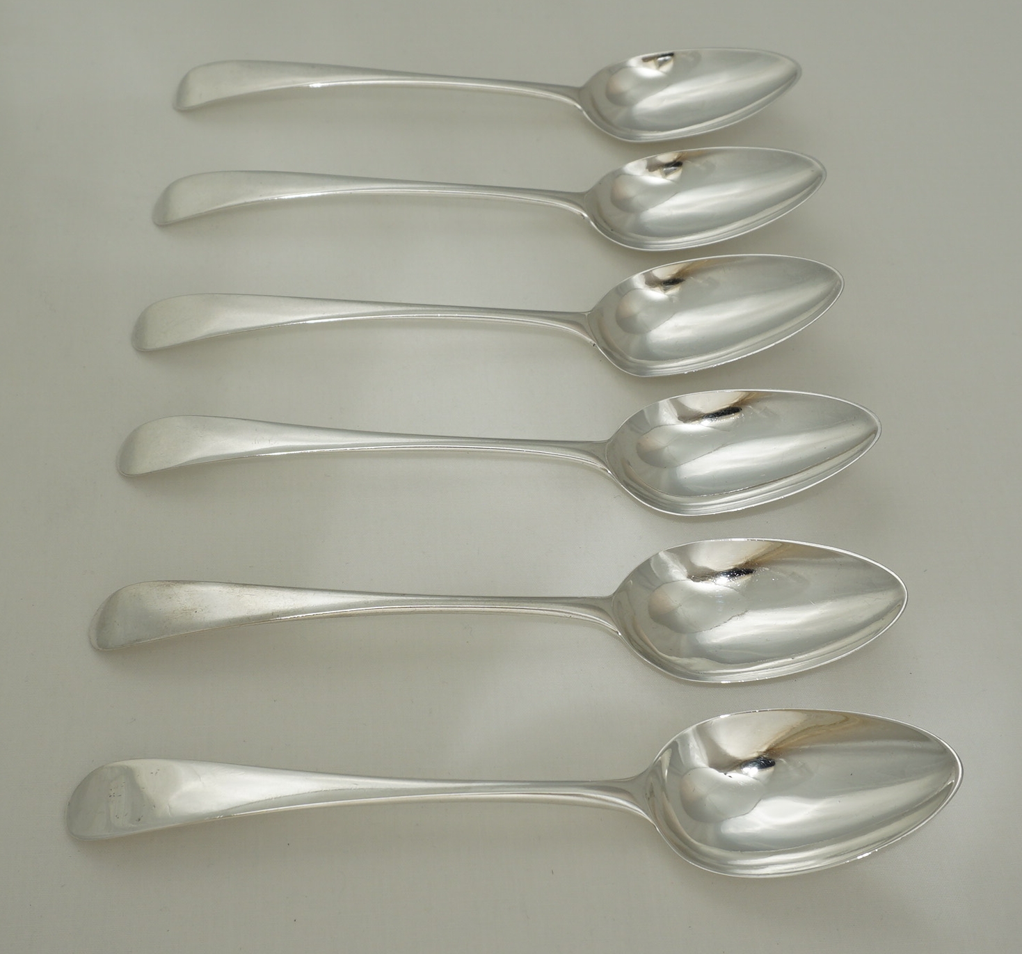 DESCRIPTION | Good set of six (actually 5+1) antique English Georgian solid sterling silver Old English pattern dessert spoons with no engraving and beautiful hallmarks. |
