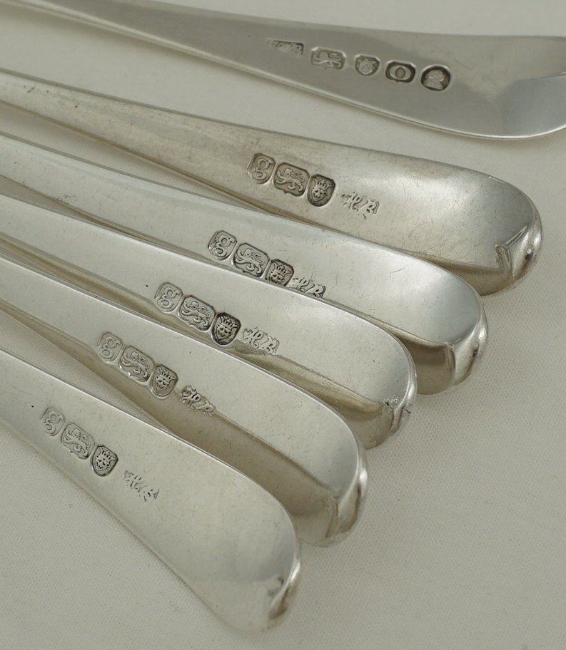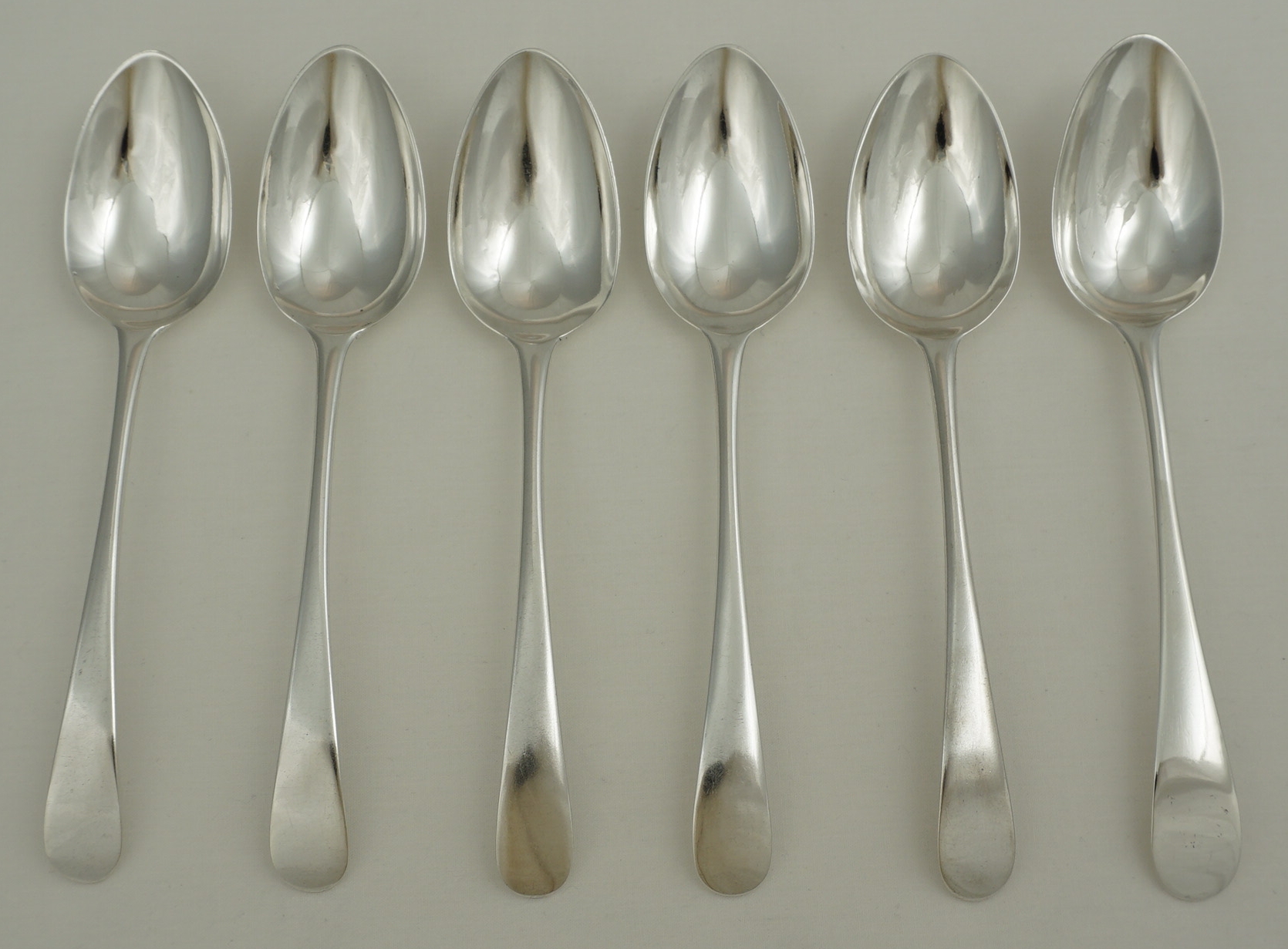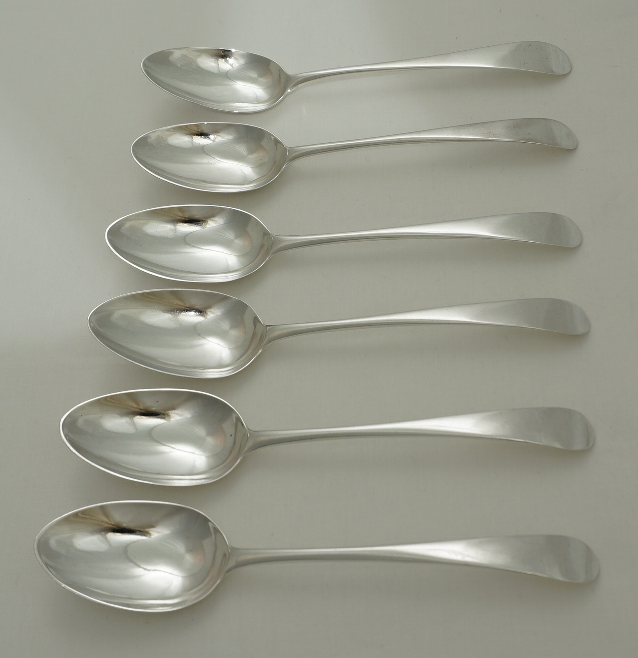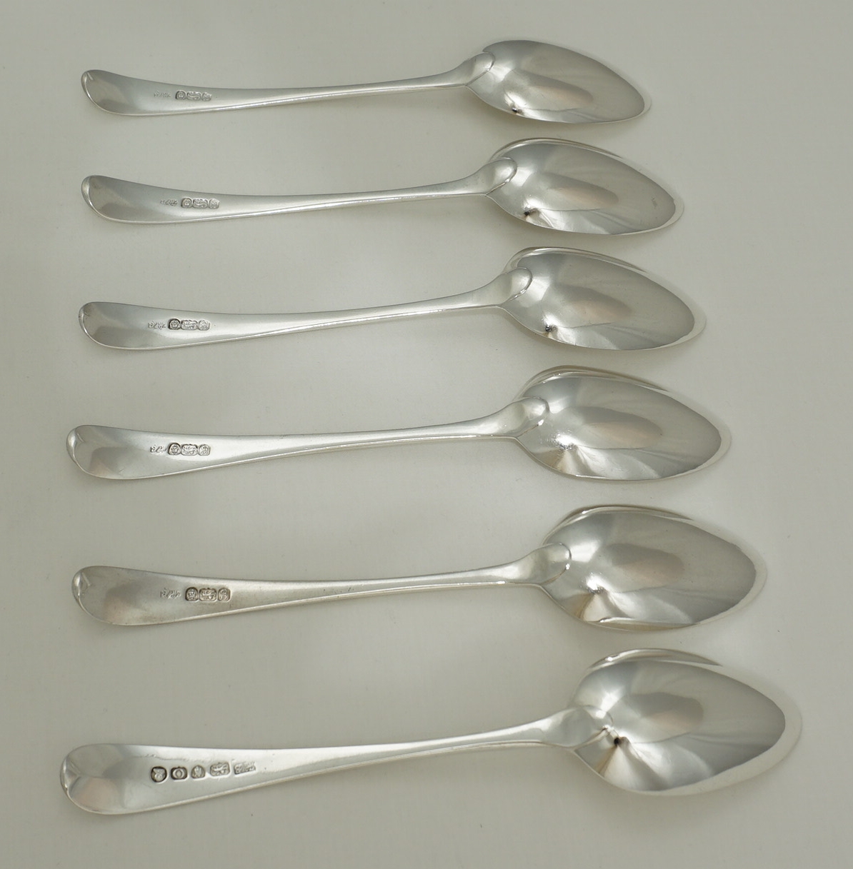DESCRIPTION | Good set of six (actually 5+1) antique English Georgian solid sterling silver Old English pattern dessert spoons with no engraving and beautiful hallmarks. |