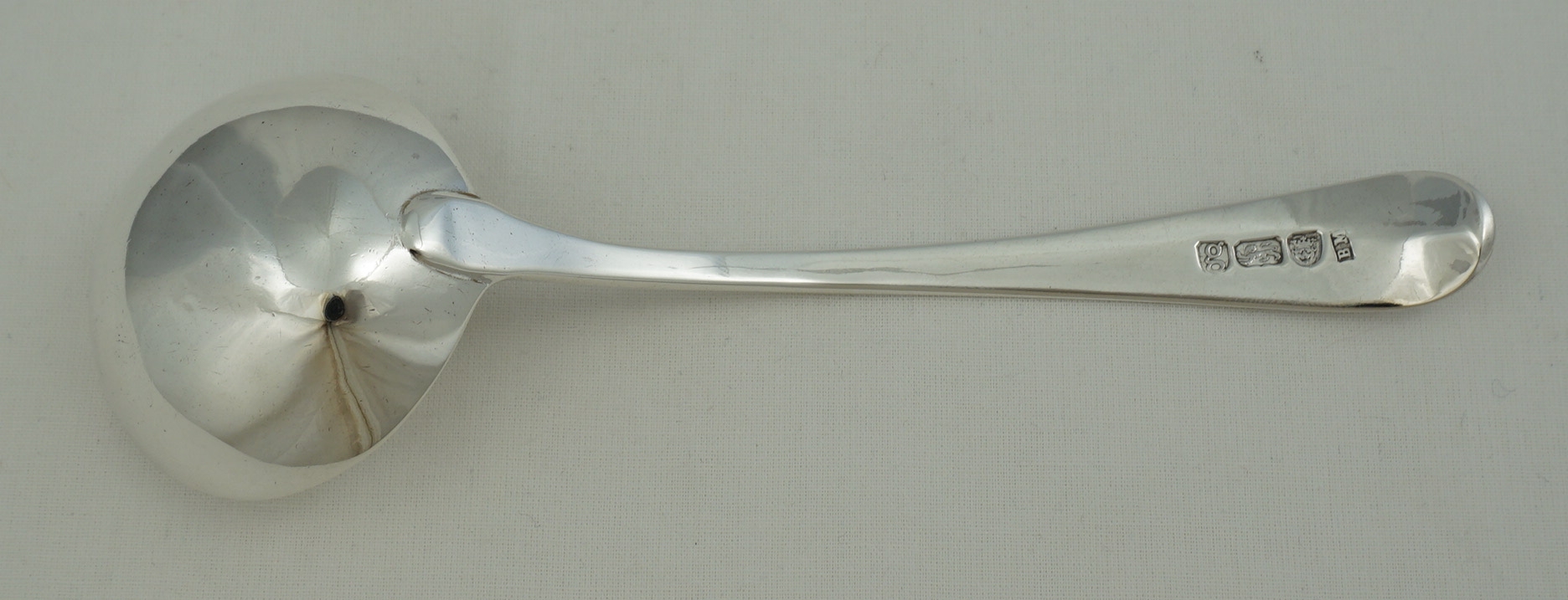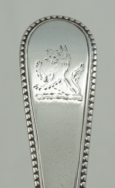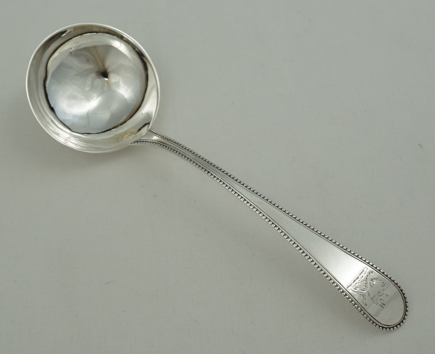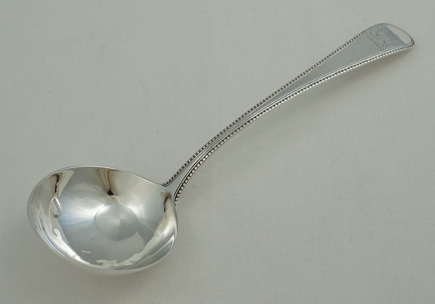 DESCRIPTION | Antique English Georgian solid sterling silver Old English Bead pattern sauce ladle with the original frontal crest engraving. |