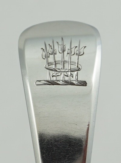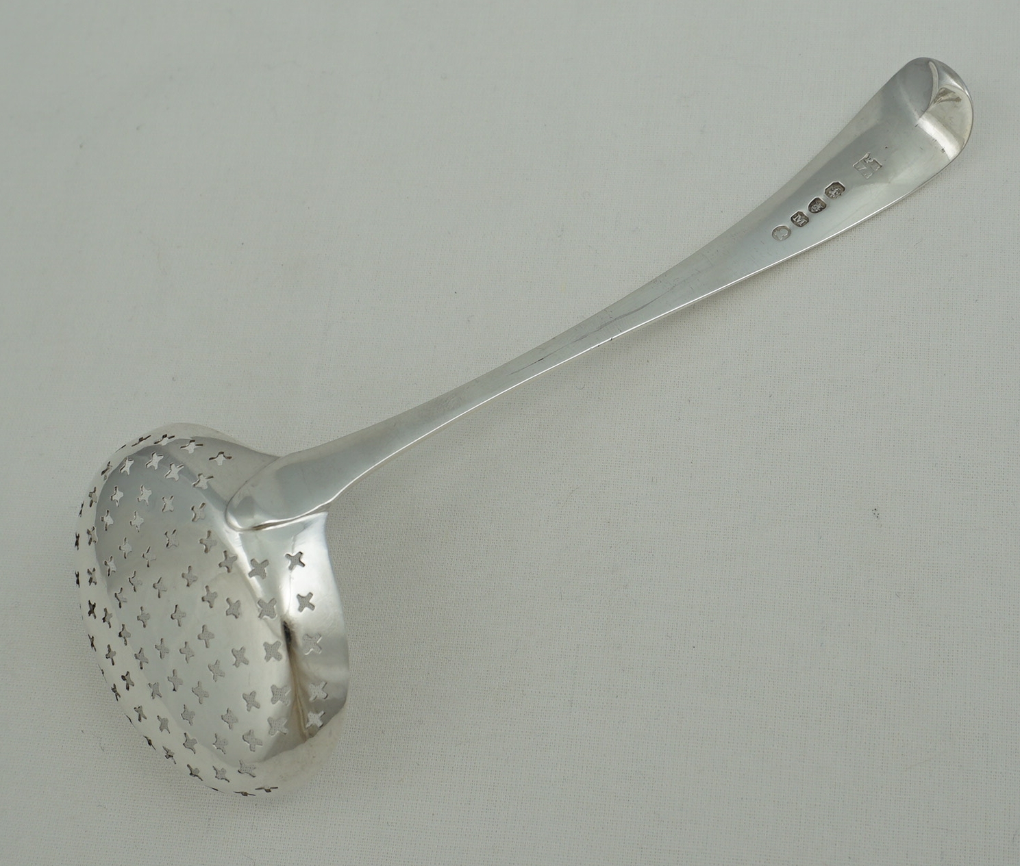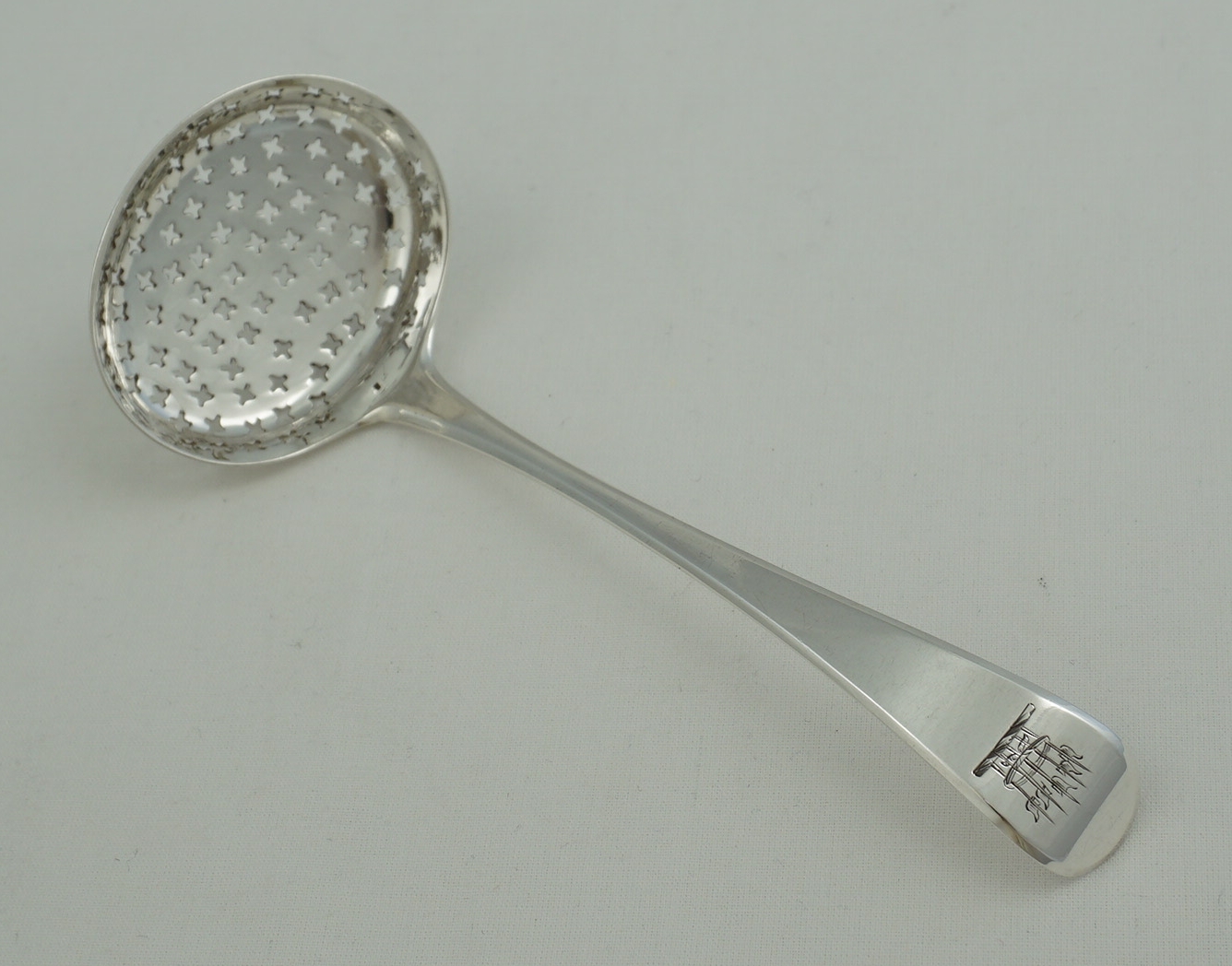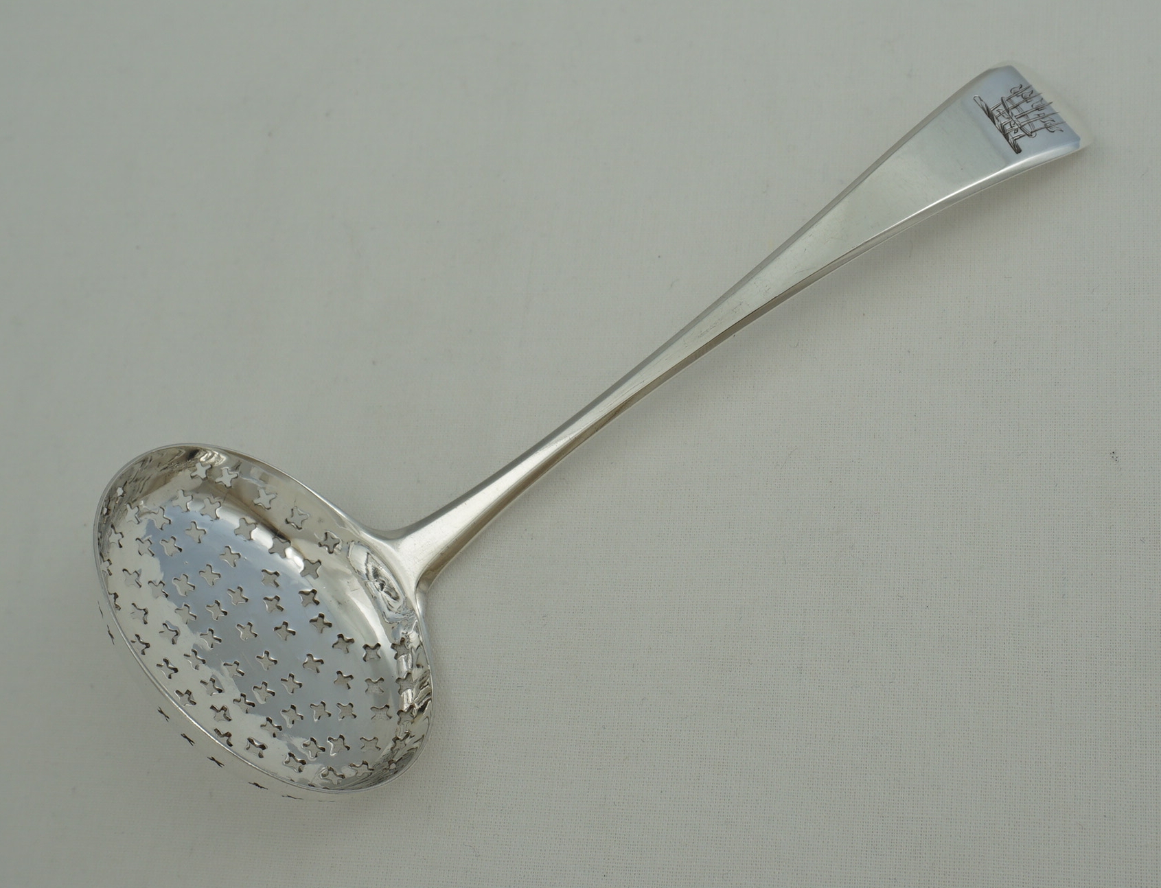 DESCRIPTION | Very good antique English Georgian solid sterling silver Old English pattern sifter ladle with a nice and original frontal crest engraving. |