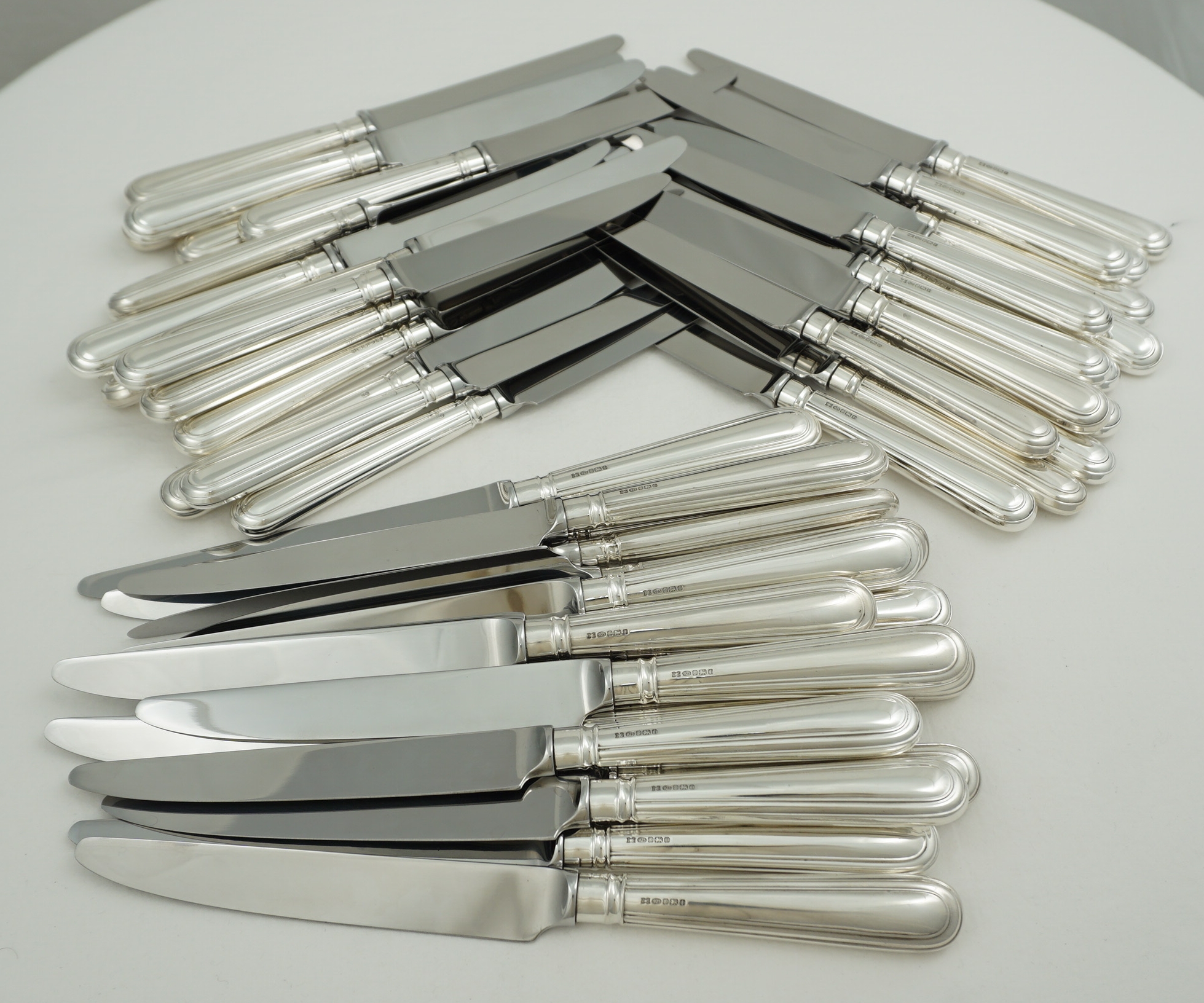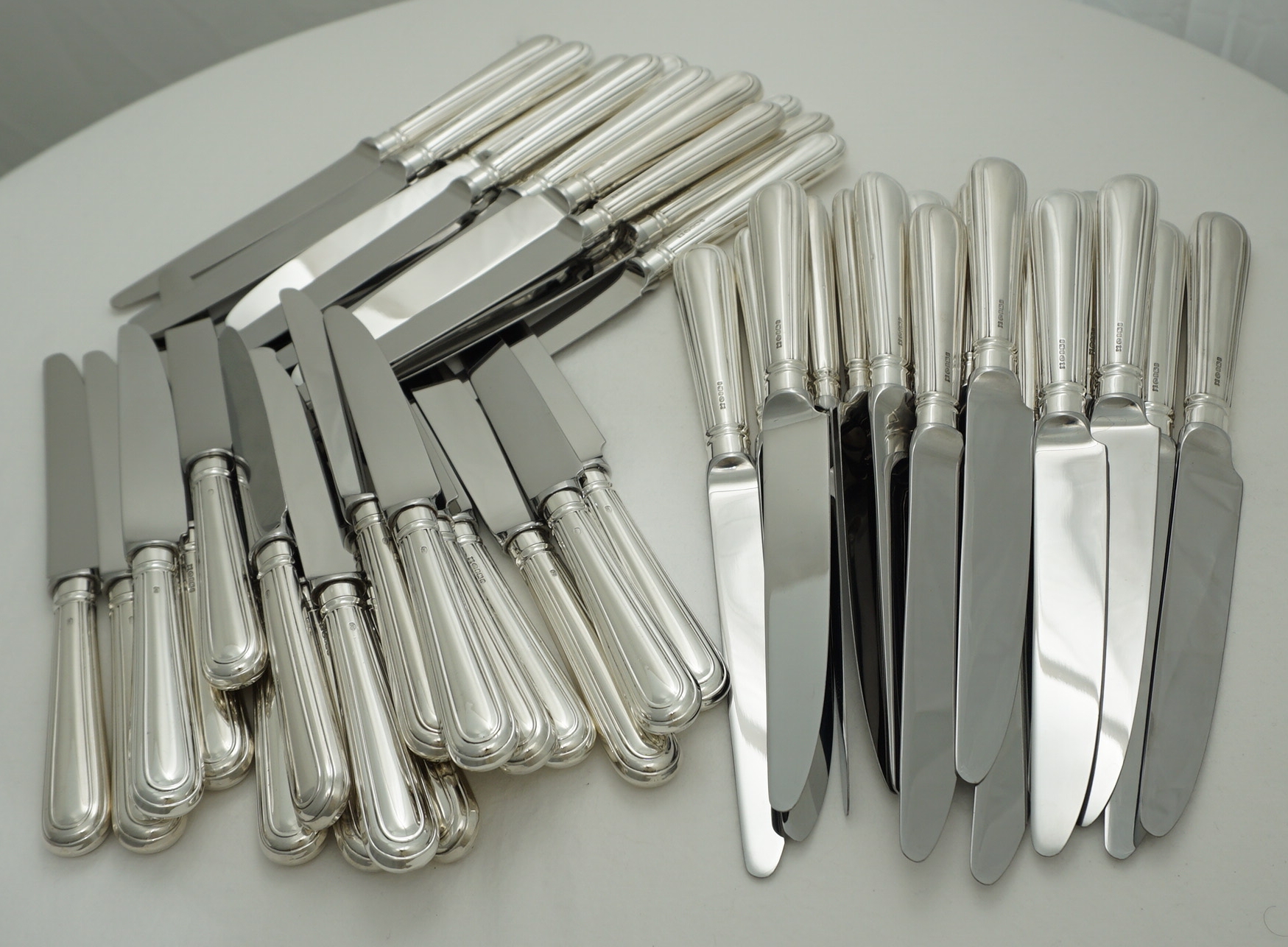| DESCRIPTION | High quality and useful set of loaded sterling silver Old English & Thread pattern handled knives with Sheffield made mirror finished stainless steel blades. Ideal yet hard to find combination of sixteen large main course knives and thirty-two smaller starter/salad/dessert/cheese knives. Similar knives are available new from Carrs at £327 each for the large and £291 each for the smaller, totalling £14,544. |