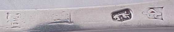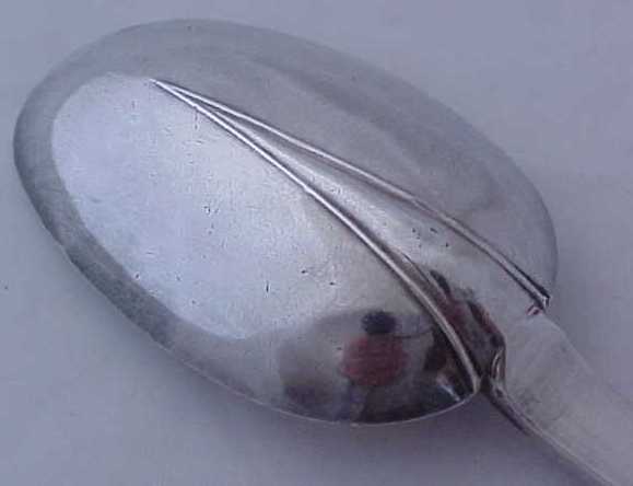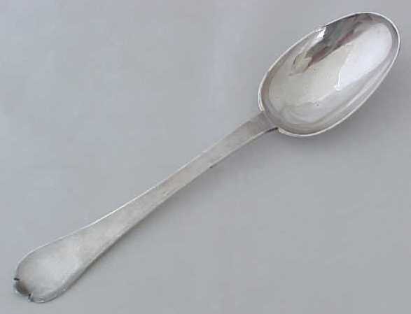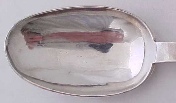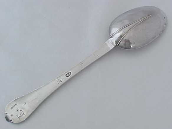 Exceptionally good William III silver trefid spoon with a long, ribbed rat-tail and contemporary initials. The original skin, sometimes called patina, is complete except for where the initials have been engraved and a small area around the bowl tip. This is exactly what you would expect from a lightly used spoon in completely original condition. The engraver of the contemporary initials would have polished off the rough edges after engraving and this accounts for a lighter patch in this area. Very, very slight wear to the bowl tip has worn away the skin in this small area. The rectangular section stem is thick and still bears the original maker's file marks along the sides towards the bowl. Some wear to the Britannia mark and the maker's is apparent but expected as this is exactly where the index finger sits when using the spoon. Luckily all marks are still clearly legible. Quite extraordinary to find a spoon over three hundred years old in totally original condition. |