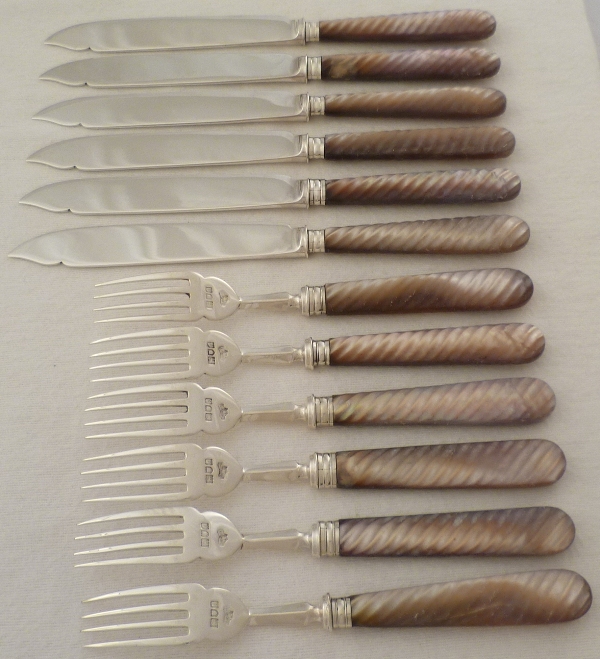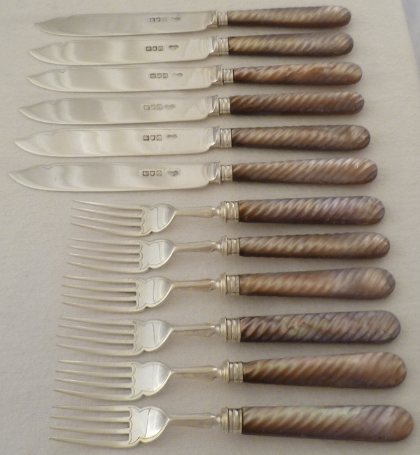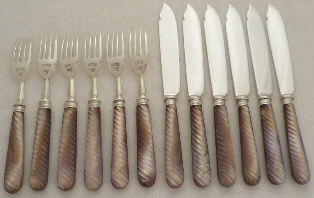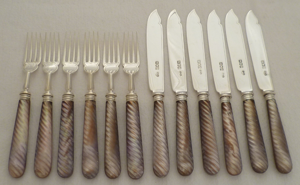 Set of twelve Edwardian silver fish eaters (six knives + six forks) with carved spiral twist mother of pearl handles. The mother of pearl is a very unusual purple/orange colour and has a slightly matt surface, probably from