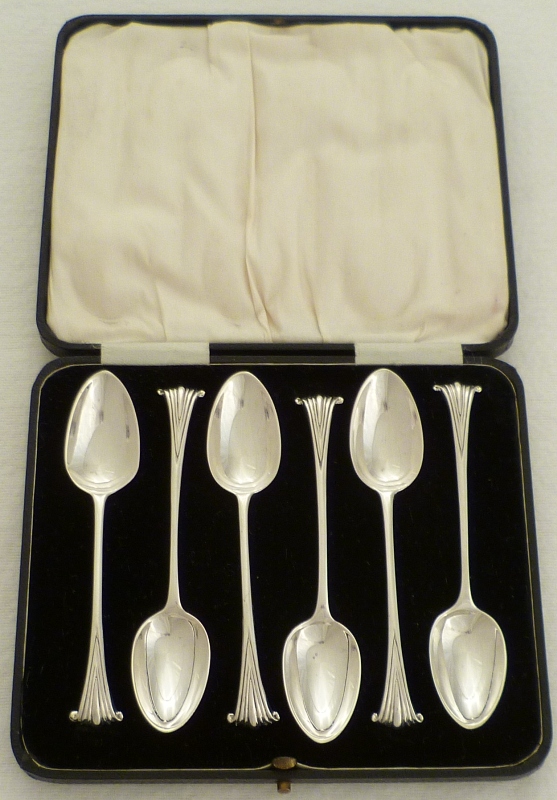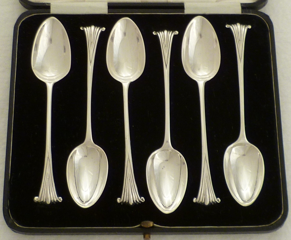 DESCRIPTION | Good set of six Victorian silver Onslow pattern demitasse or coffee spoons. The replacement case is not a perfect fit. |