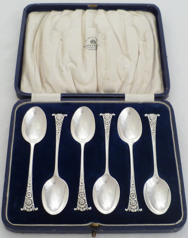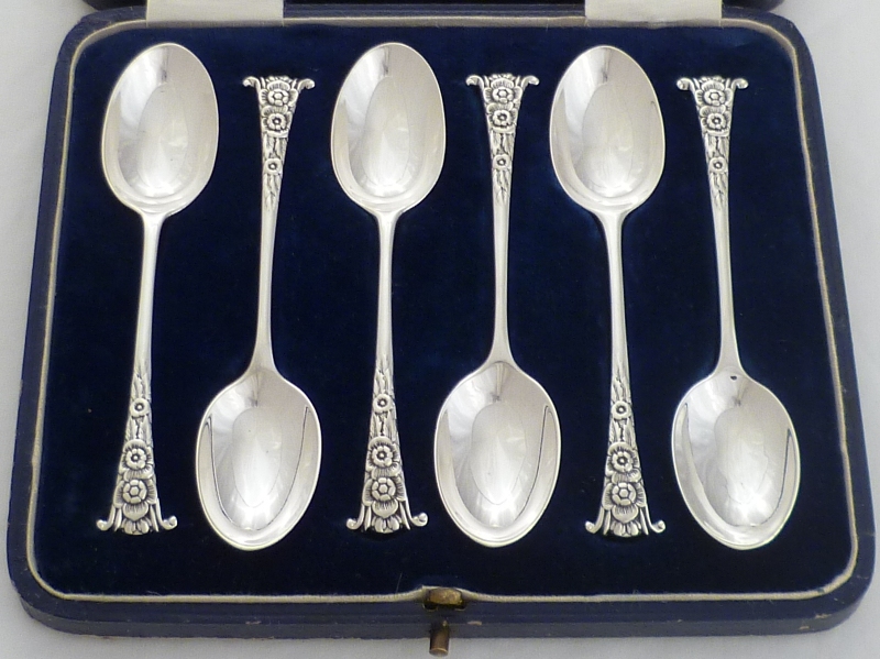 DESCRIPTION | Cased set of six Victorian silver Onslow variant pattern tea or coffee spoons. |
