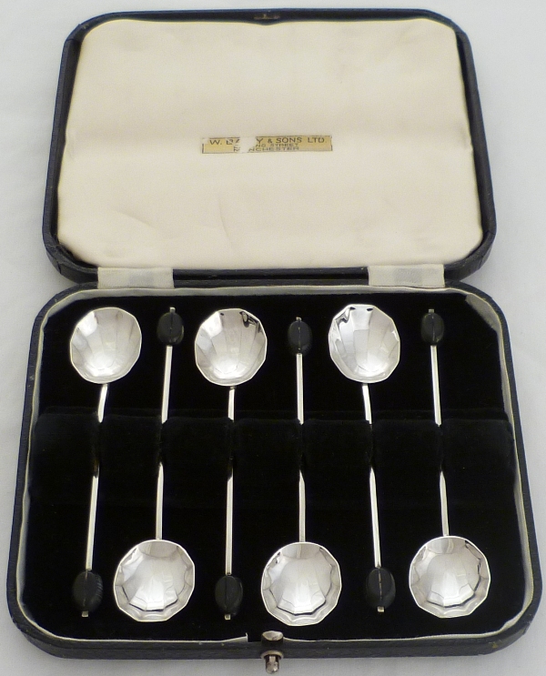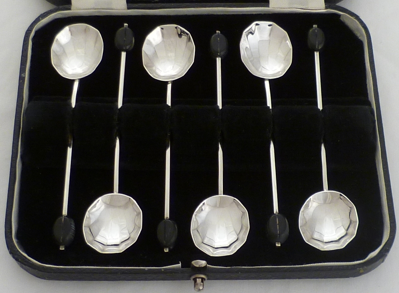 DESCRIPTION | Cased set of six silver coffee spoons with bean terminals and facetted bowls. |