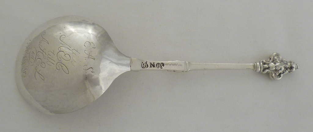 still know today. This goes a long way to explain the exceptionally good condition of this spoon and the engraving to the bowl back. The earliest initials are to the top and the style of lettering changes commensurately from early to late 18th