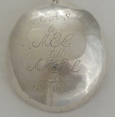 century and then the spoon fell out of use as the fashion changed to glasses. The Swedish 'till' translates as 'to' in English so we can see that four generations enjoyed this supping spoon before it fell out fashion and was left unused since around
