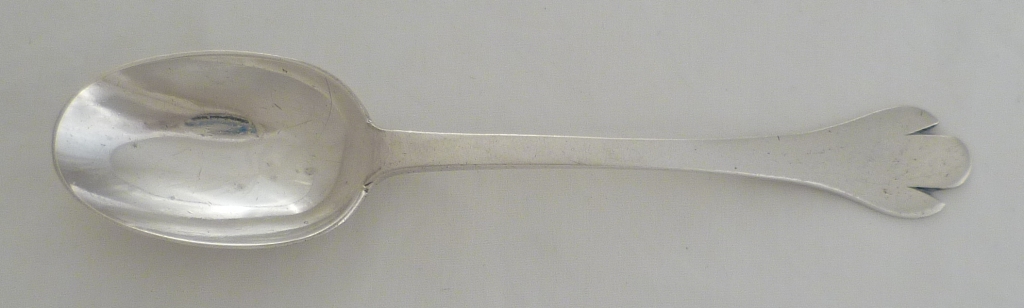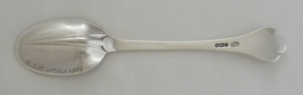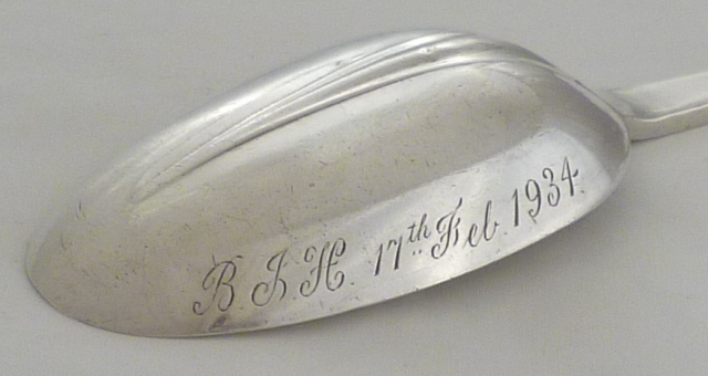 DESCRIPTION | Replica silver rat tailed Trefid spoon with an inscription to the rim of the bowl back. |