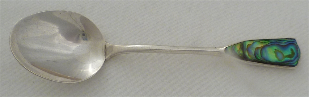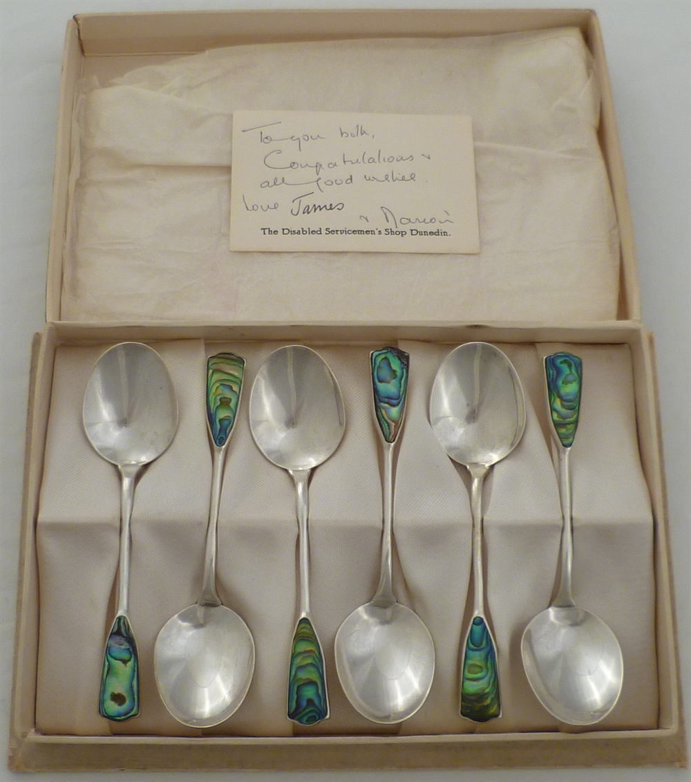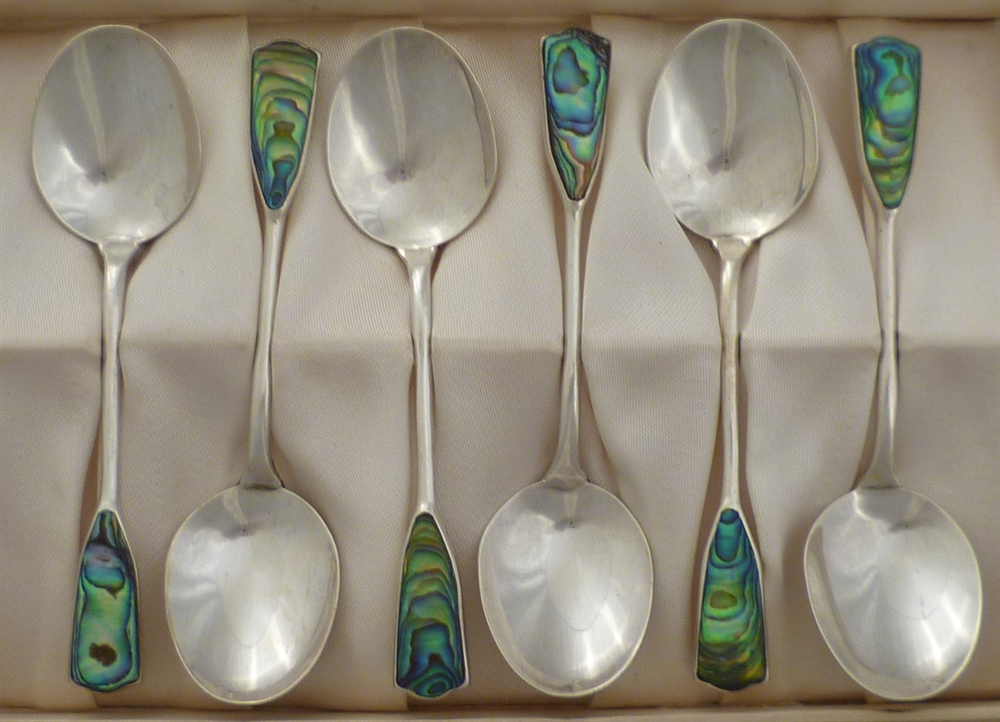 DESCRIPTION | Set of six silver spoons with abalone shell inset terminals complete with original box and presentation card. |