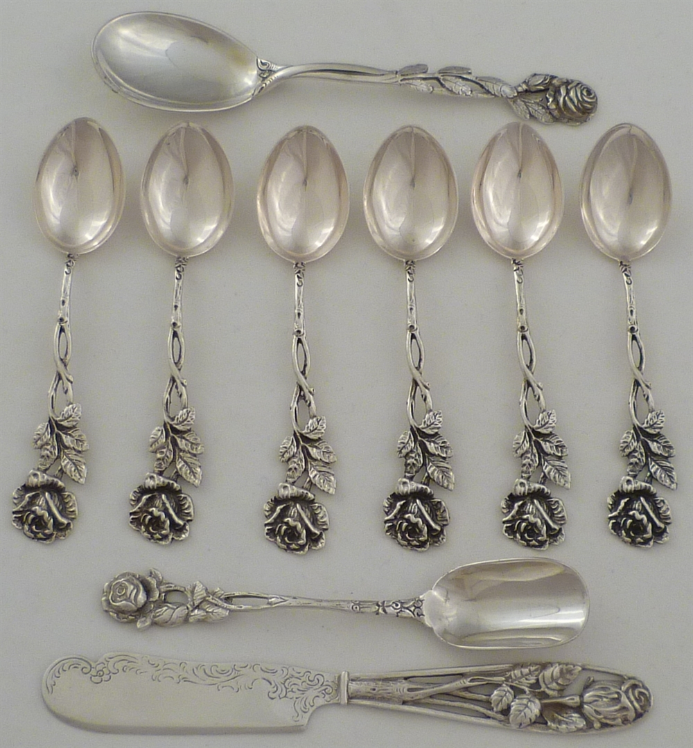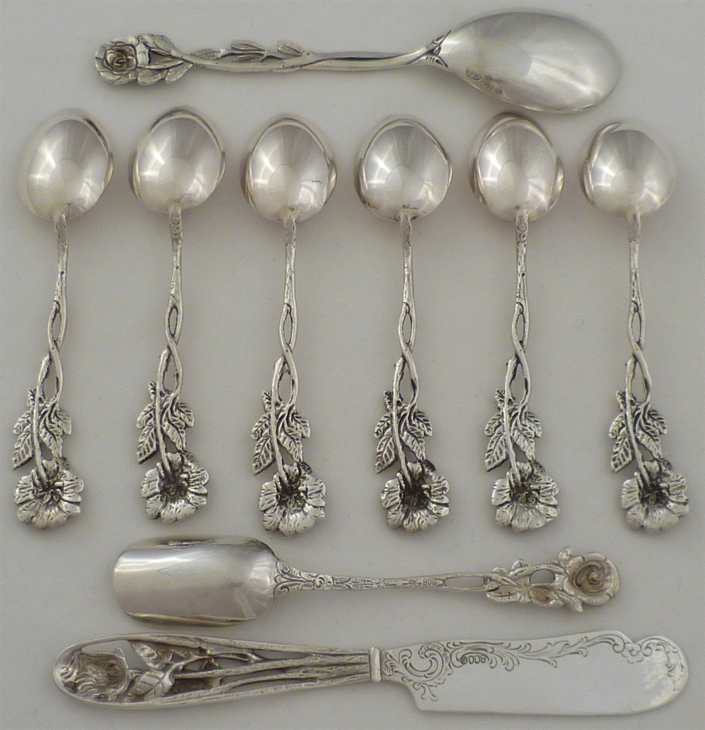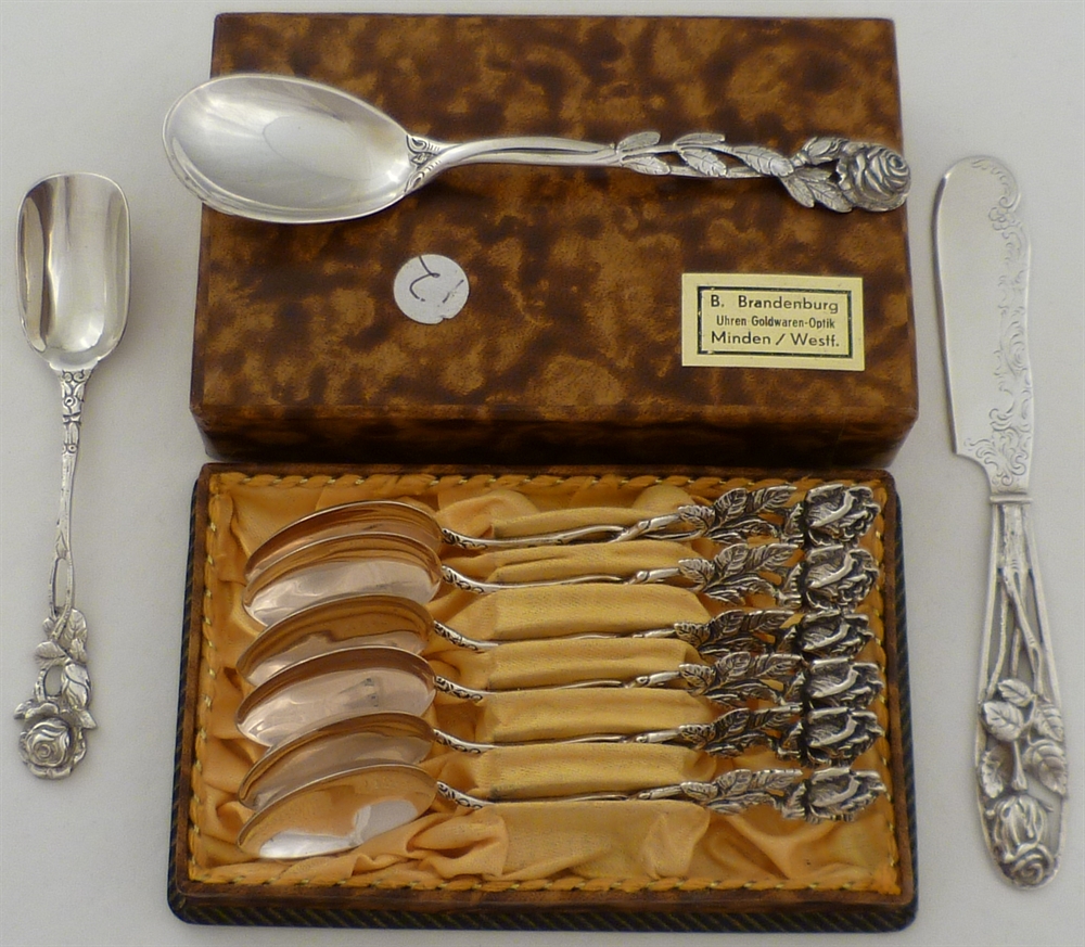 DESCRIPTION | Pretty collection of German silver with engraved and floral decoration comprising of six boxed coffee spoons, one sugar spoon, one preserve spoon and one butter knife. |