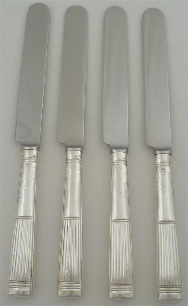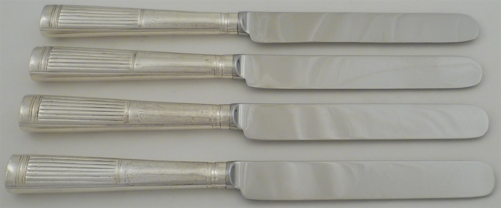 DESCRIPTION | Set of four Georgian table knives with loaded silver handles and mirror finished stainless steel blades. There is a faintly engraved crest to one side of each handle. |