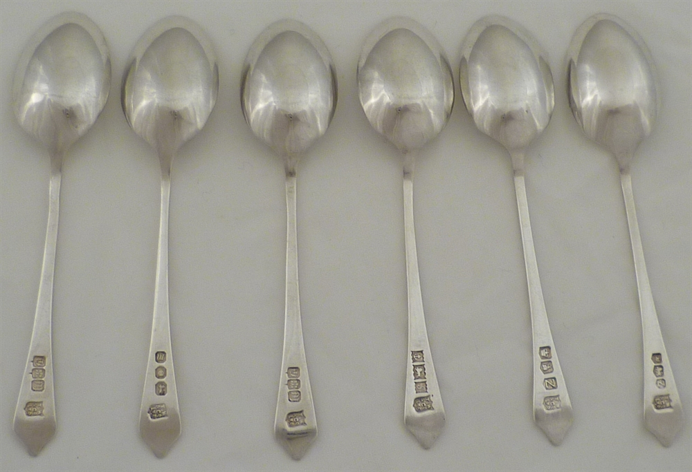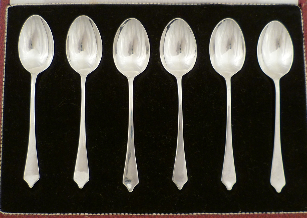 DESCRIPTION | Interesting and cased set of six solid silver Dog Nose coffee spoons. |