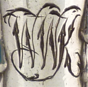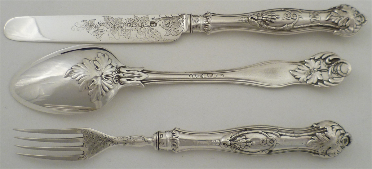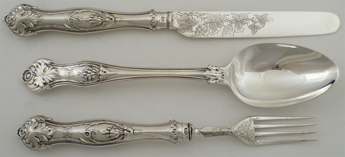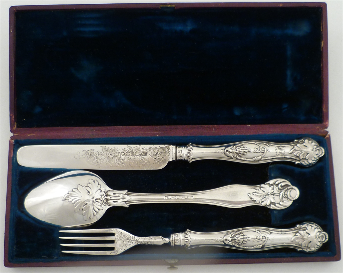 DESCRIPTION | Cased Victorian silver three piece child's set in a variant of vine pattern and with a monogram engraving. |