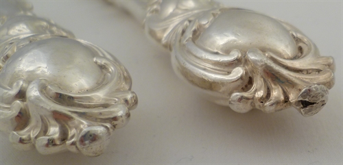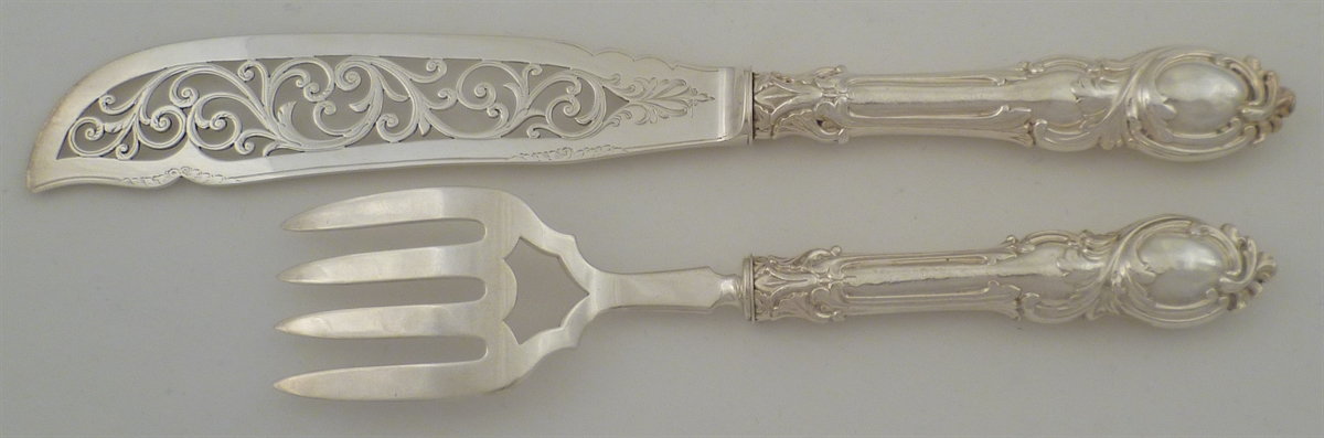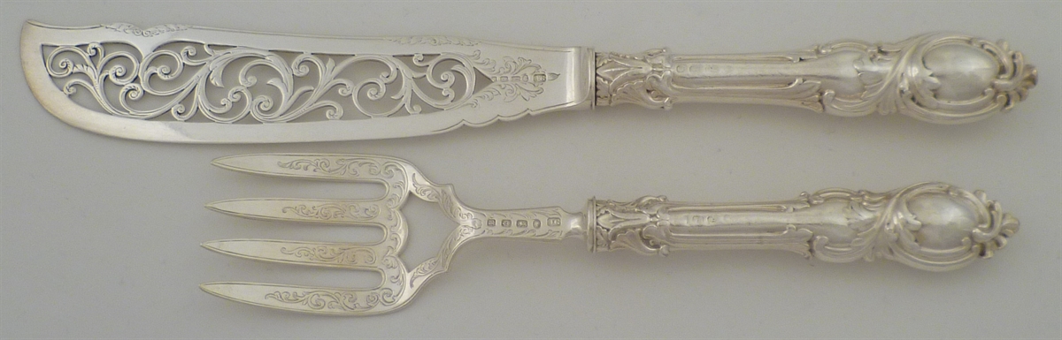 DESCRIPTION | Useful Victorian silver serving knife and fork with embossed, engraved and hand pierced decoration. Traditional pitch loaded handles so best not to clean in a dishwasher or very hot water. |