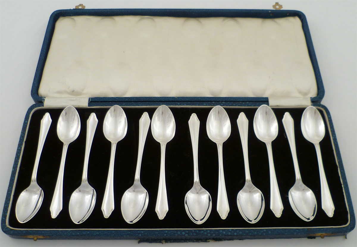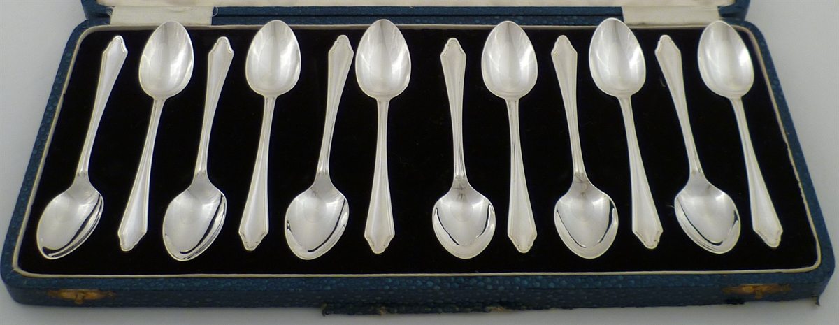 DESCRIPTION | Cased set of twelve Art Deco solid silver coffee spoons. |