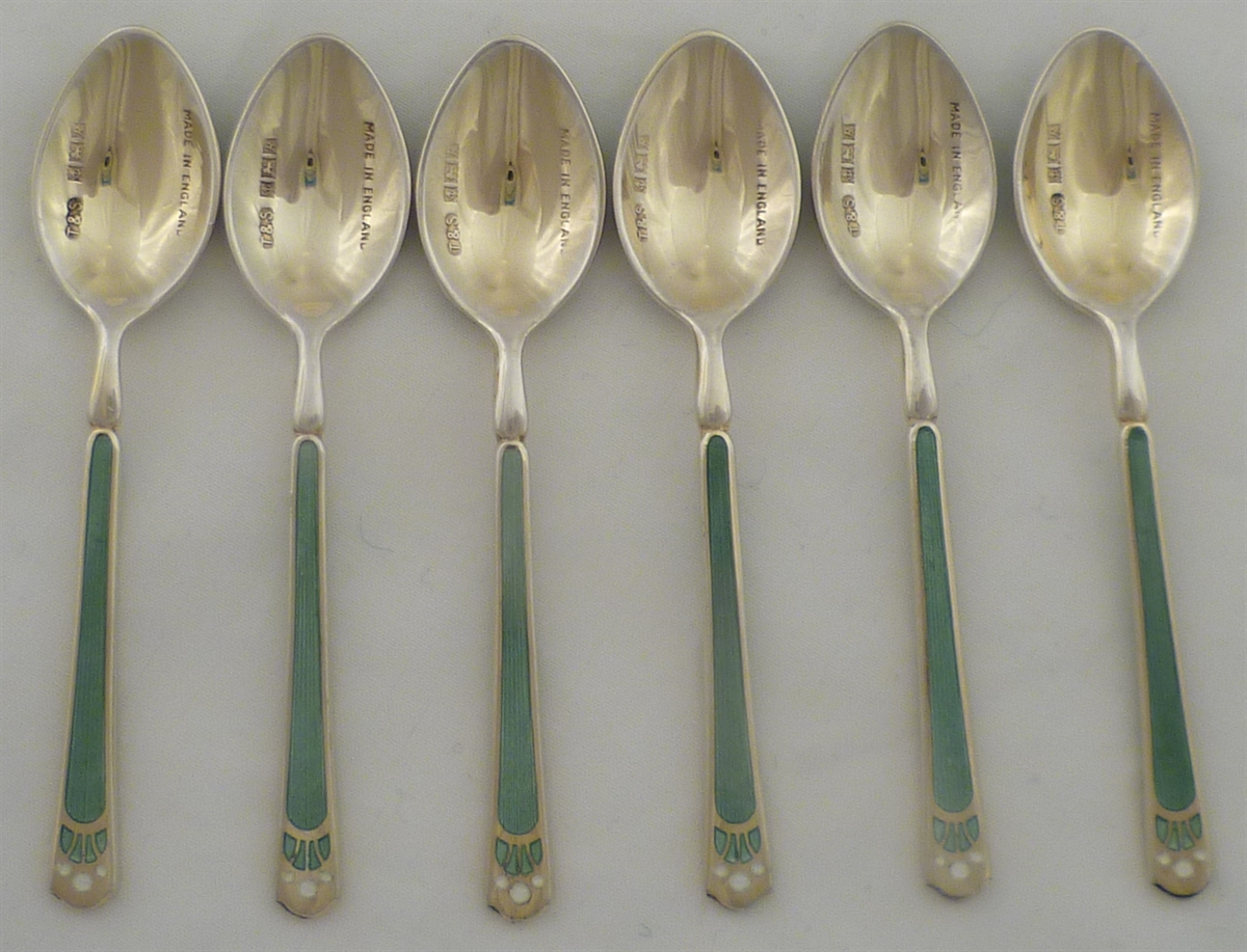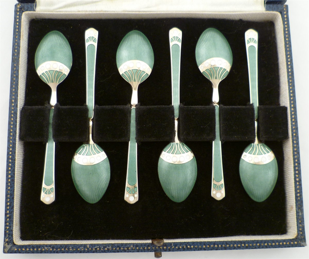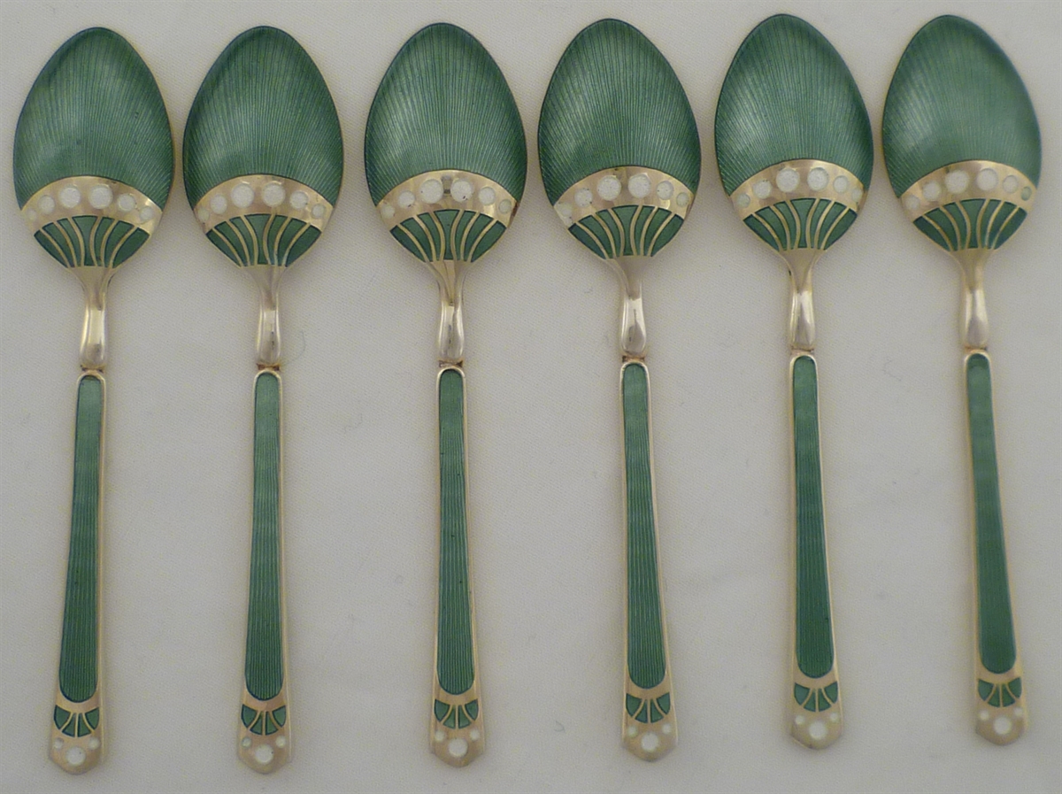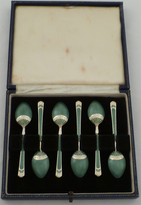 DESCRIPTION | Cased set of six very pretty jade green enamel decorated silver gilt coffee spoons. |