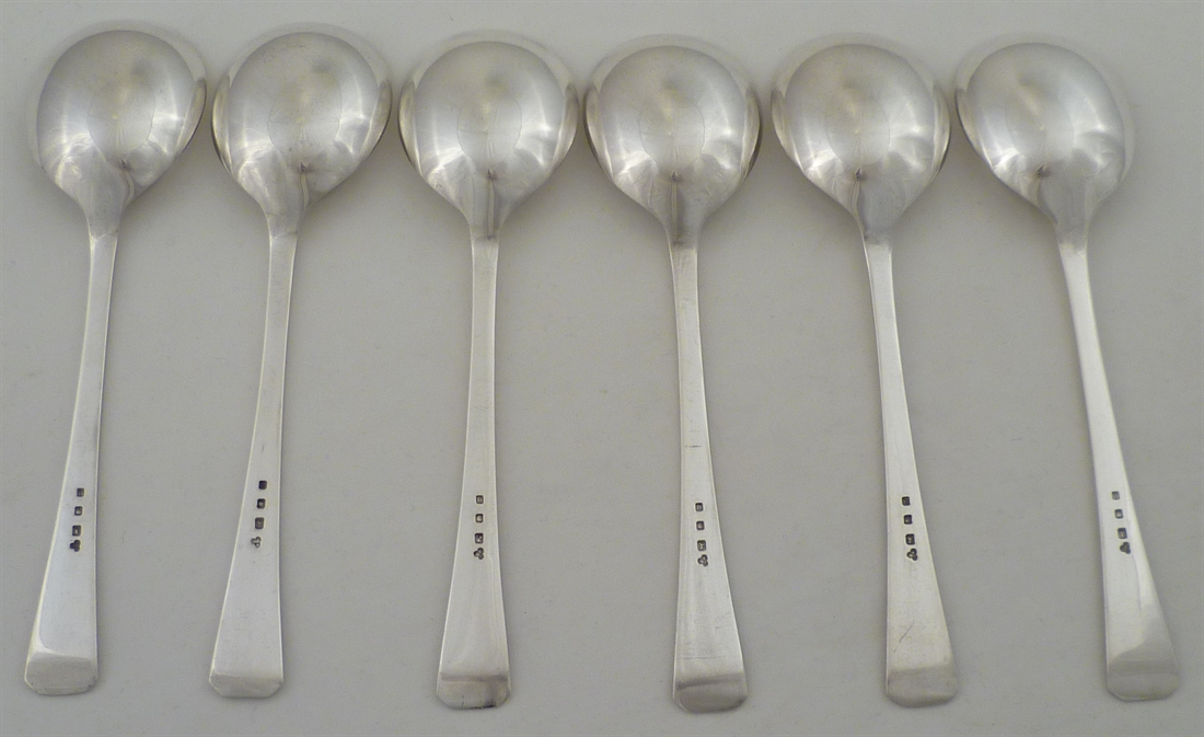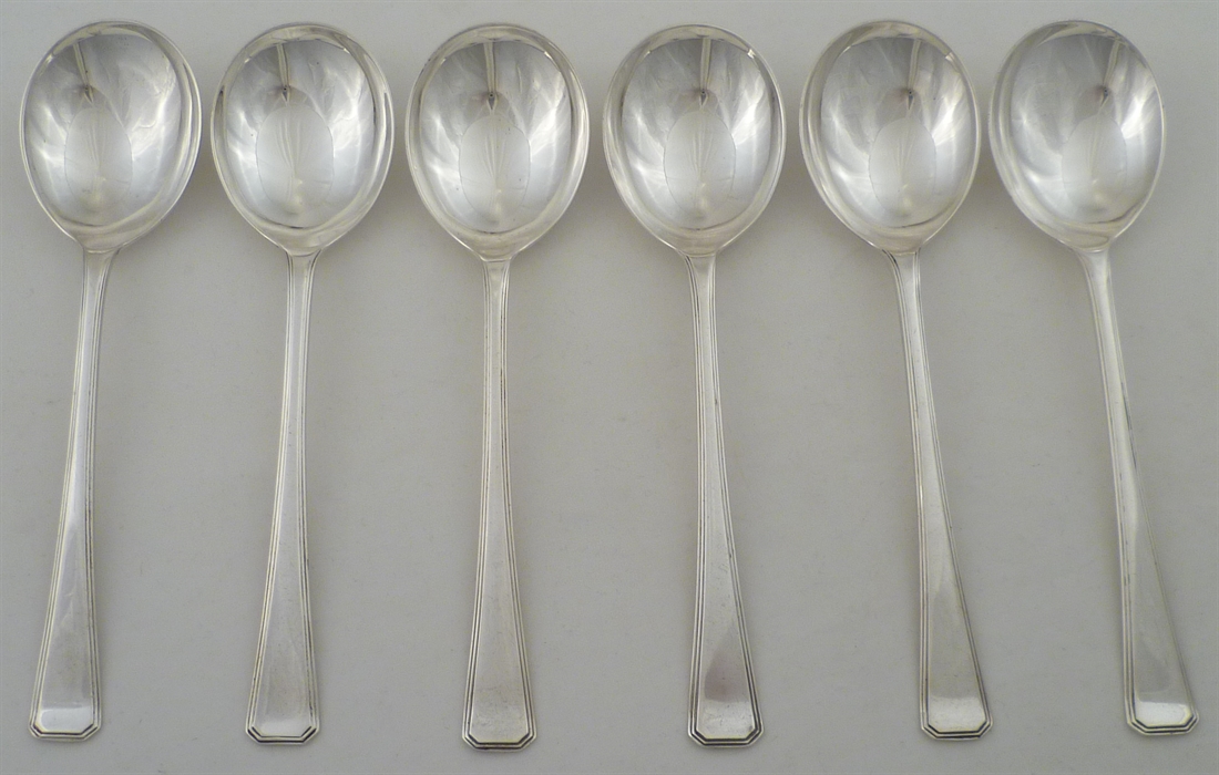 DESCRIPTION | Set of six solid silver Art Deco round bowled soup spoons with no engraving or erasure. |