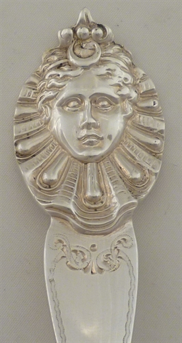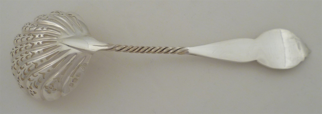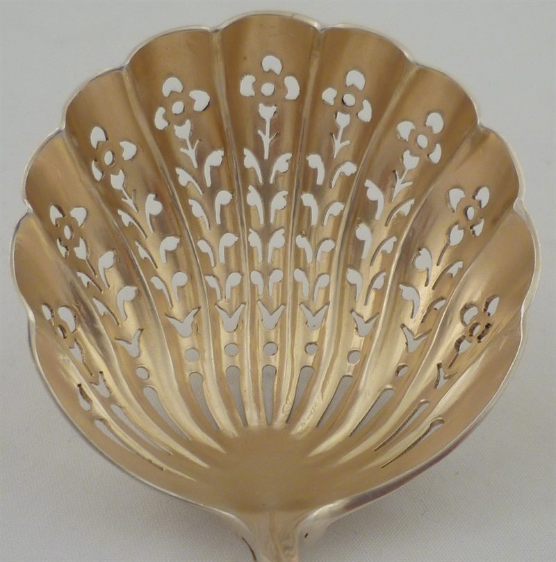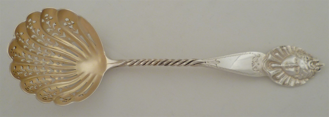 DESCRIPTION | Victorian solid silver sifter ladle with a gilded and pierced shell bowl, spiral twist and engraved stem and a female mask terminal. |