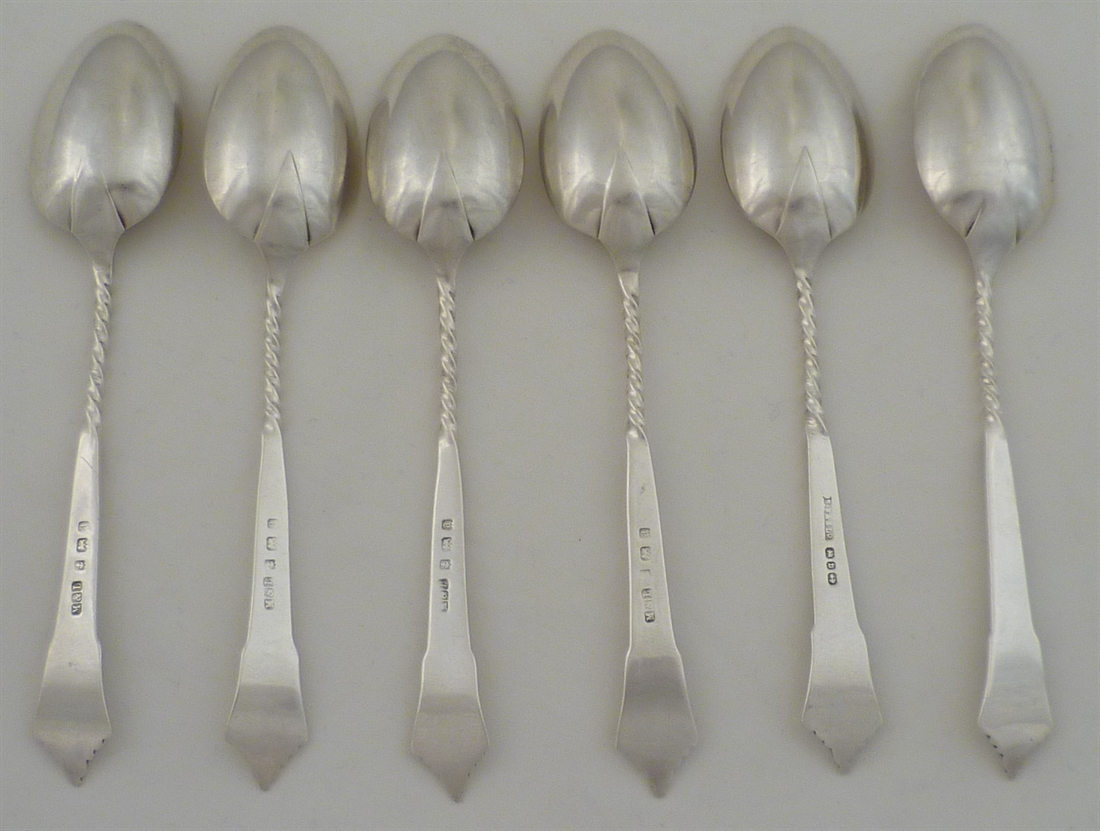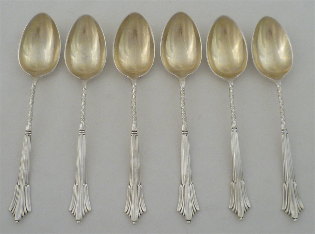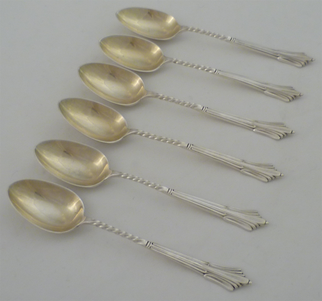 DESCRIPTION | Six Victorian solid sterling silver Albany pattern teaspoons with spiral twist stems and gilded bowls. |