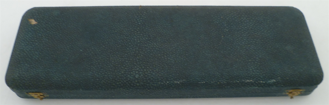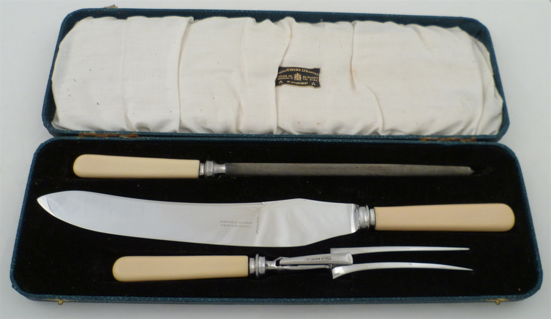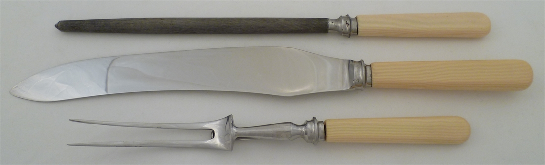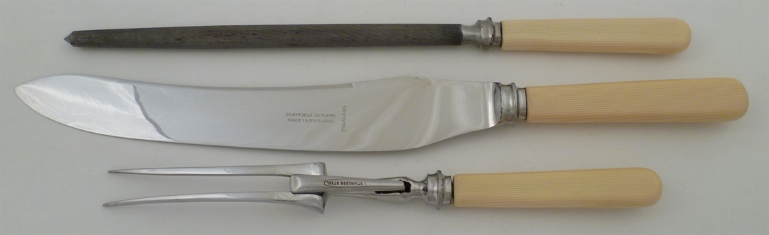 DESCRIPTION | Early 20th century cased three piece stainless steel carving set with simulated ivory handles. |