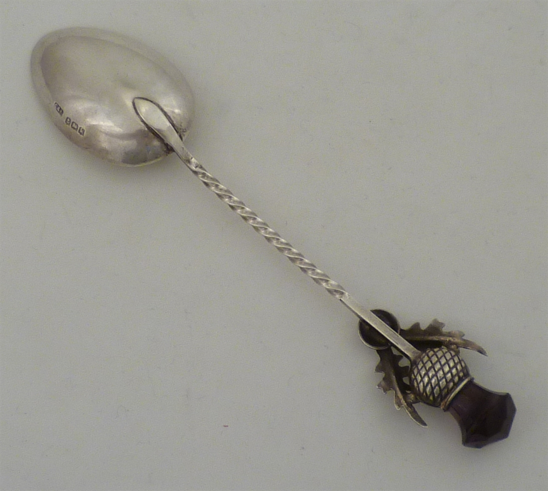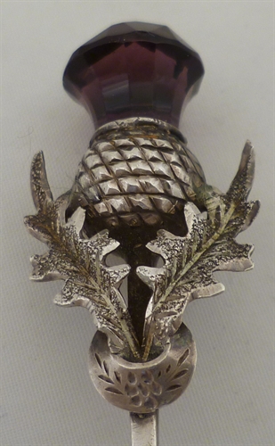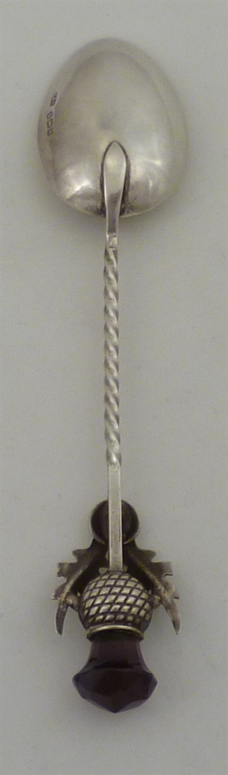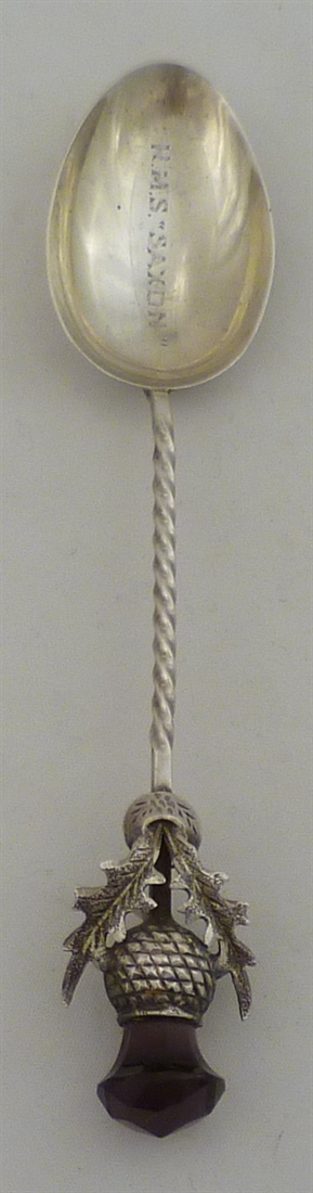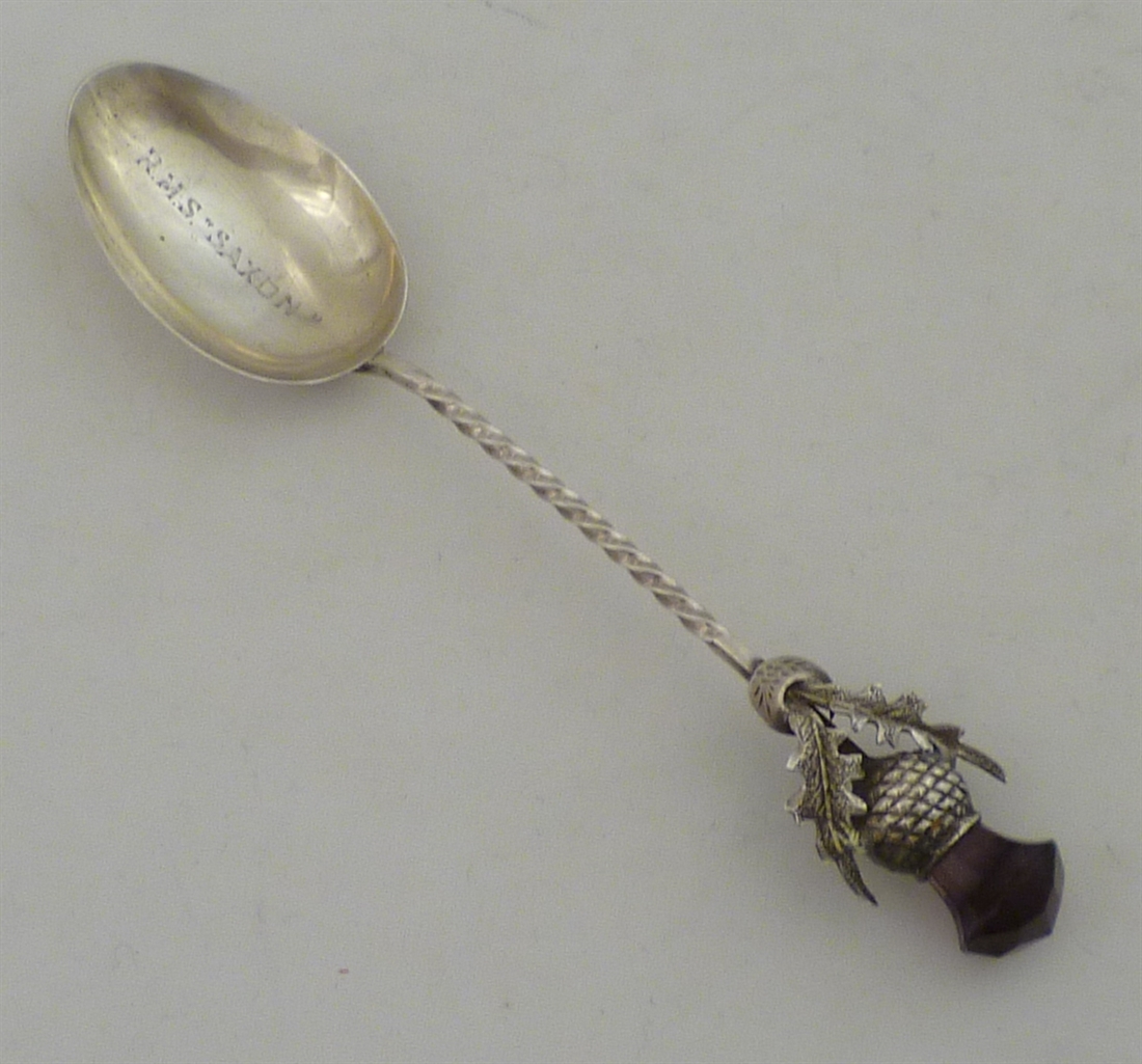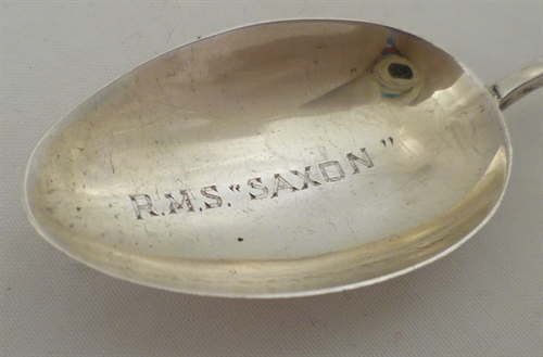 DESCRIPTION | Edwardian solid silver decorative spoon with a gilded bowl, spiral twist stem and thistle terminal. The bowl is inscribed R.M.S. "SAXON". Saxon was an early 20th century mail steamship. There is a lot about her on the internet. |