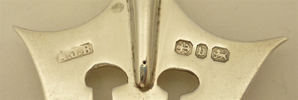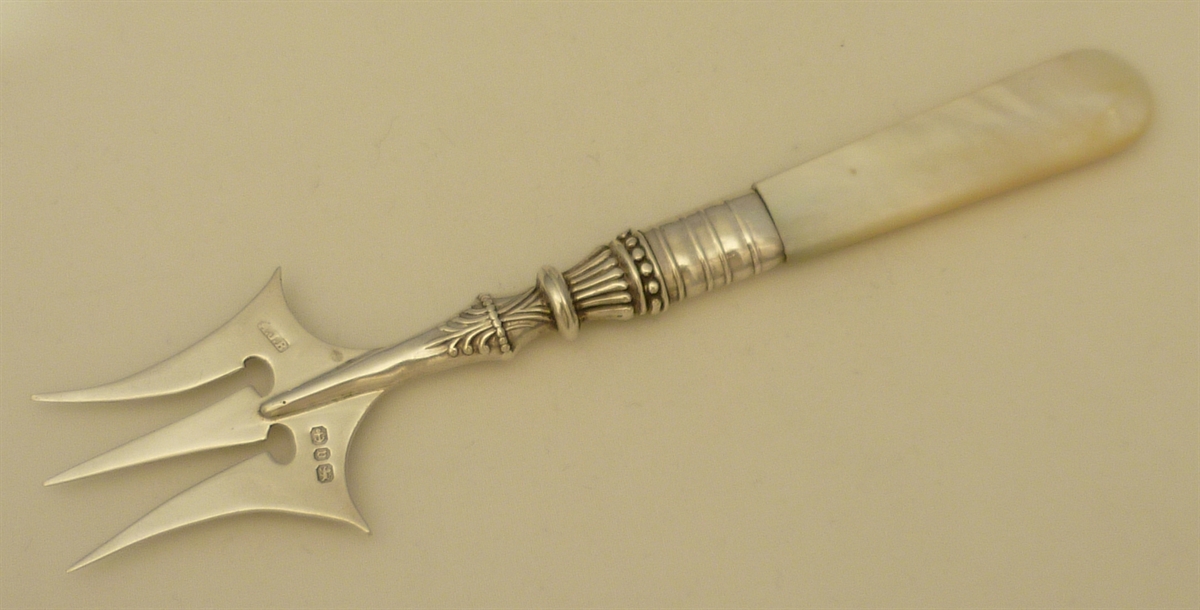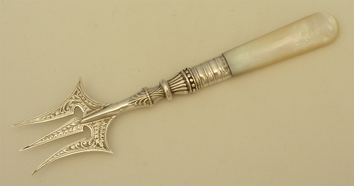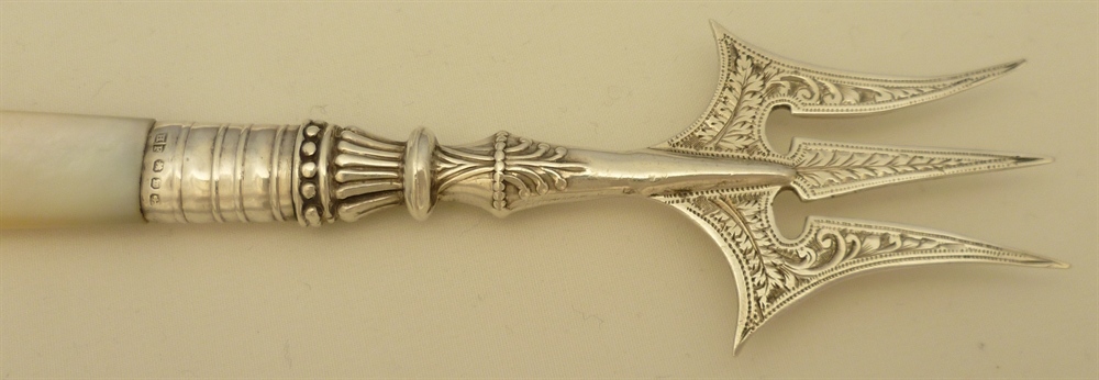 DESCRIPTION | Victorian sterling silver trident with engraved decoration and a mother of pearl handle. Probably initially sold as a bread fork for moving sliced bread or rolls around the dining table. This type of engraving looks especially good under candle light. The whole piece is an interesting snapshot of British manufacturing of the period. Several skilled craftsmen have been employed, most likely working from workshops all within 100 yards of each other. The silver metal was first beaten flat and then shaped with a tiny hand saw, the saw marks are still clear within the tines. Later it will go to be hand engraved. Meanwhile, H. Fowler, more known for his thimble manufacturing, has teamed up with the mother of pearl handle carver to make the fitted silver collar. We should give the blacksmith who made the central steel tang a mention and even the pitch blender who made the pitch that glues it all together. There is a tiny hole to the back of the stem that is part of the manufacturing process. The stem is hollow and the hole allowed air to escape when the tines and stem were heated and soldered together. You may notice that the tines have not been attached perfectly straight. This is typical of Birmingham manufacture of this period. |