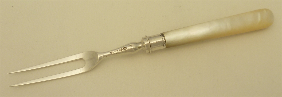 DESCRIPTION | Victorian solid sterling silver two tine serving fork with a mother of pearl handle. We find these excellent for sliced meats, tomatoes, cucumbers etc. |